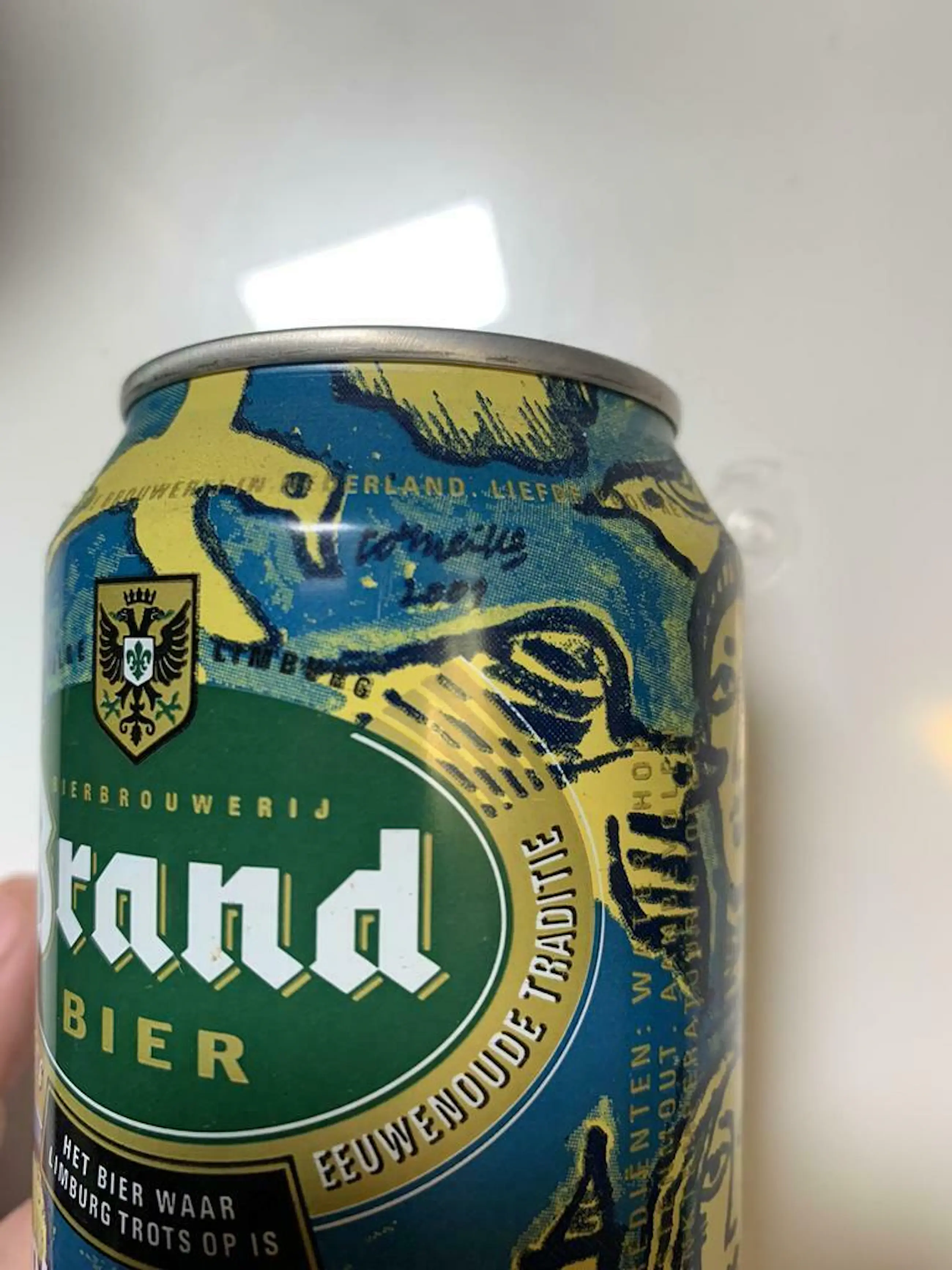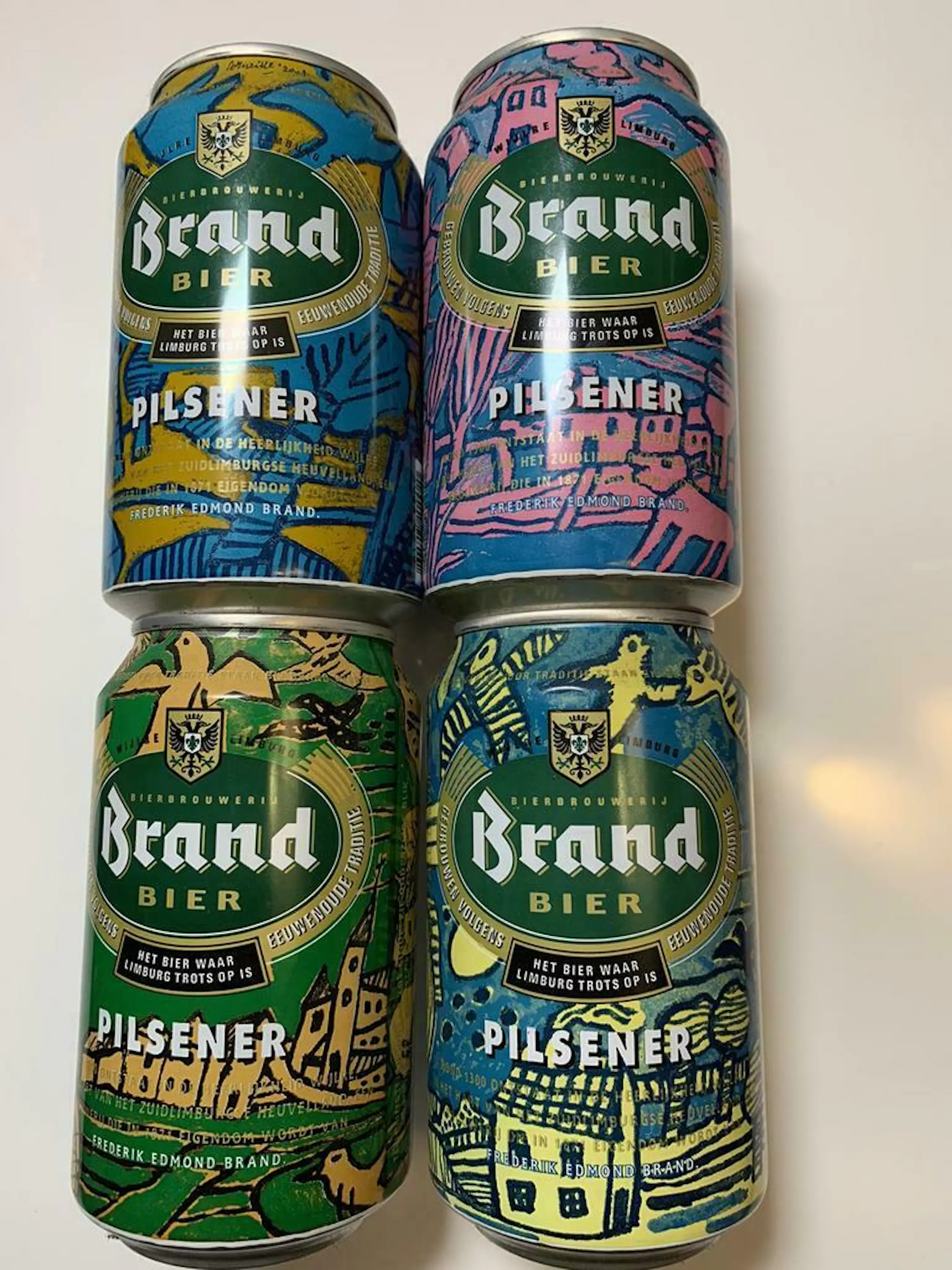 4 blikjes brand bier met illustraties van Corneille . ( blikjes zijn vol , maar het bier is niet meer drinkbaar )
