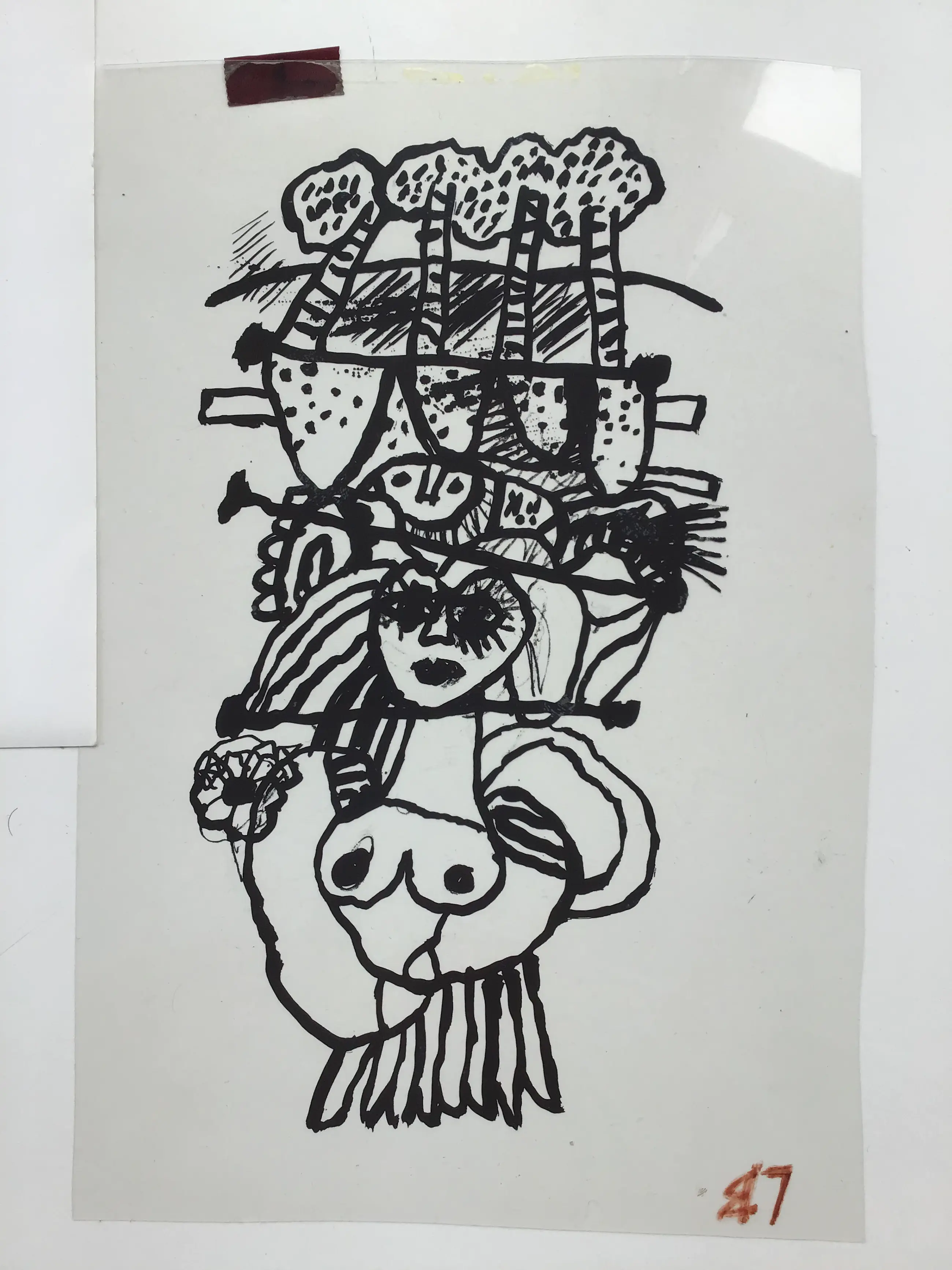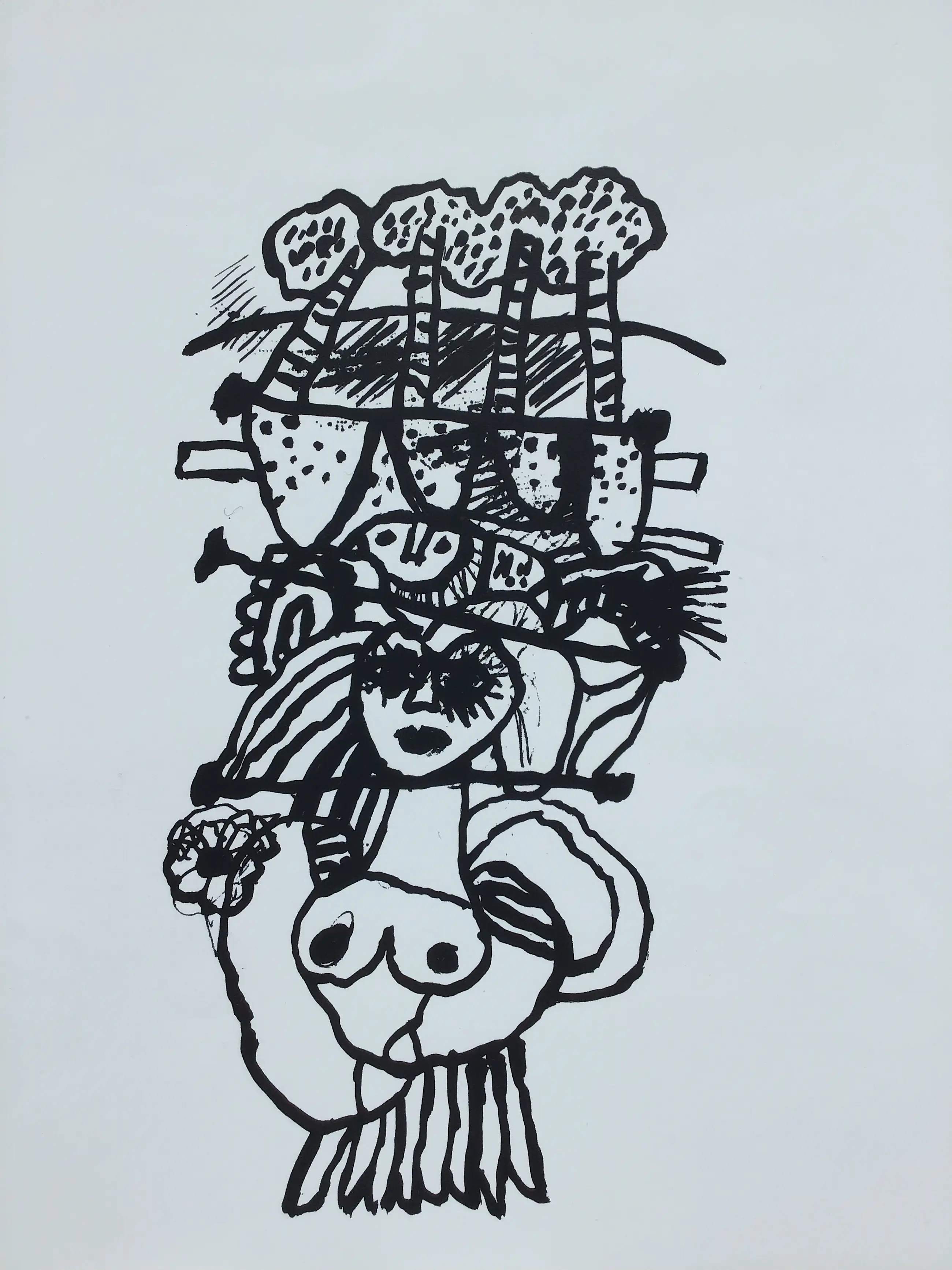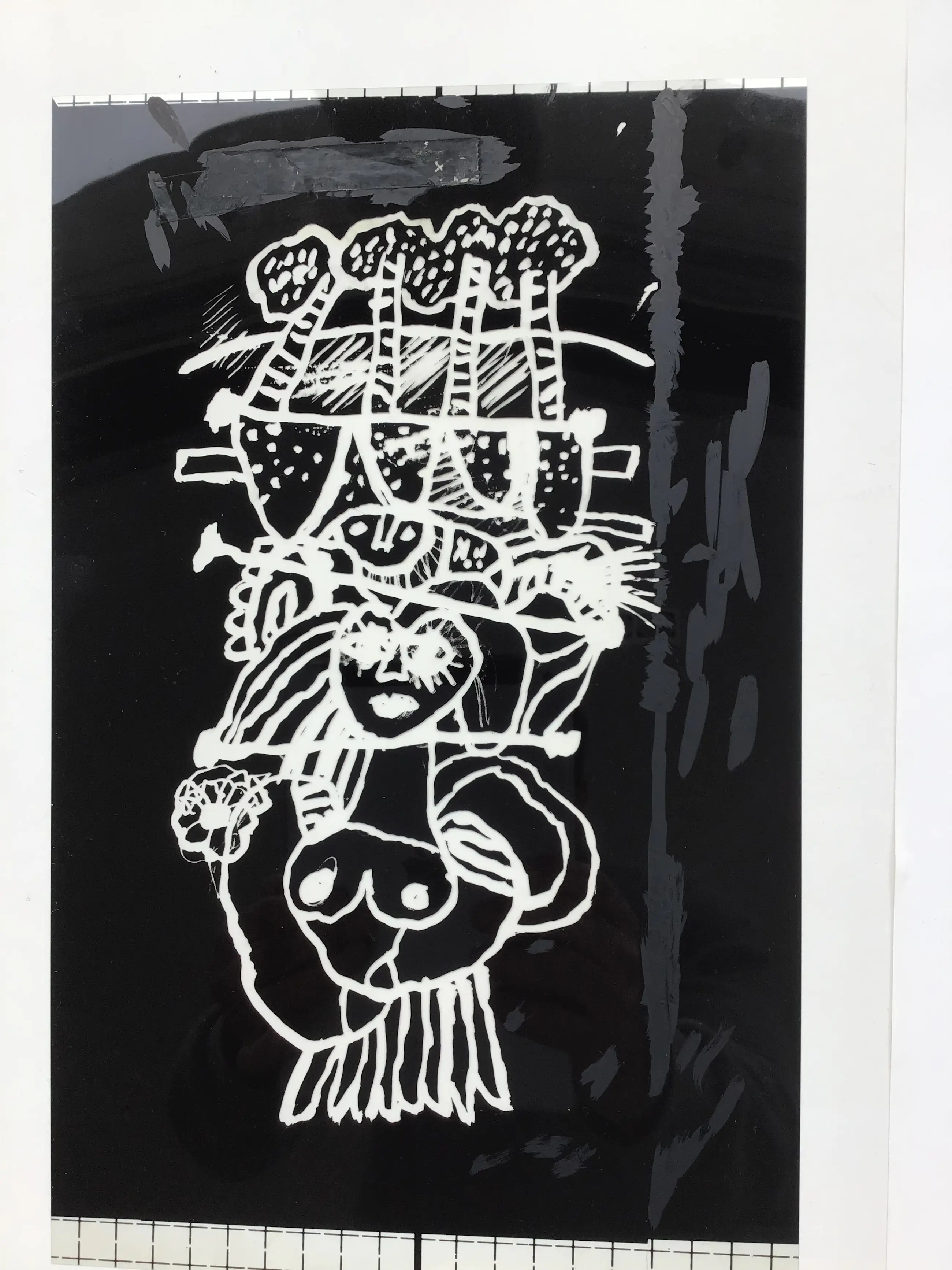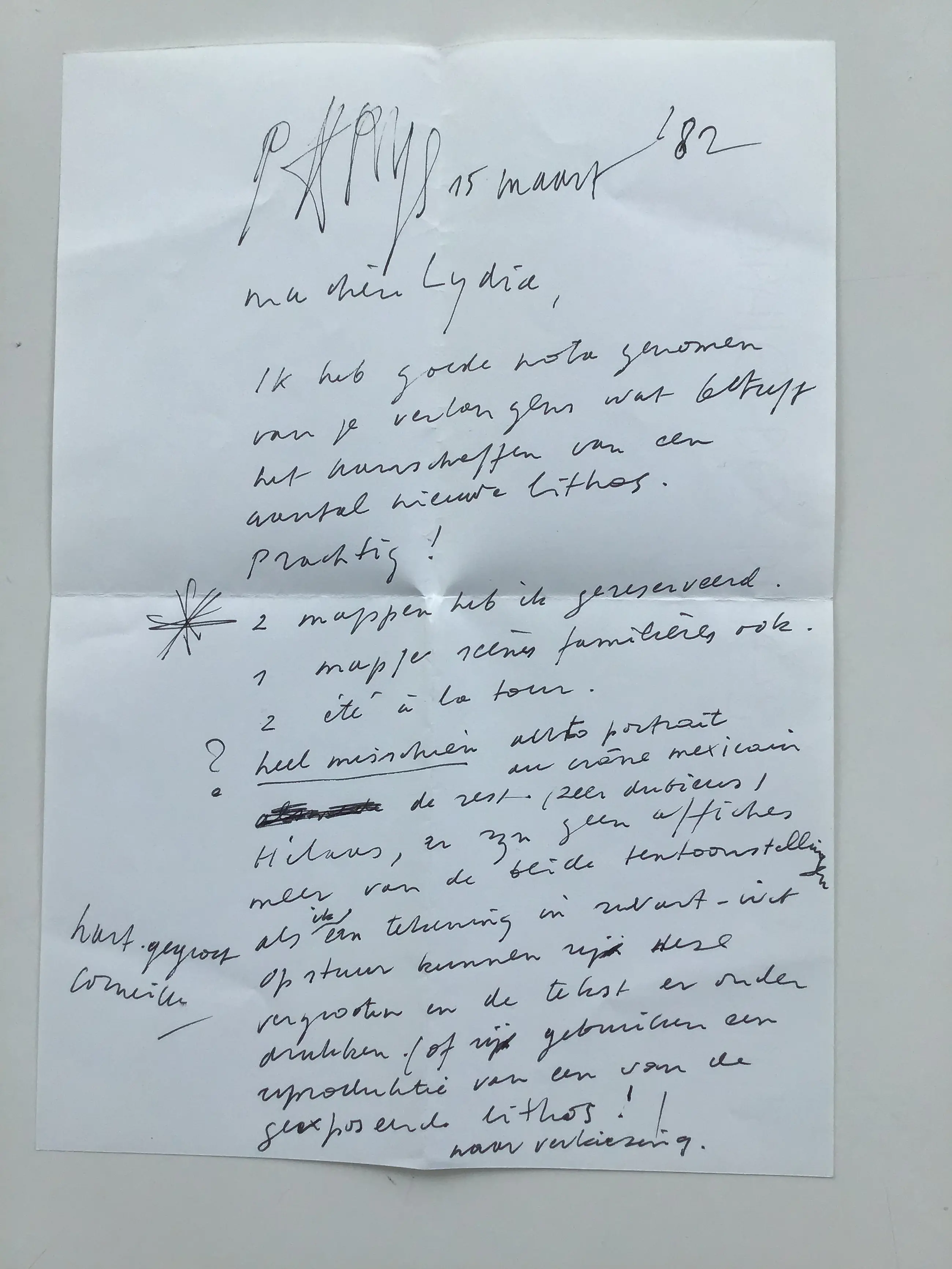 1 Zeefdruk 2 Proefdruk op doorzicht plastic 3 Proefdruk in zwart op doorzichtig plastic 4 Handgeschreven brief, gesigneerd door Corneille