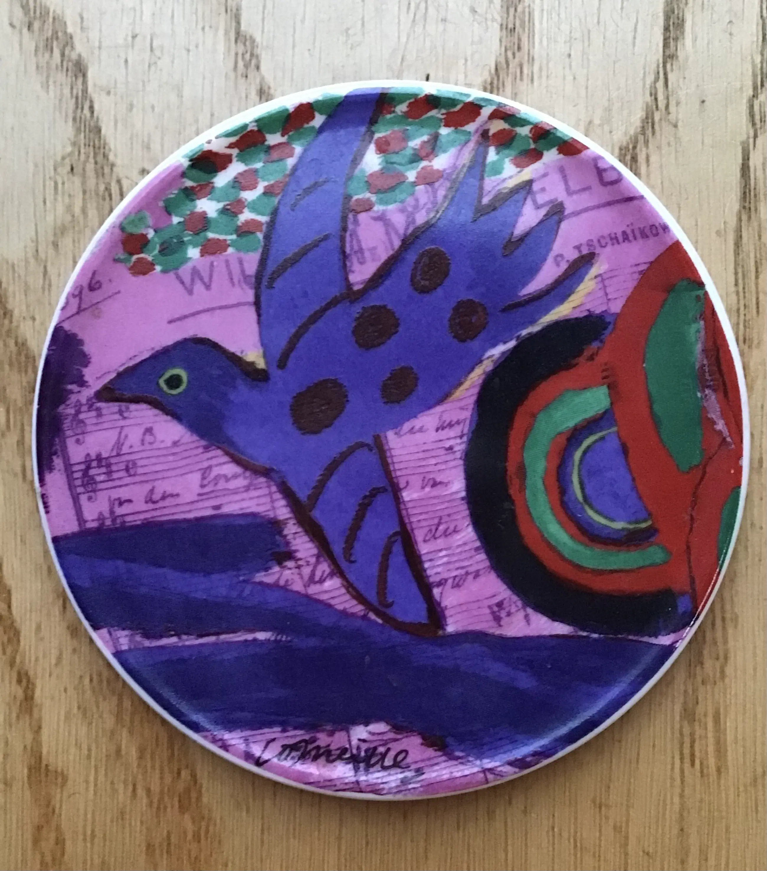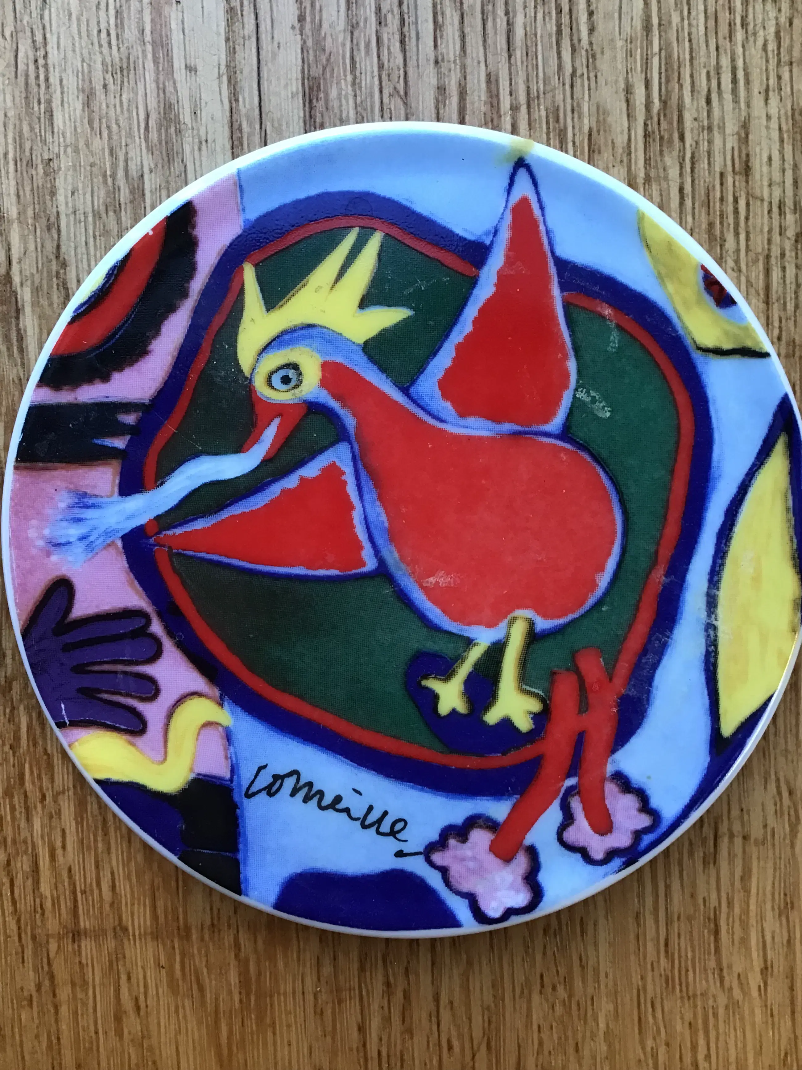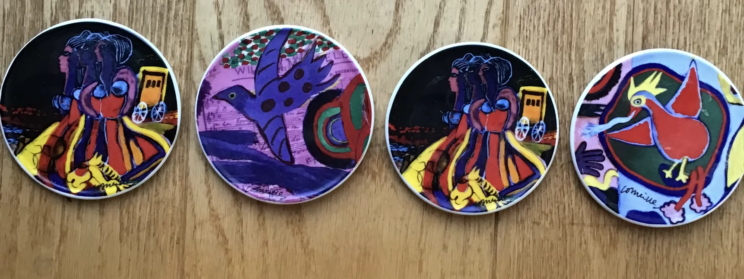 4 onderzetters keramiek van Corneille, Gesigneerd in de druk Doorsnee 10,5 cm Onderkant voorzien van rubber laagje Conditie uitstekend