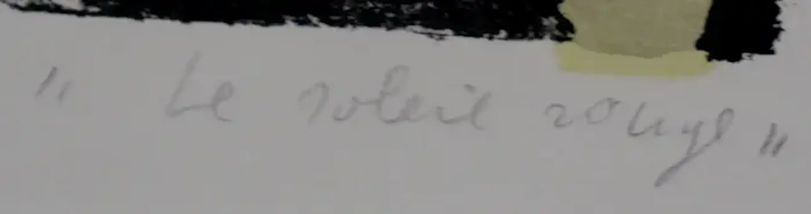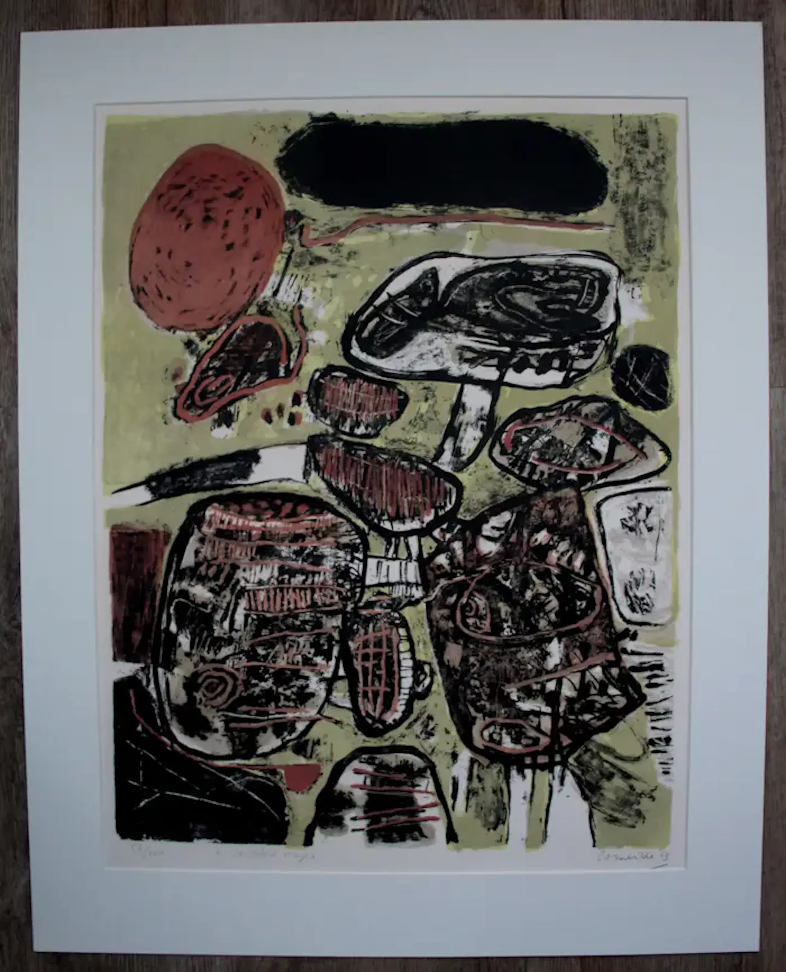 Kleurenlitho van Corneille. Titel: Le soleil rouge. Jaar: 1963. Oplage: 56/200. Afmetingen incl passe-partout: H83 x b66cm. Afmetingen voorstelling: H65 x b50cm. Het werk is, rechts onderaan, door de kunstenaar gesigneerd met potlood. De authenticiteit van het, aangeboden, werk wordt volledig gegarandeerd. Een certificaat van echtheid kan, op aanvraag, worden gemaild.