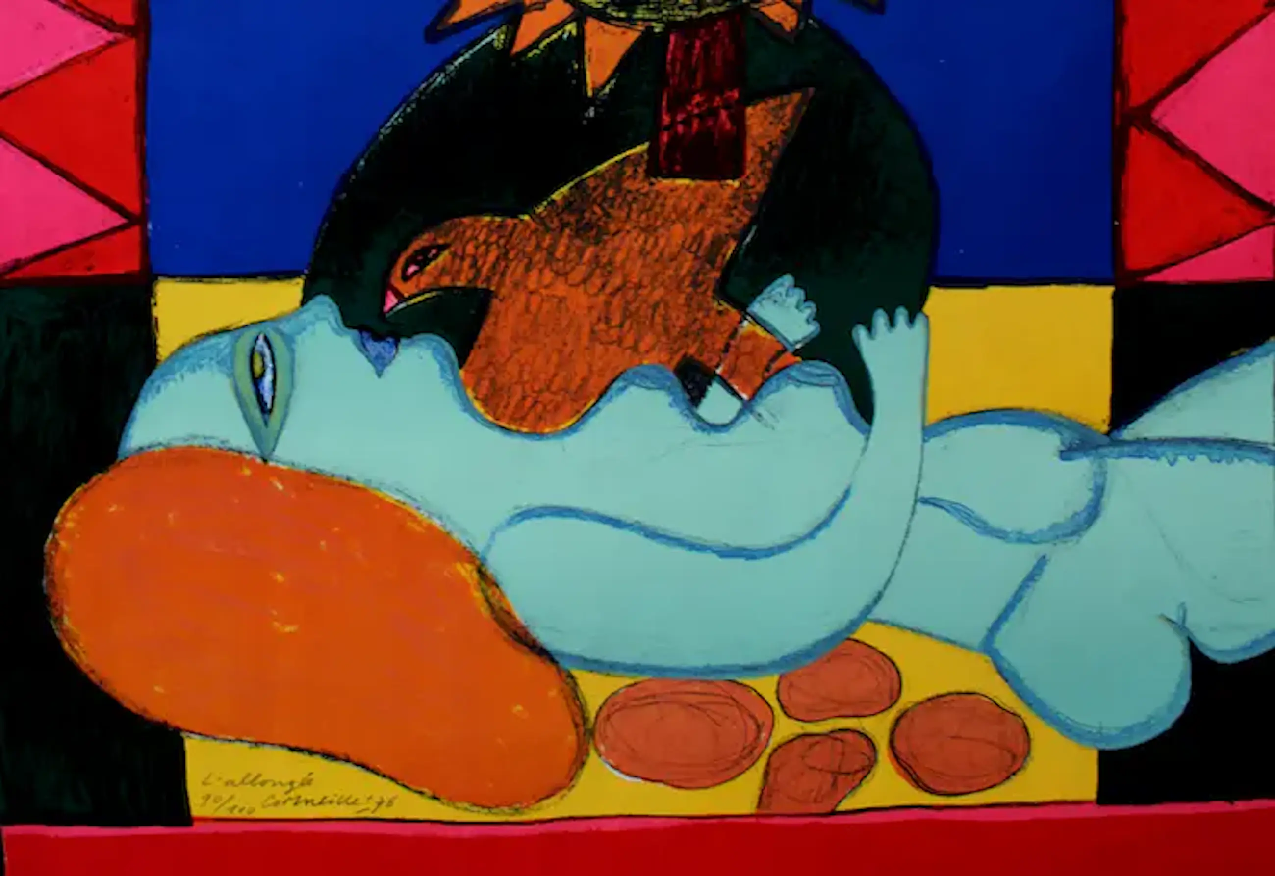 Kleuren litho van Corneille. Titel: L'allongée(langwerpig). Jaar: 1976. Oplage: 90/100. Afmetingen op karton: H76 x b57cm. Afmetingen voorstelling: H70 x b50cm. Het werk is links onderaan gesigneerd door de kunstenaar. Het werk zit op een zwart "passe-partout/ achtergrond " bevestigt en kan ook zo ingelijst worden. De authenticiteit van het aangeboden werk wordt volledig gegarandeerd. Een certificaat van echtheid kan, op aanvraag, worden gemaild.