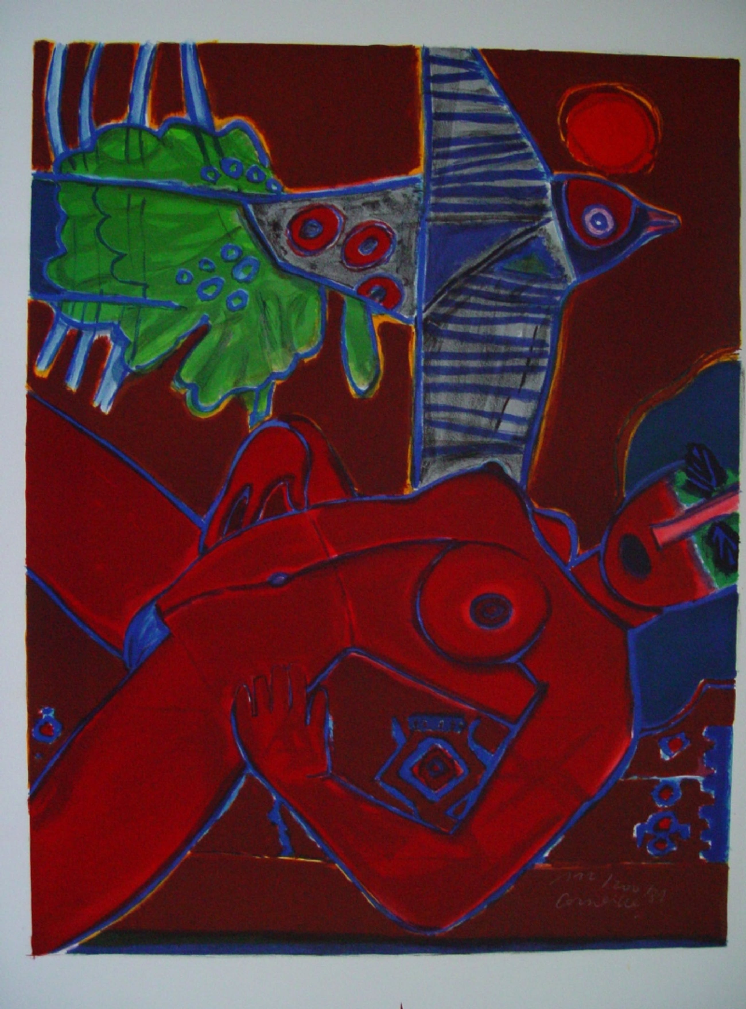 Zeer fraaie kleurenzeefdruk van Corneille uit 1981. Afmeting blad 56x76 cm in perfecte staat. Handgesigneerd en genummerd oplage 200ex. het nummer kan afwijken van de foto.