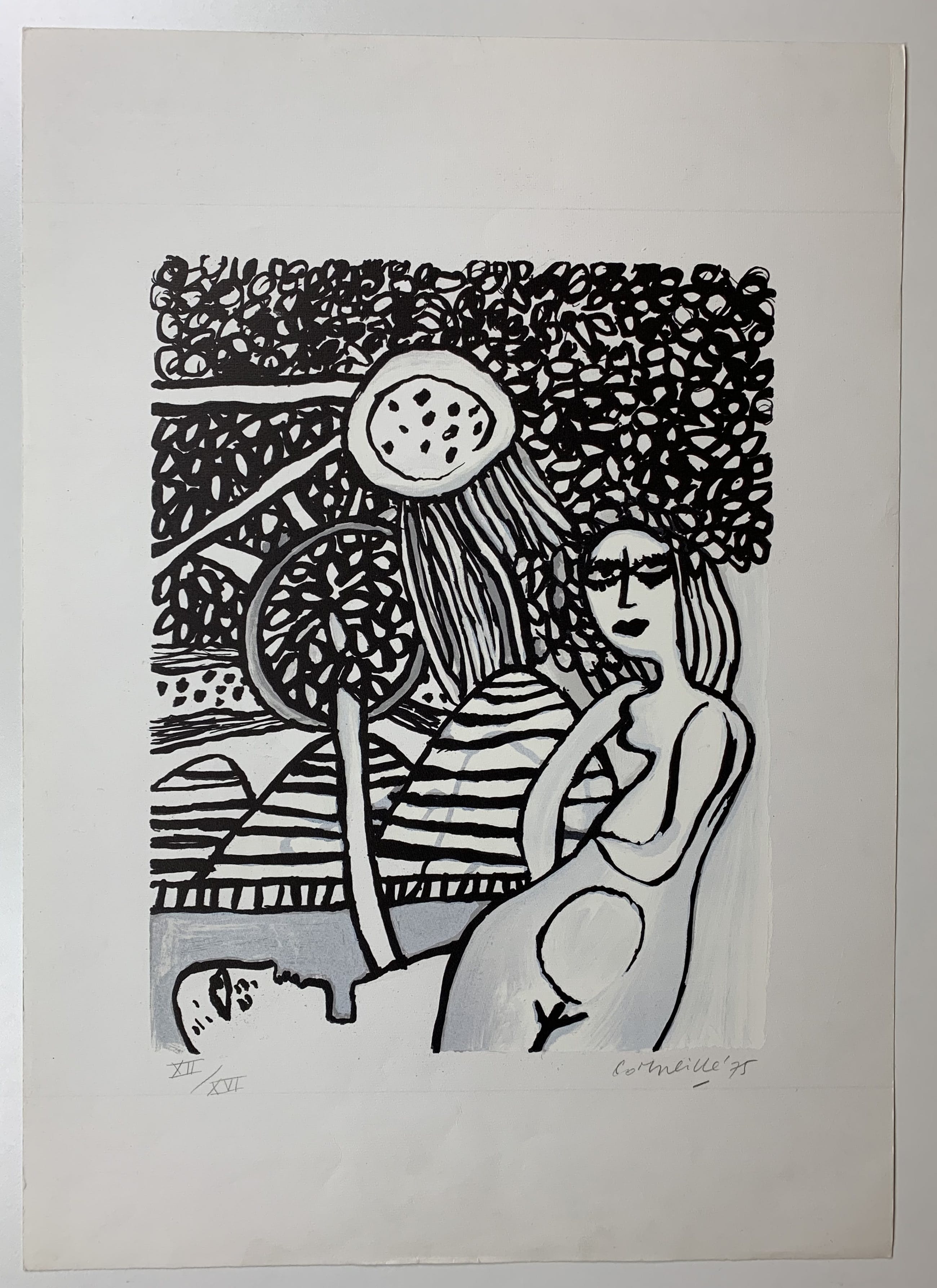 Mooi werk van de hand van Corneille. Onderdeel van de serie 'Journal de la tour' uit 1975, die uitvoerig beschreven en gedocumenteerd staat in de Donkersloot, pagina's 283-294.