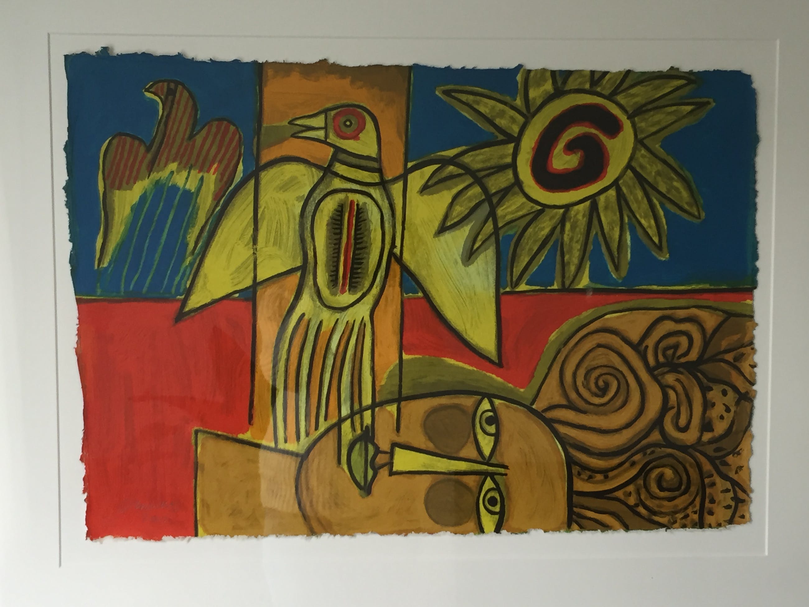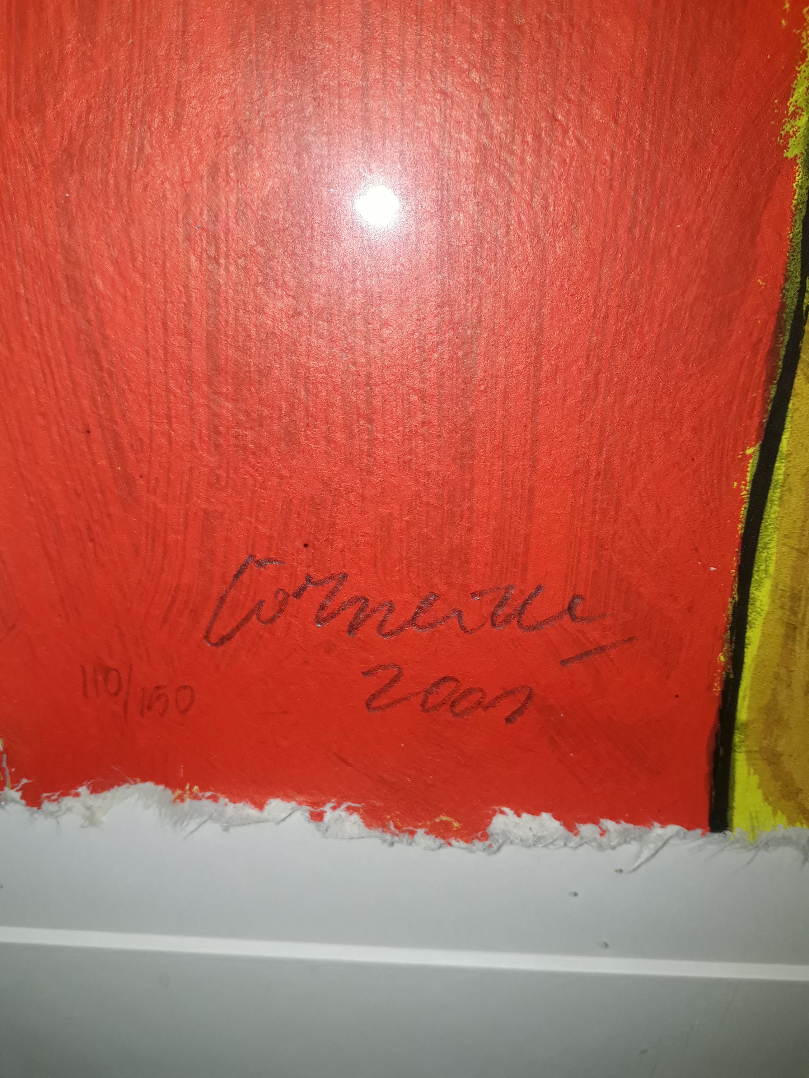 Dit werk wordt weinig aangeboden: een prachtige zeefdruk van Corneille. Geproduceerd op erg fijn en fraai handgeschept papier. De drukgangen lopen tot aan de scheprand, waardoor een gerafelde kant ontstaat. Ingelijst in een fraaie zilverkleurige handgemaakte lijst.