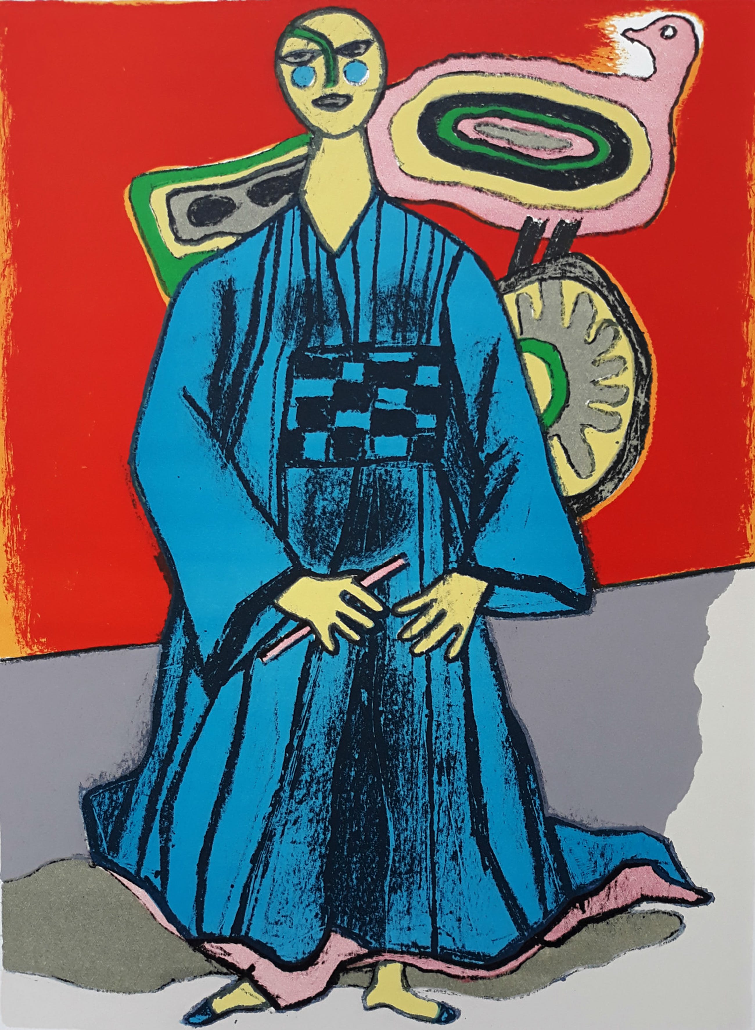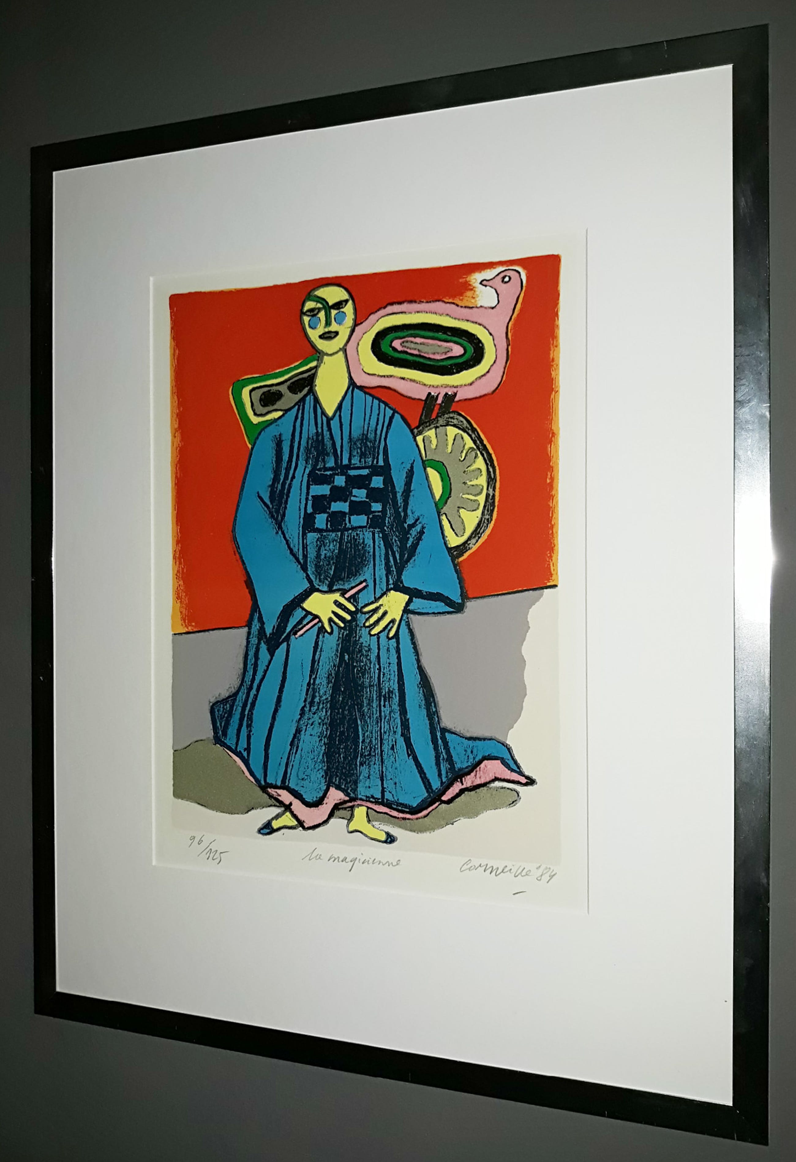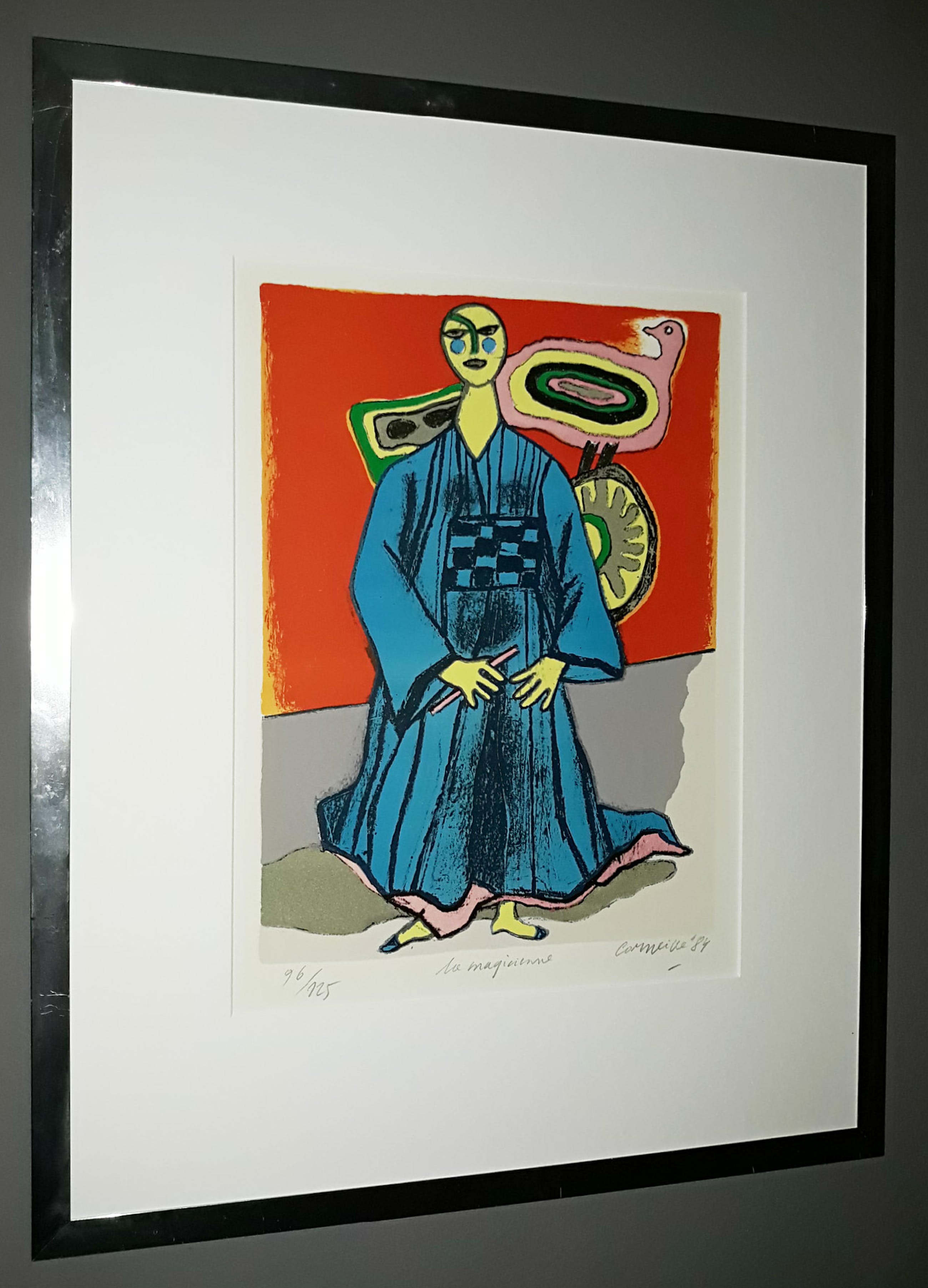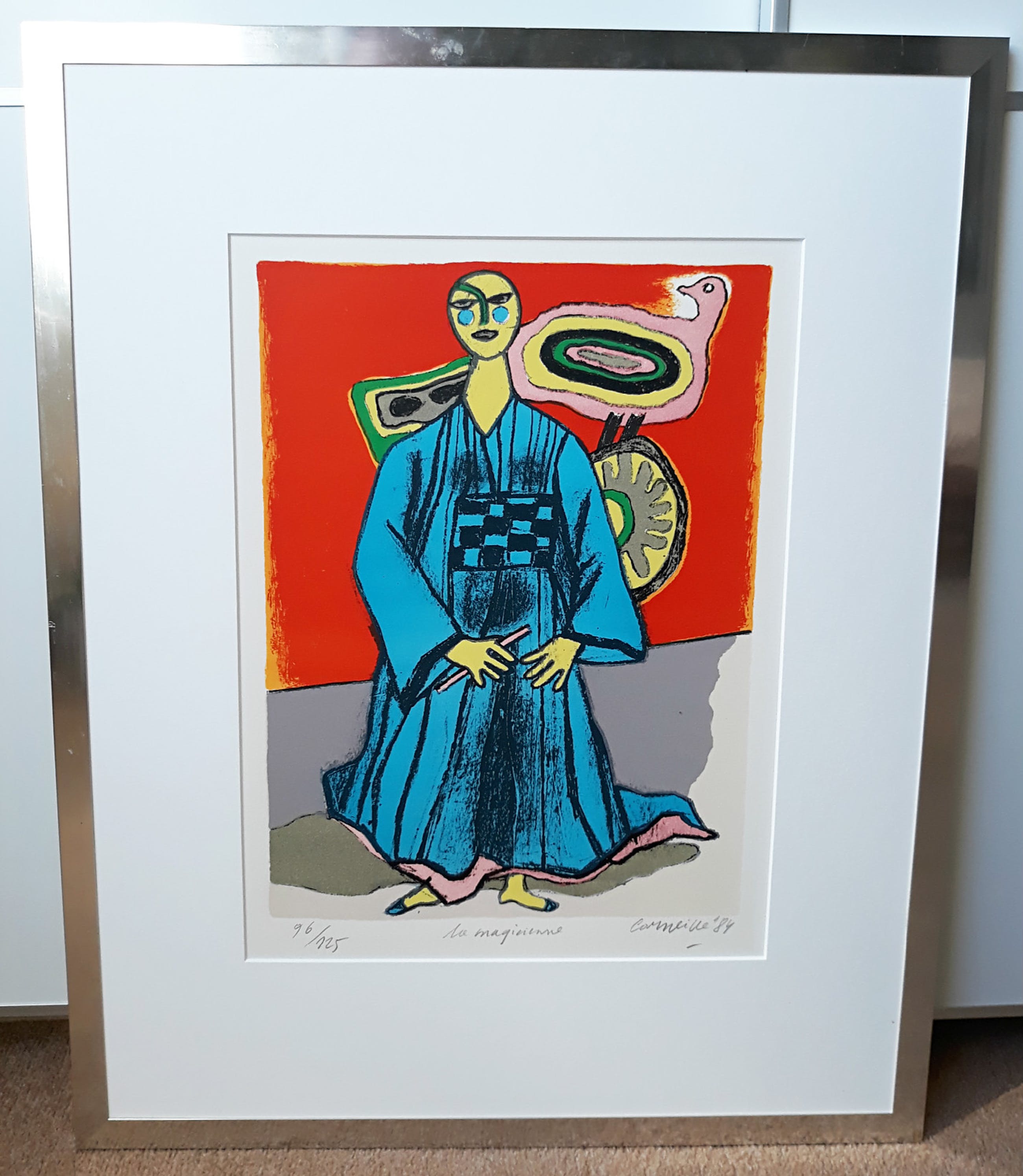 Karakteristiek, bekend werk uit de uitgave “Memoire du Japon”, een serie die Corneille maakte na zijn reis door Japan. Litho op geschept papier, met potlood gesigneerd, gedateerd (‘84), getiteld en genummerd (96/125). In strakke metalen lijst, achter glas en met smetteloos, zuurvrij passe-partout. In zeer goede conditie.
