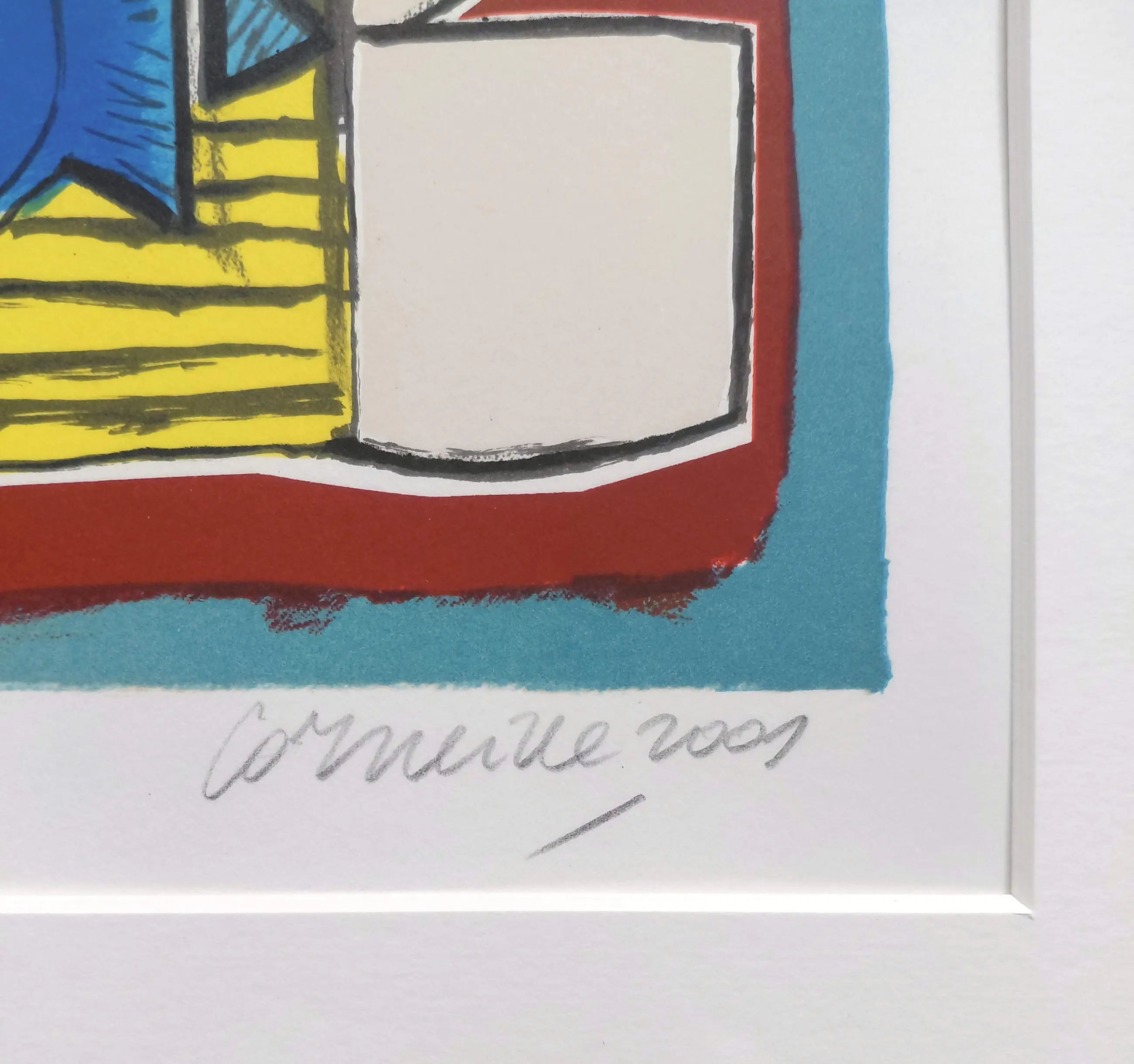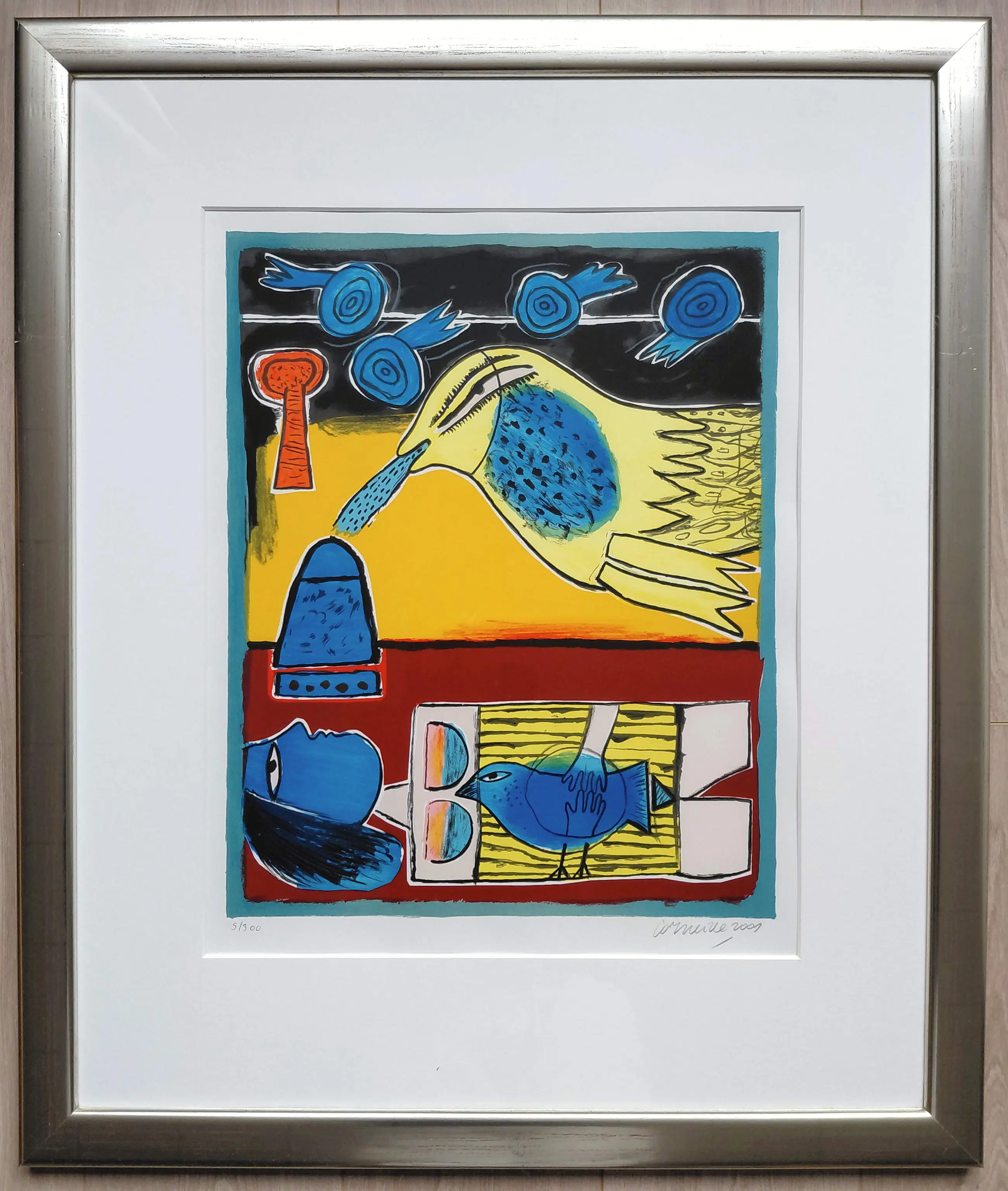 Zeer mooi, kleurrijk werk van Corneille. Zeefdruk op geschept papier, met potlood gesigneerd, gedateerd (2001) en genummerd (5/300). Zeer mooi ingelijst, achter glas en met smetteloos, zuurvrij passe-partout. Het geheel in zeer goede conditie. Herkomst: Holland Art Gallery, De Bijenkorf.