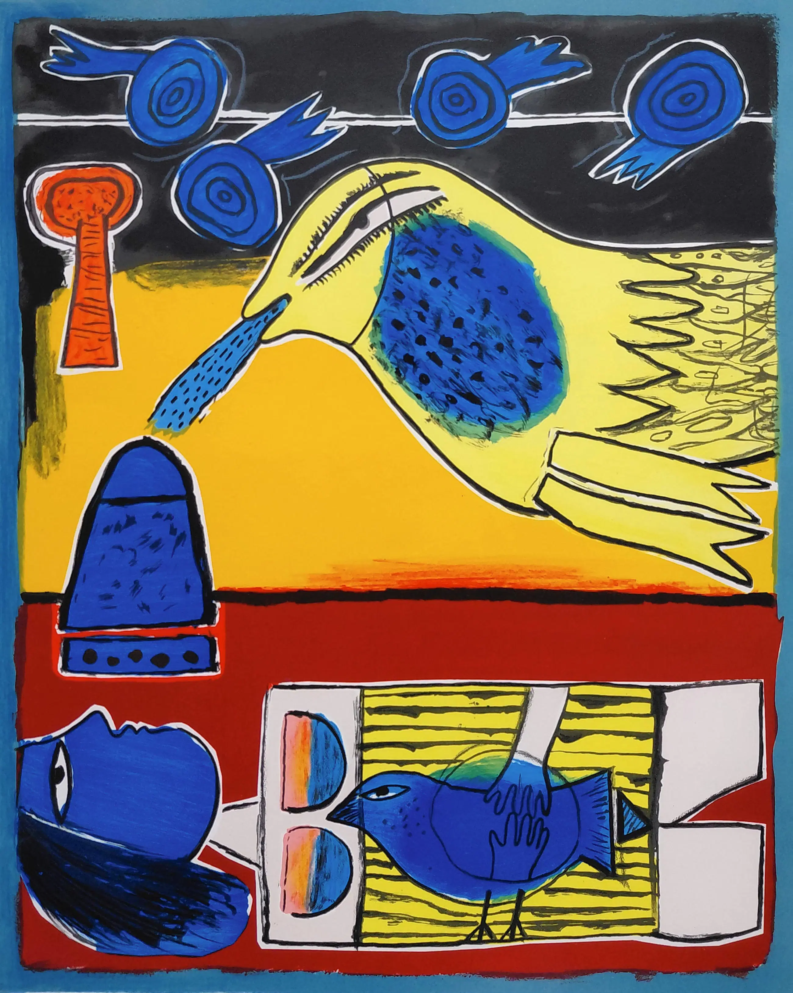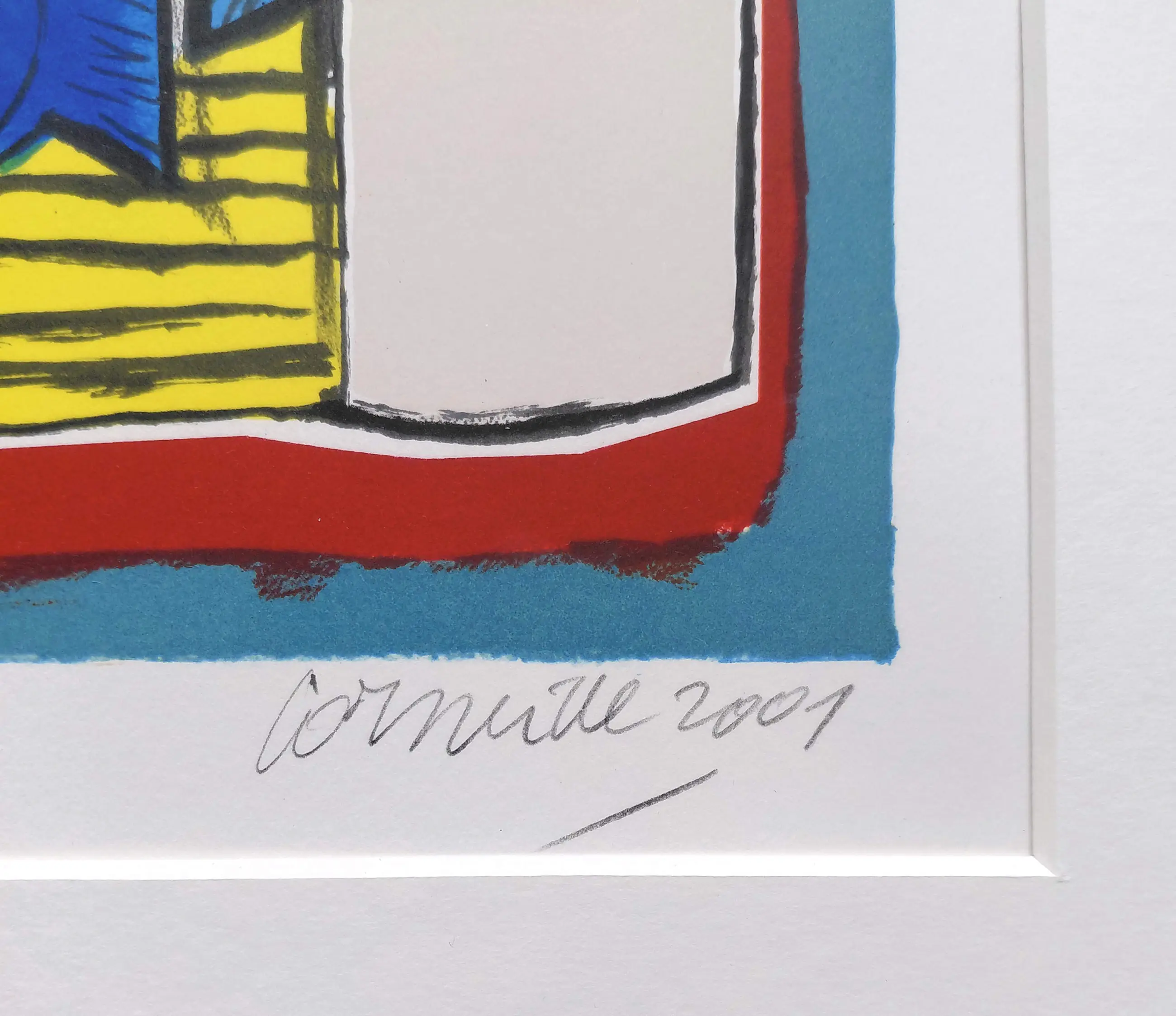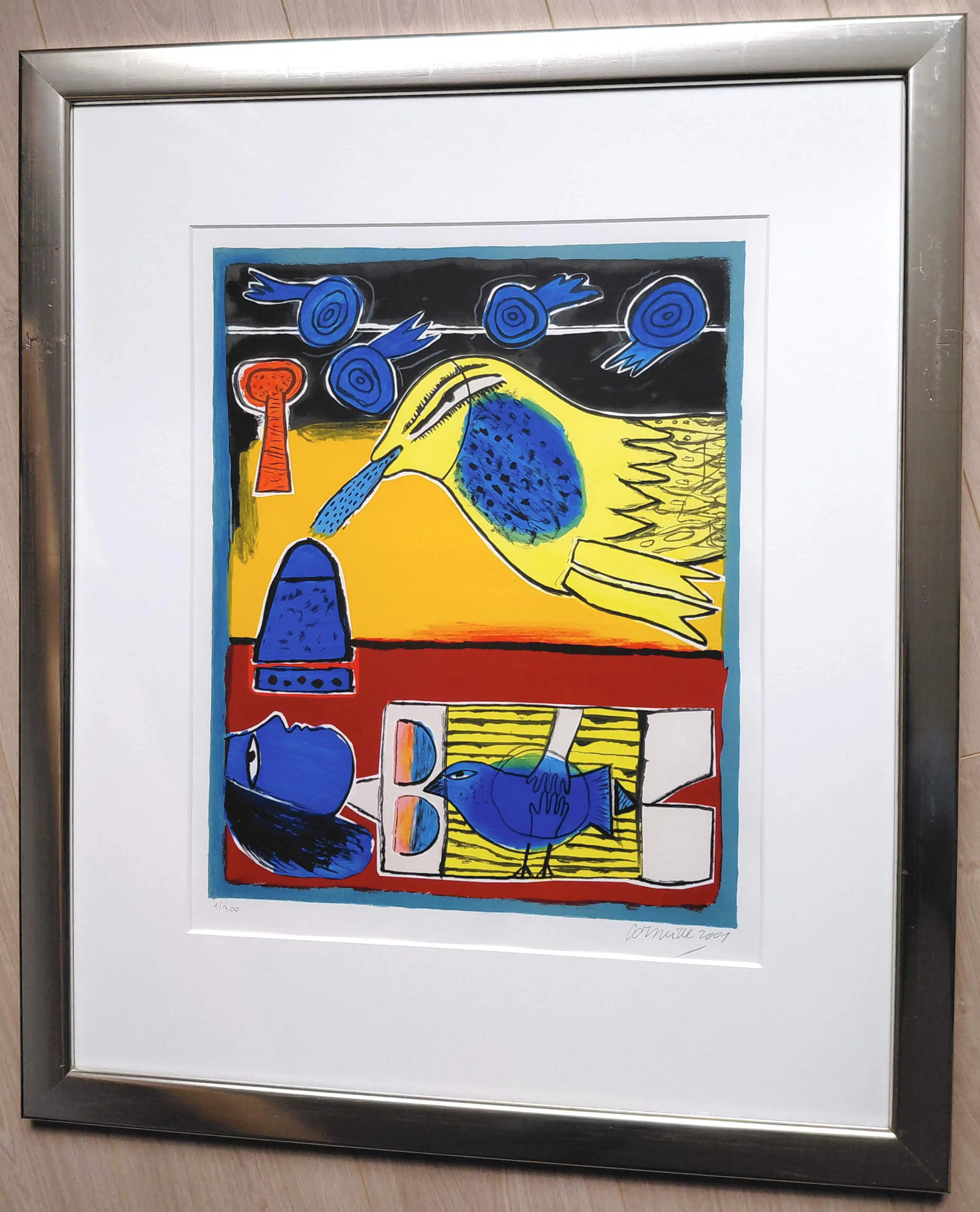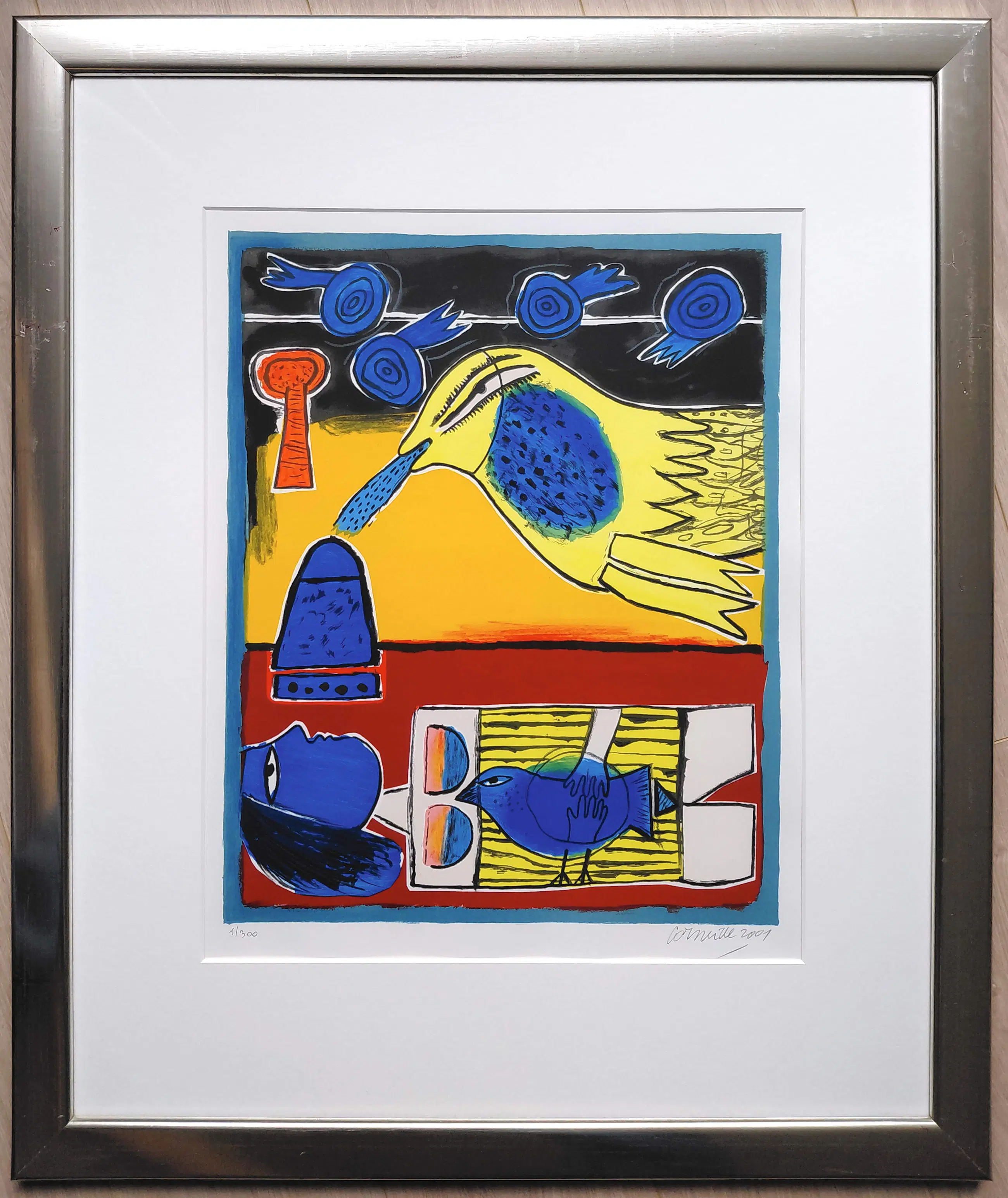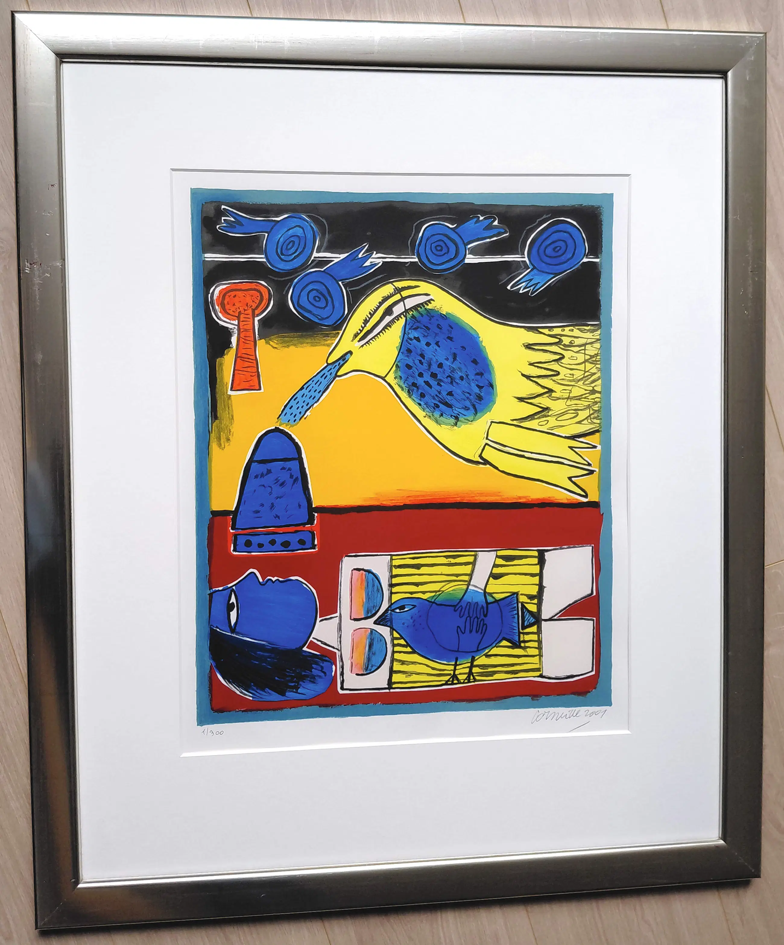 Zeer mooi, kleurrijk werk van Corneille. Zeefdruk op geschept papier, met potlood gesigneerd, gedateerd (2001) en genummerd (1/300). Zeer mooi ingelijst, achter glas en met smetteloos, zuurvrij passe-partout. Het geheel in goede conditie. Herkomst: Holland Art Gallery, De Bijenkorf.