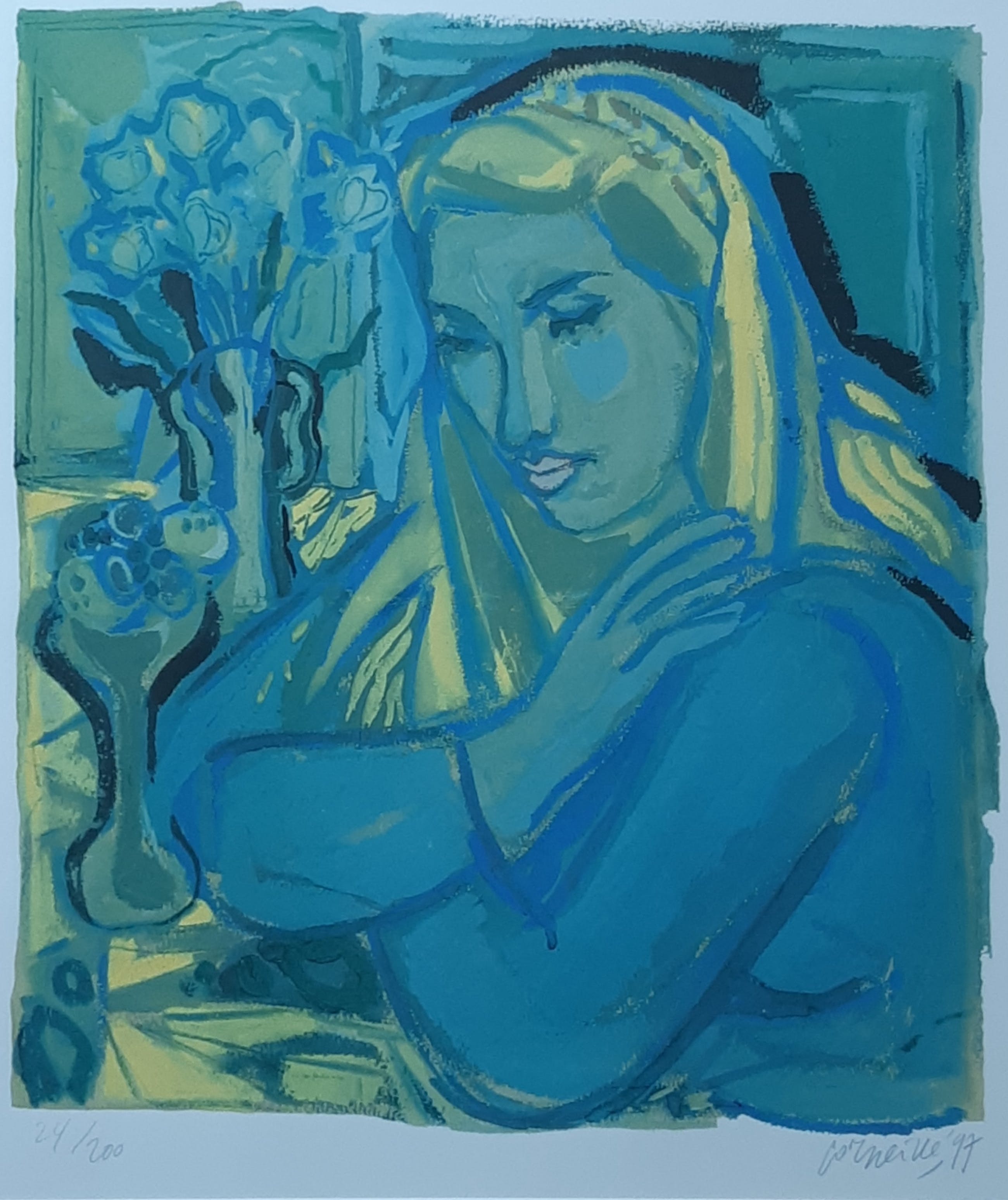 Werkelijk fenomenaal ingelijst werk van de CoBrA-kunstenaar van het eerste uur Corneille. Dit is een prachtig portret uit 1947, de periode voor de oprichting van de Experimentele Groep Holland. Een werk waarin de invloed van Pablo Picasso op Corneille nog goed waarneembaar is. De zeefdruk is uitgegeven door de gerenommeerde kunsthandel van Elisabeth den Bieman de Haas, een Amsterdamse galeriehoudster met een persoonlijke en warme vriendschapsband met Corneille. Zij heeft in eigen beheer meerdere edities uitgegeven uit de vroege periode van Corneille. Dit werk is daar een prachtig voorbeeld van! Ingelijst in een monumentale, gestoken houten lijst in zwart en goud. Het geheel is voorzien van een Passe-Partout en vormt een imposant geheel. Het werk is gesigneerd, gedateerd en genummerd in potlood door de kunstenaar. Dit is nummer 24 uit een editie van 200 exemplaren.