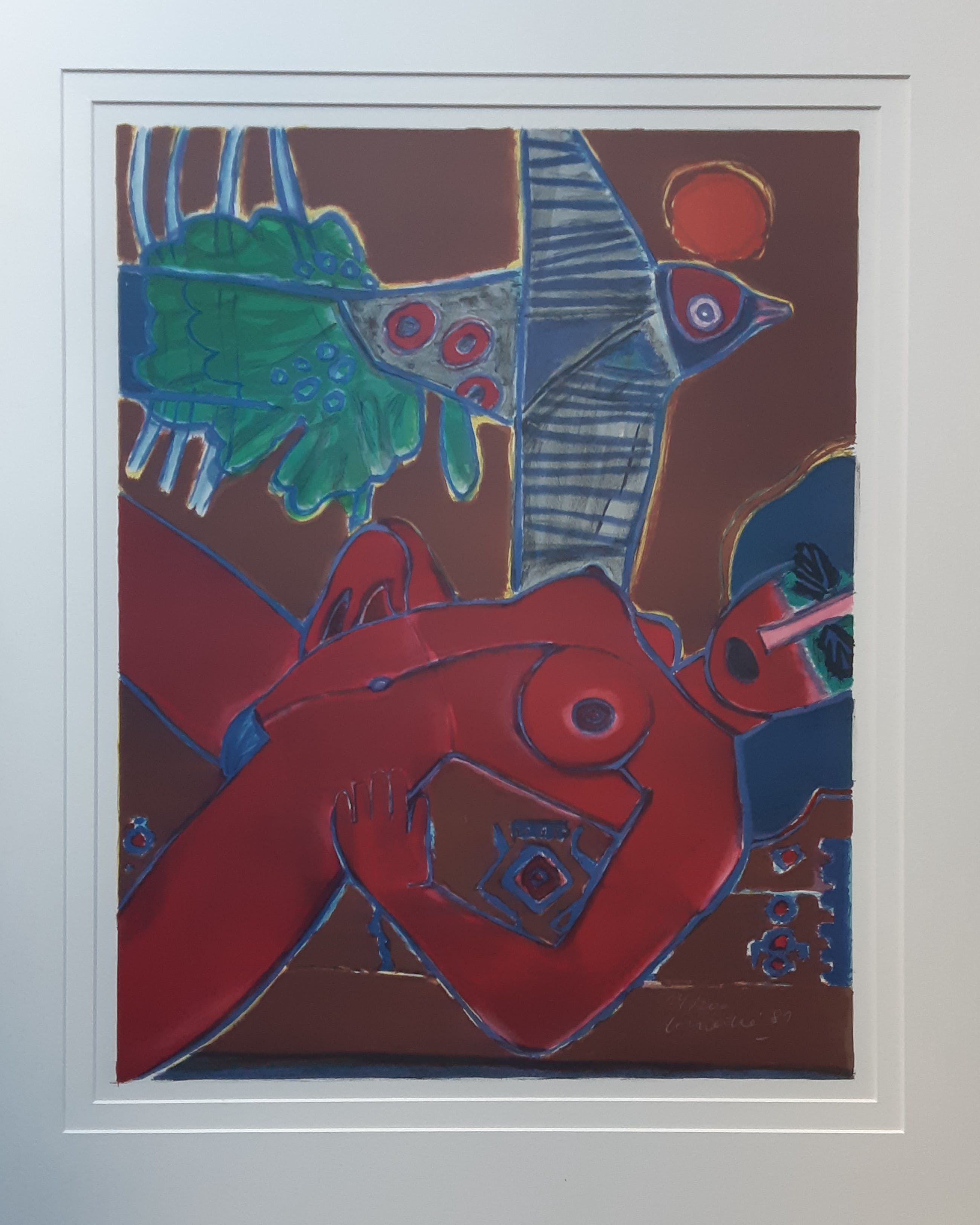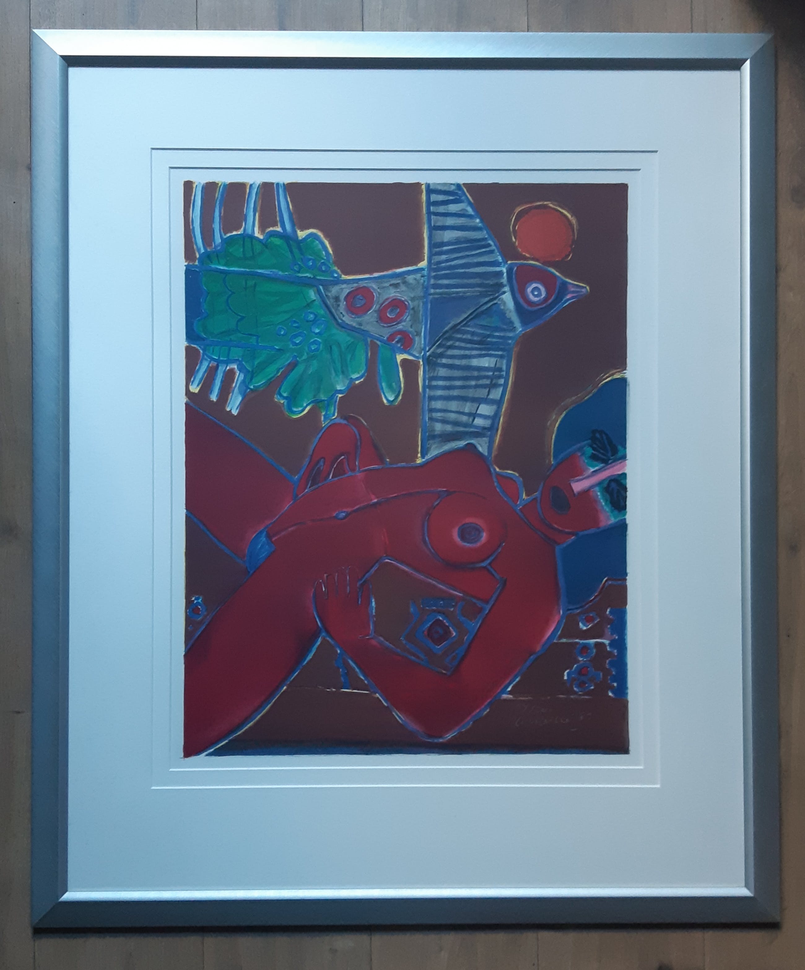 Fantastische lithografie van CoBrA kunstenaar Corneille uit 1981. Zéér goed ingelijst in een geborstelde metalen lijst en voorzien van een dubbel Passe-partout. Gesigneerd, gedateerd en genummerd in wit krijt door de kunstenaar. Dit is nummer 14 uit uit een serie van 200 exemplaren.