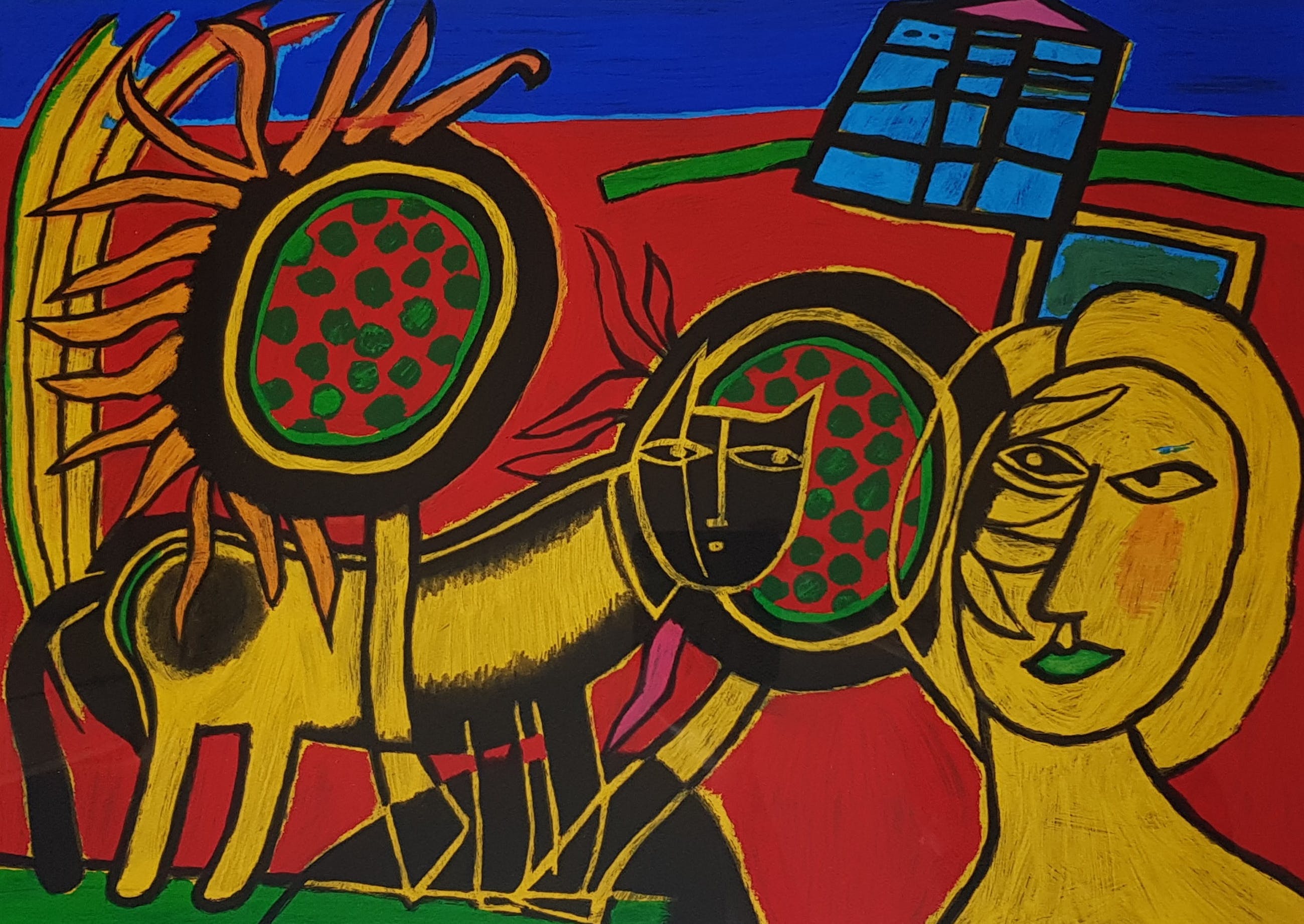 figuratieve kunst, waarbij vrouwen, vogels, bloemen en vaak personages
