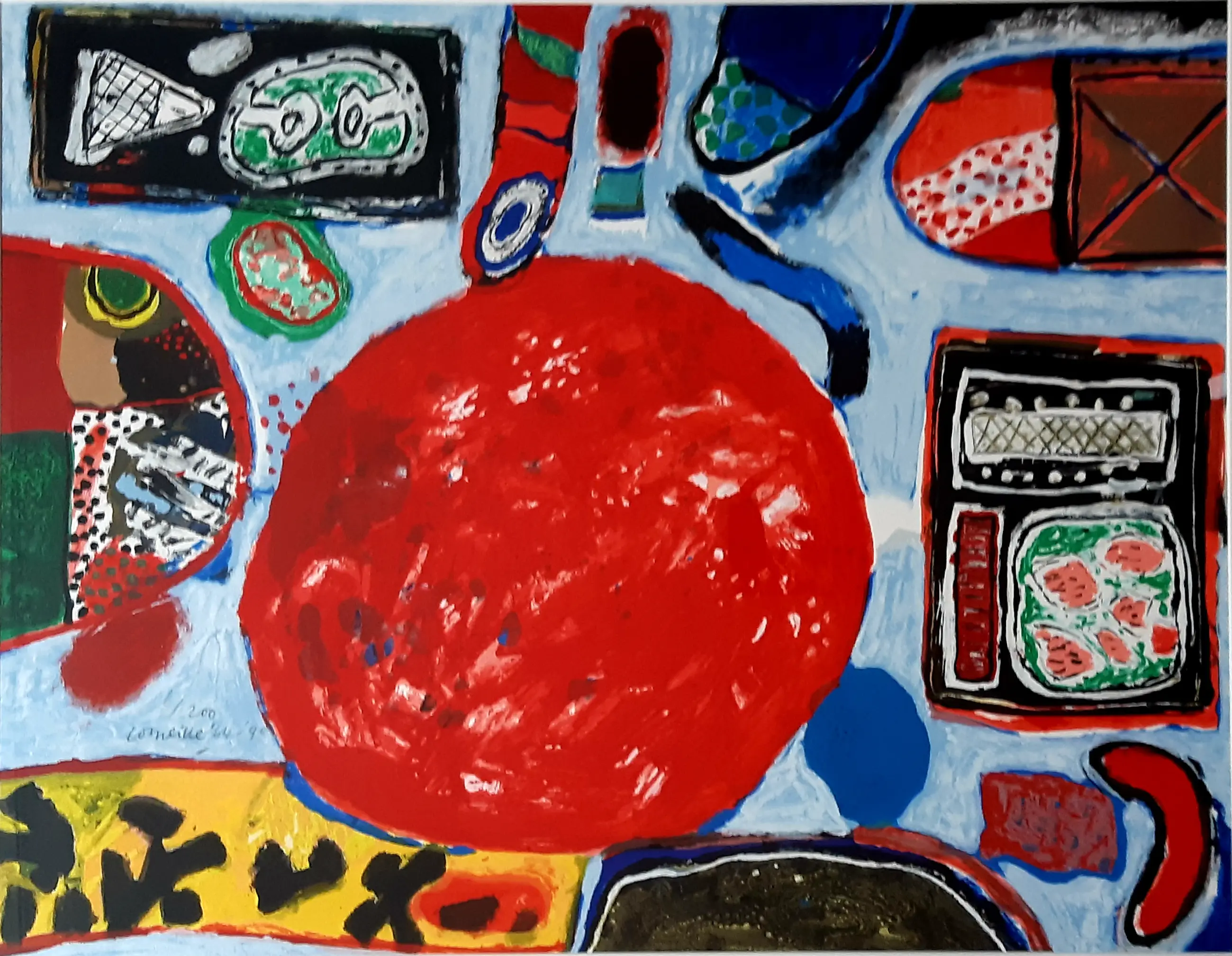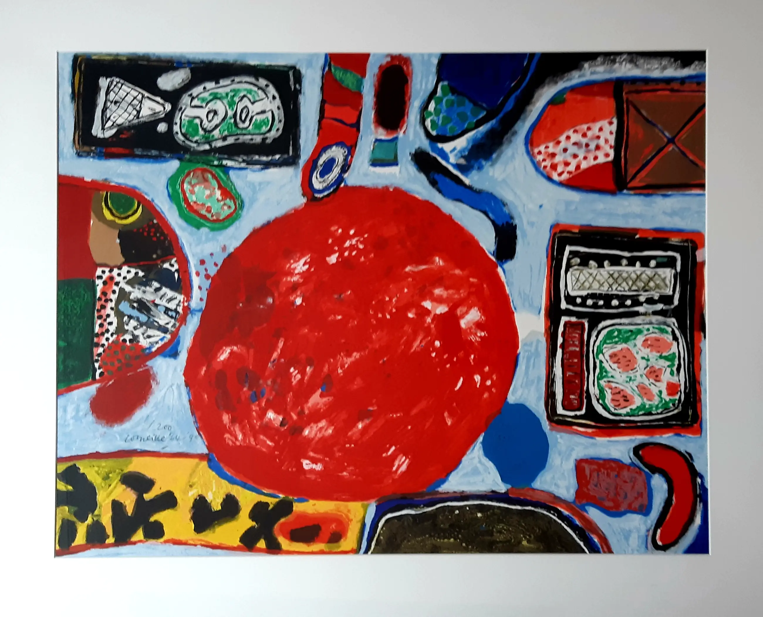 Knallende, grote en kleurrijke zeefdruk van Corneille . Mooi ingelijst in een zilverkleurige houten lijst en voorzien van een Passe-partout. Gesigneerd, genummerd en gedateerd ( '64 - '95) in potlood door de kunstenaar. Dit is nummer zes uit een serie van slechts tweehonderd exemplaren. Door de sterke kleuren en het forse formaat ( 88 x 104 cm) is dit een blikvanger in het interieur!