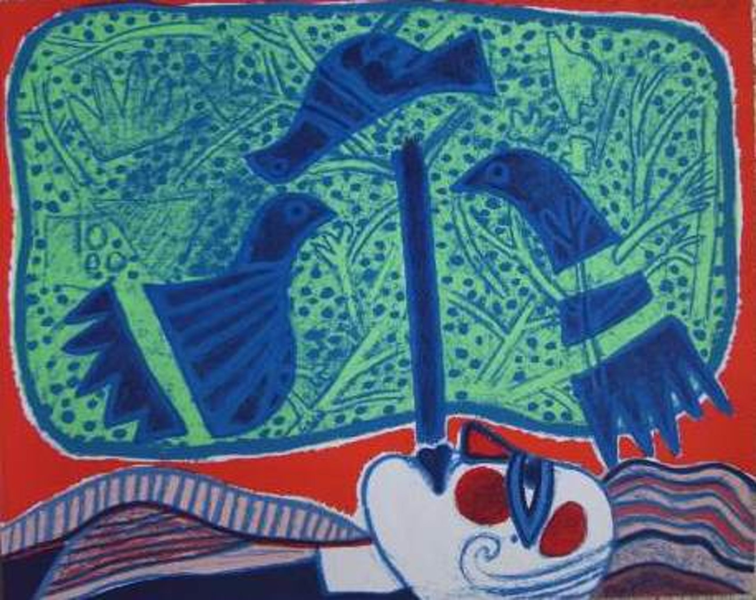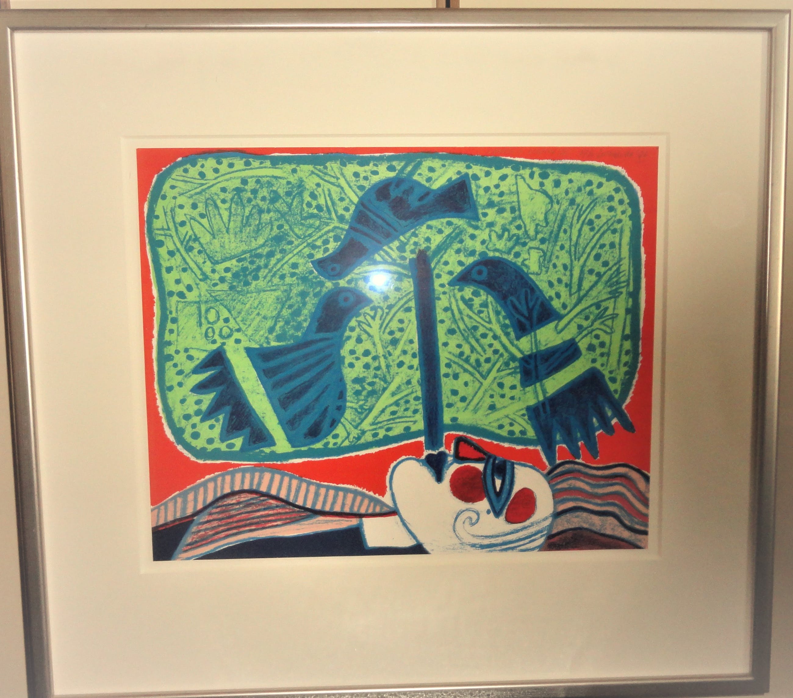 Litho is ingelijst in zilverkleurige houten lijst met verdiept passe-partout en voorzien van speciaal Claryl inlijstglas.