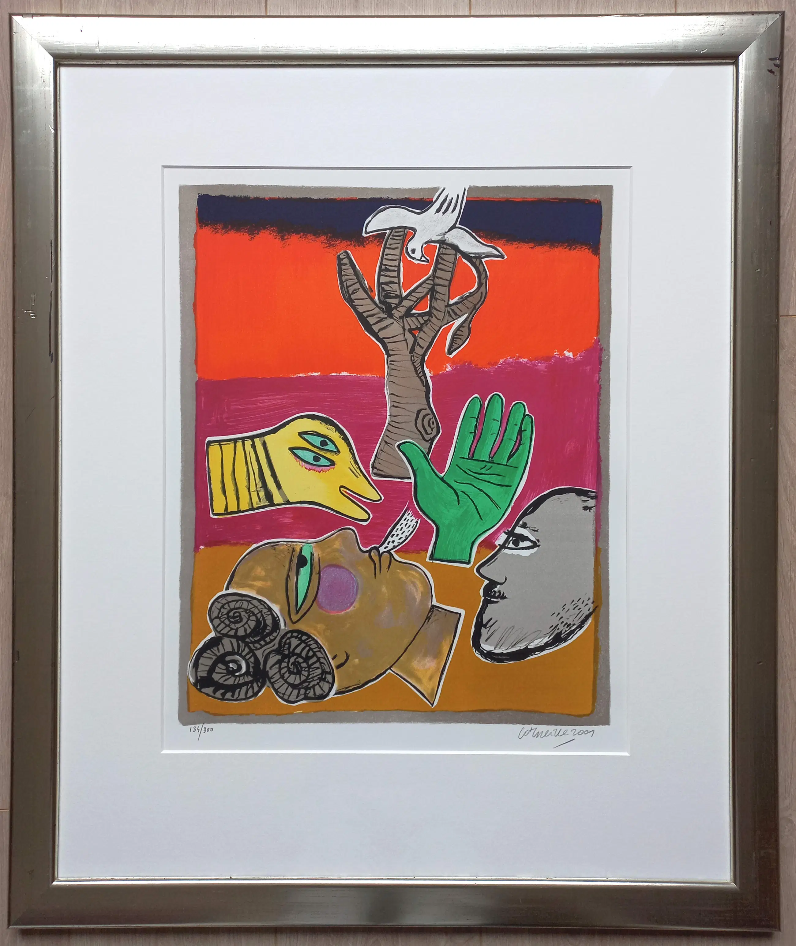 Mooi, kleurrijk werk van Corneille. Zeefdruk op geschept papier, met potlood gesigneerd, gedateerd (2001) en genummerd (134/300). Mooi ingelijst, achter glas en met smetteloos, zuurvrij passe-partout. In zeer goede conditie.