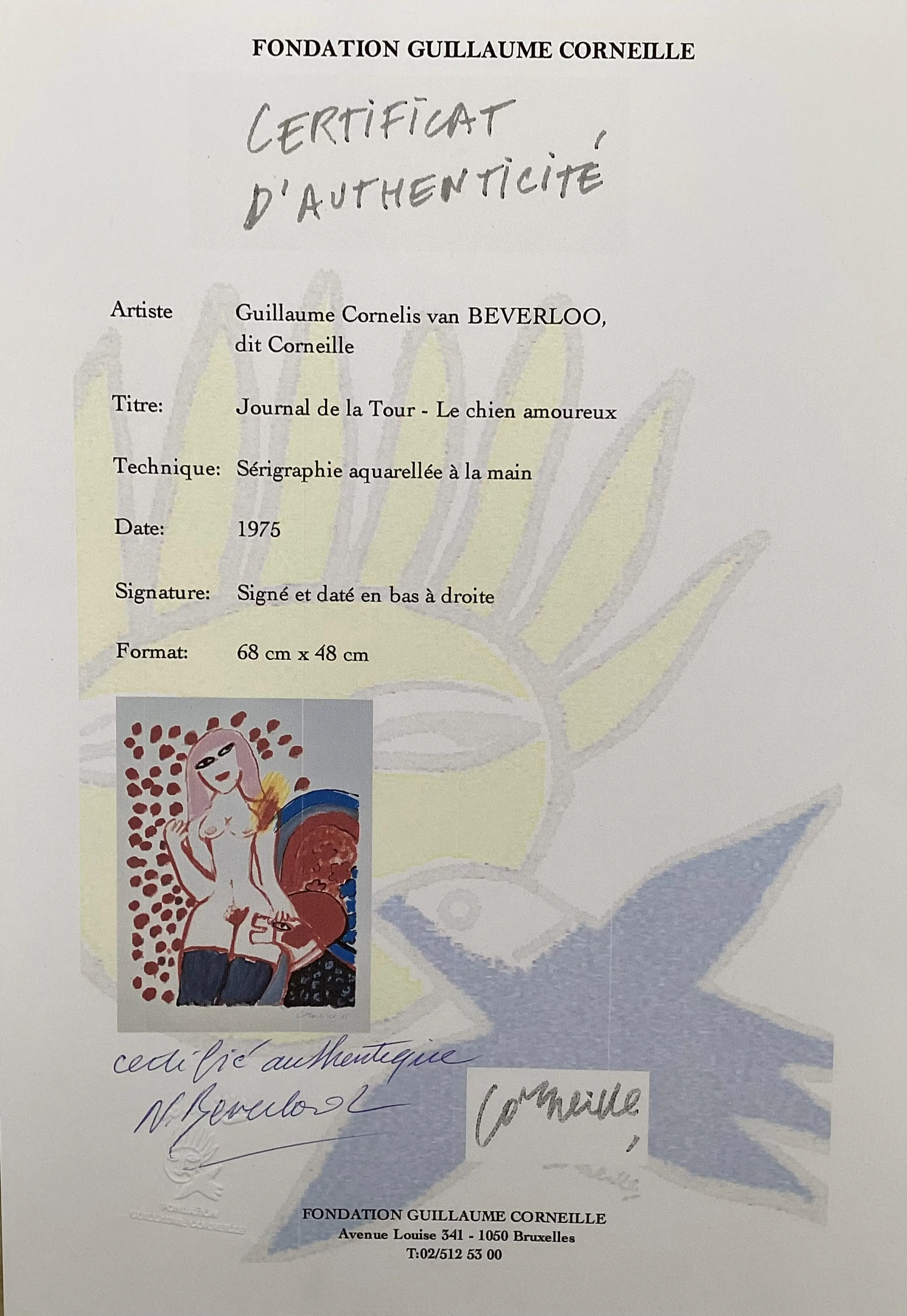 Corneille 1975 titel Journal De La Tour … Le chien amoureux Hand ingekleurde segraphie Aquarel ( waterverf) Één van de betere Litho’s in zeer goede staat dit is een niet genummerd exemplaar speciaal voor mij gemaakt uniek : getekend en gedateerd met echtheid certificaat Afmeting 68 cm x 48 cm.
