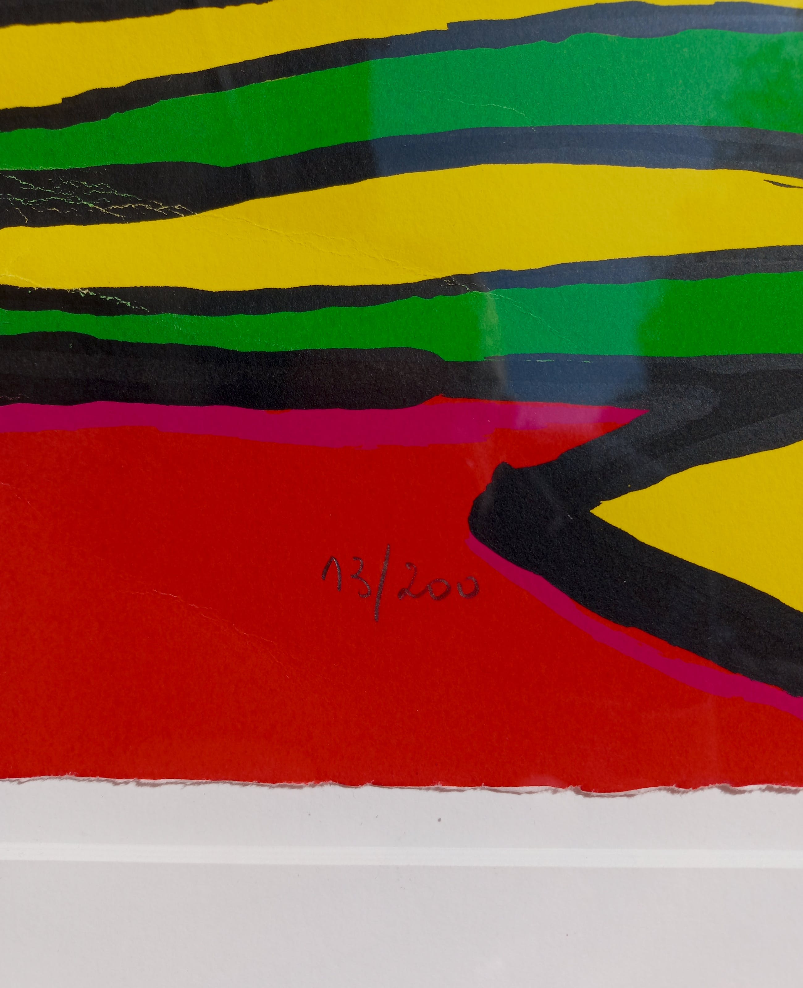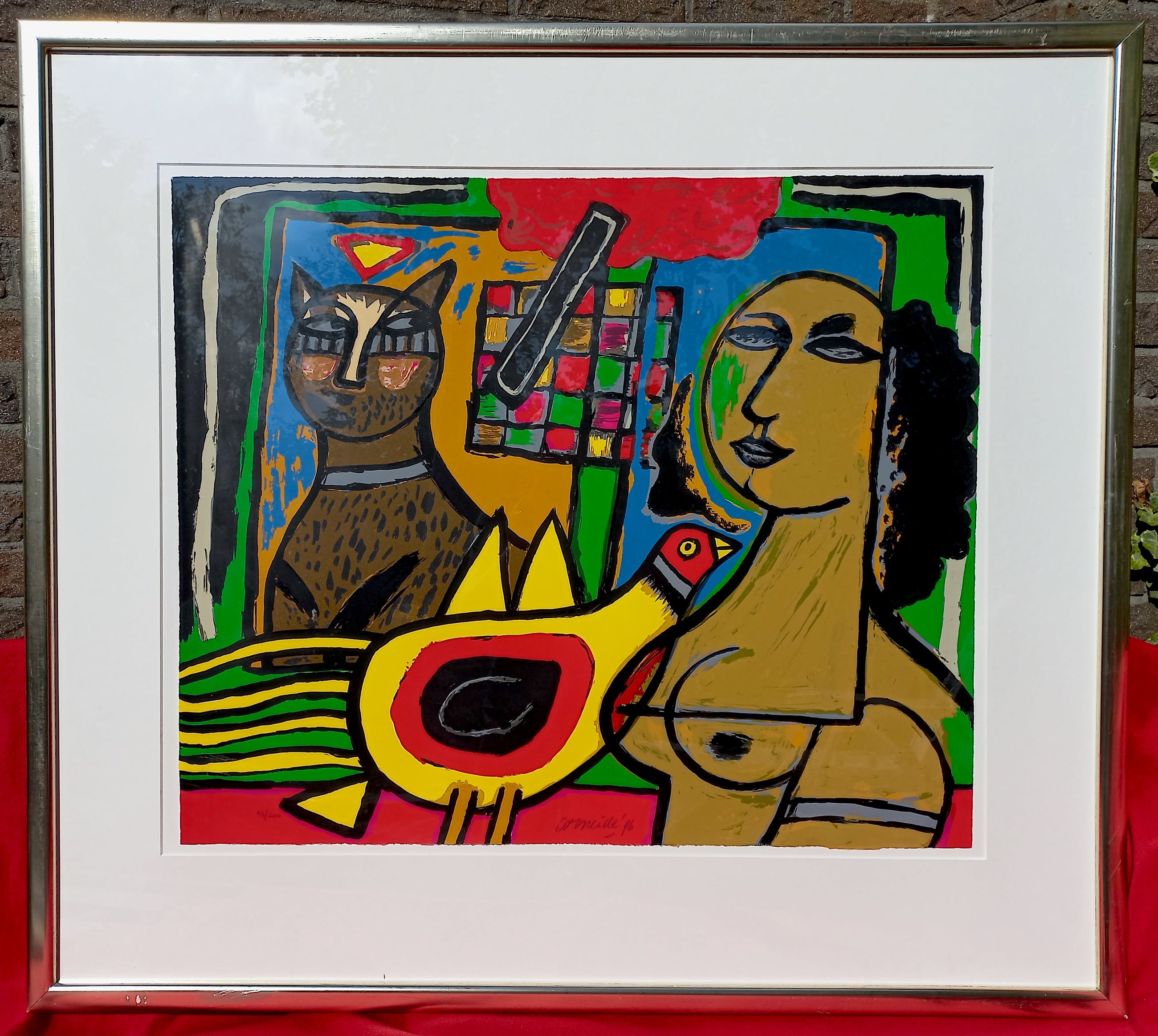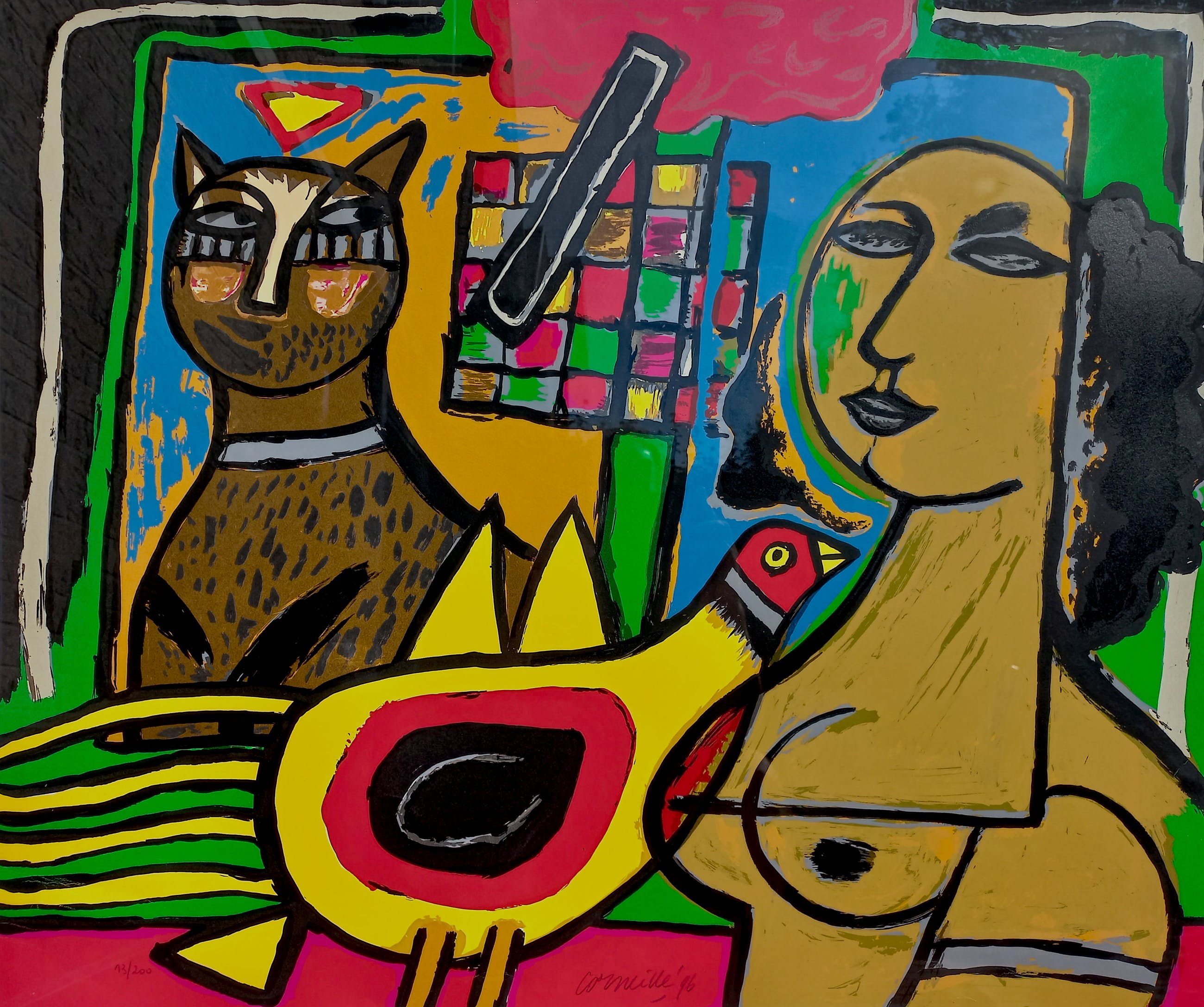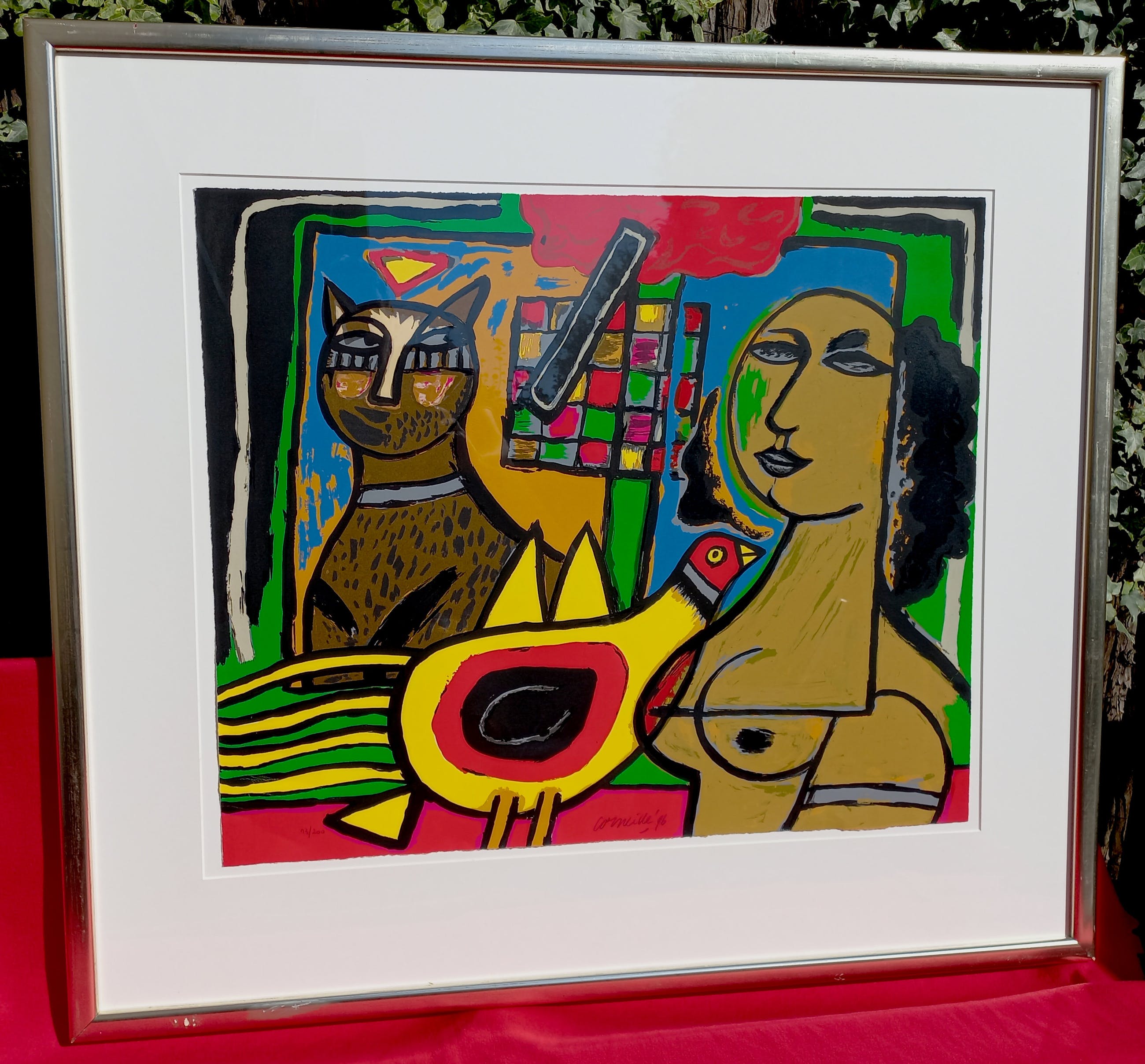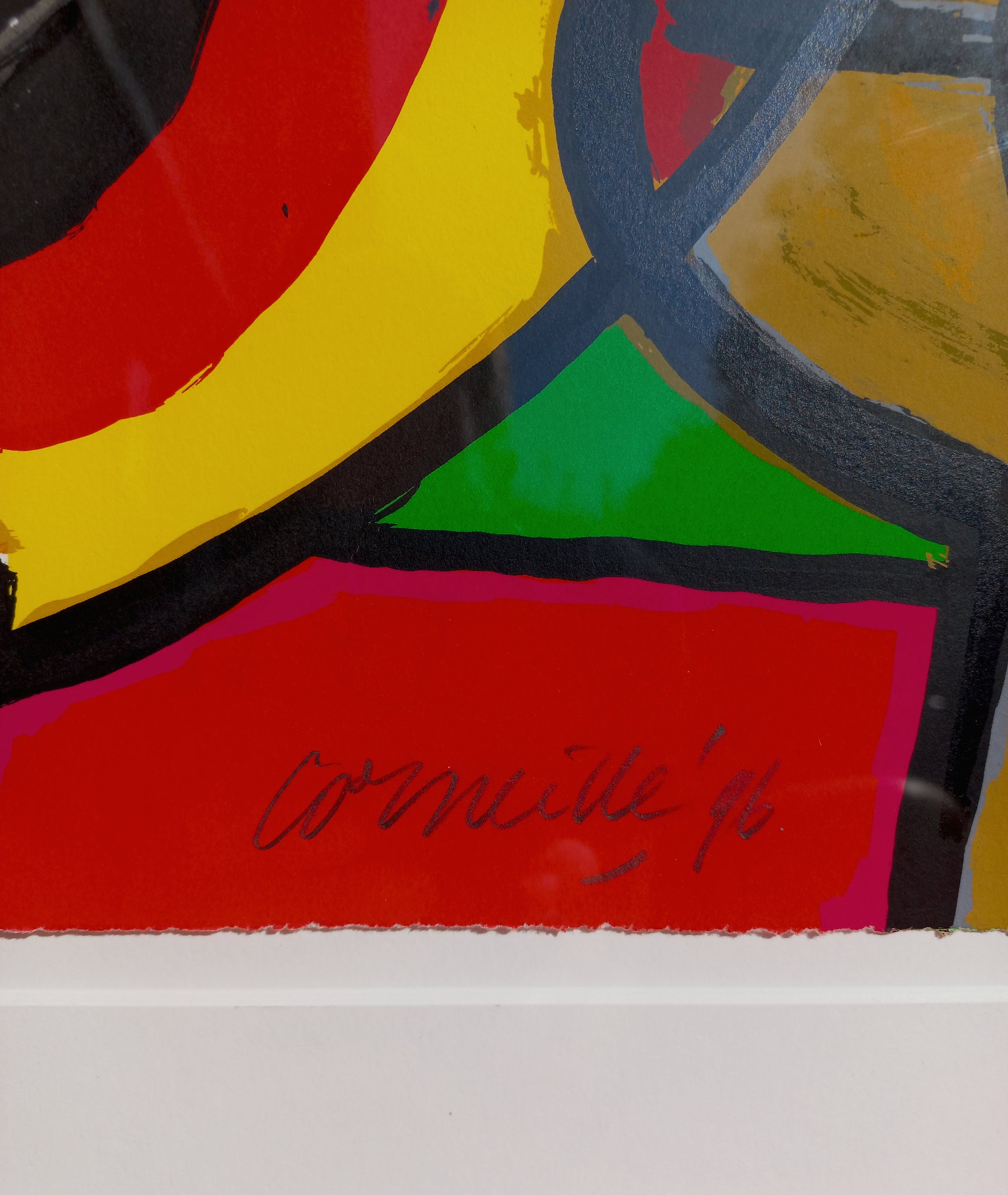 Groot, kleurrijk werk van Corneille. Zeefdruk op geschept papier, met potlood gesigneerd, gedateerd (‘96) en genummerd (13/200). Het volledige blad netjes ingelijst, achter glas en met smetteloos, zuurvrij passe-partout. Het geheel in goede conditie; zeefdruk en passe-partout zijn in zeer goede conditie, maar er zitten wat krasjes op de lijst. Afkomstig uit de kunstcollectie van Atos Origin.