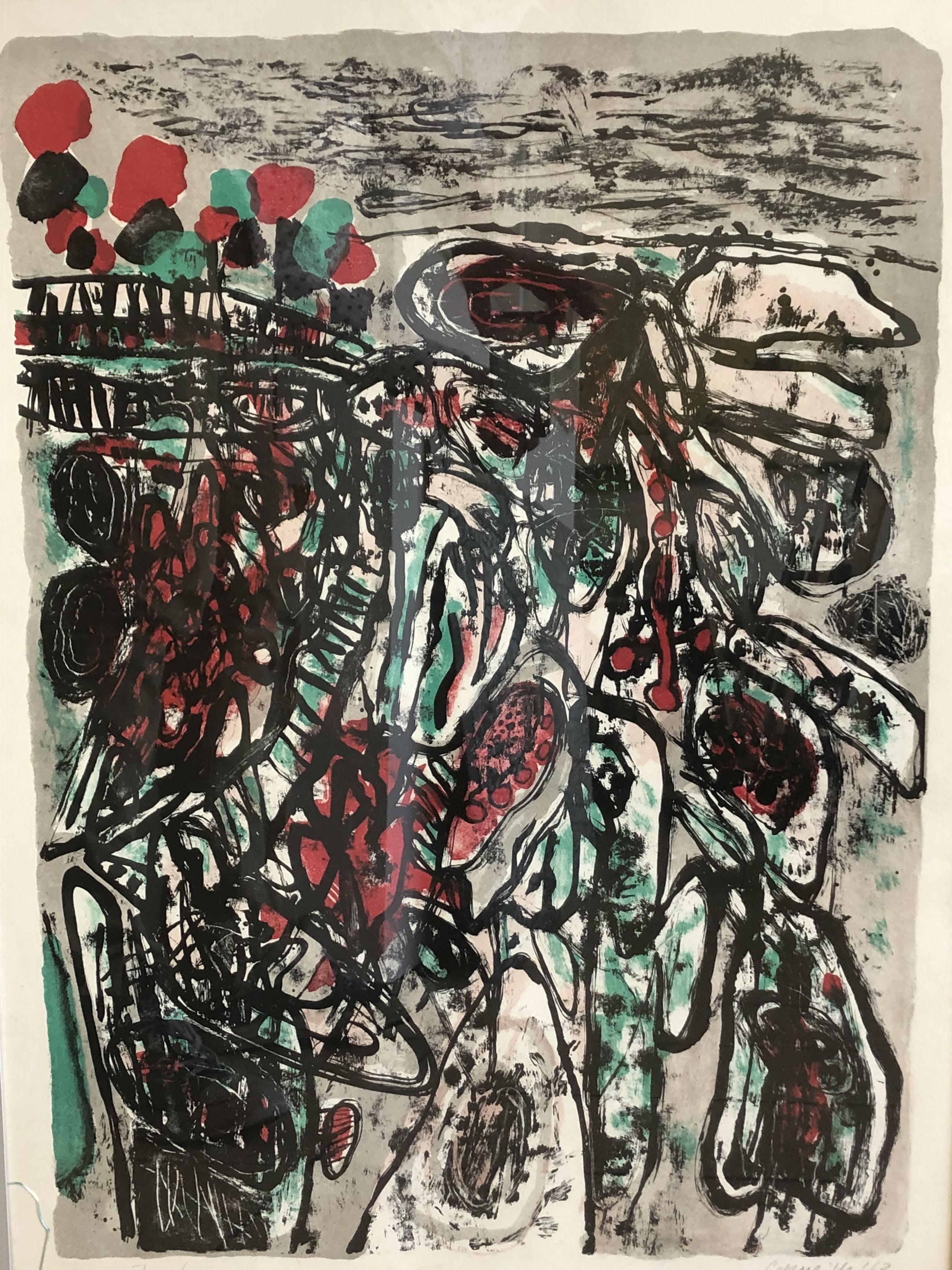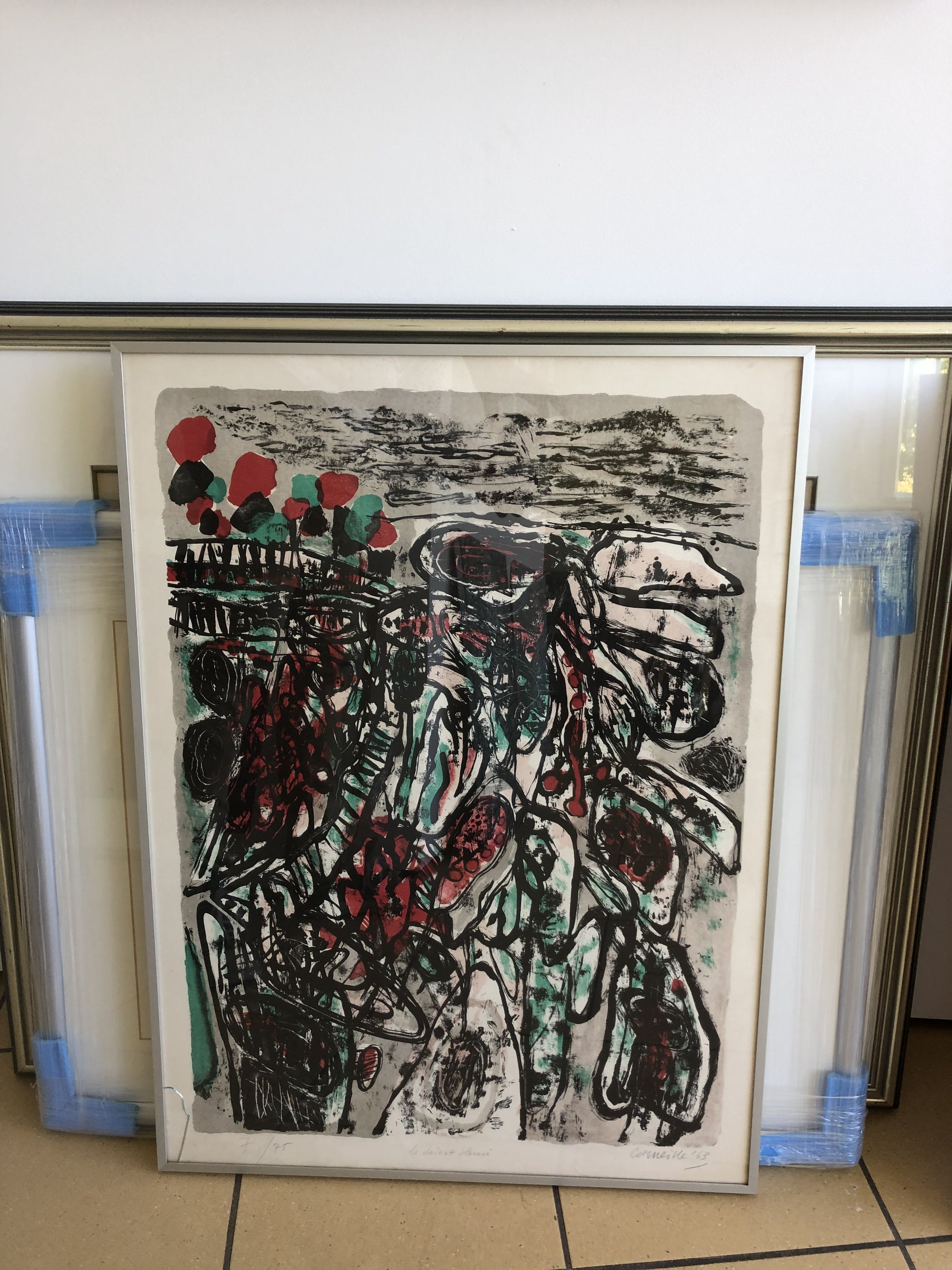 Vroeg werk van Corneille van Corneille (CoBrA) in een eenvoudige lijst uit de jaren zestig. U kunt het werk vooraf komen beoordelen of na aankoop ophalen bij galerie Rotor in Gorcum. Het werk kan met lijst verzonden worden per koerier of zonder per aangetekende post worden toegezonden zonder lijst.De foto is door het glas heen genomen vandaar is er wat spiegeling te zien. Het glas links onder is gebroken.