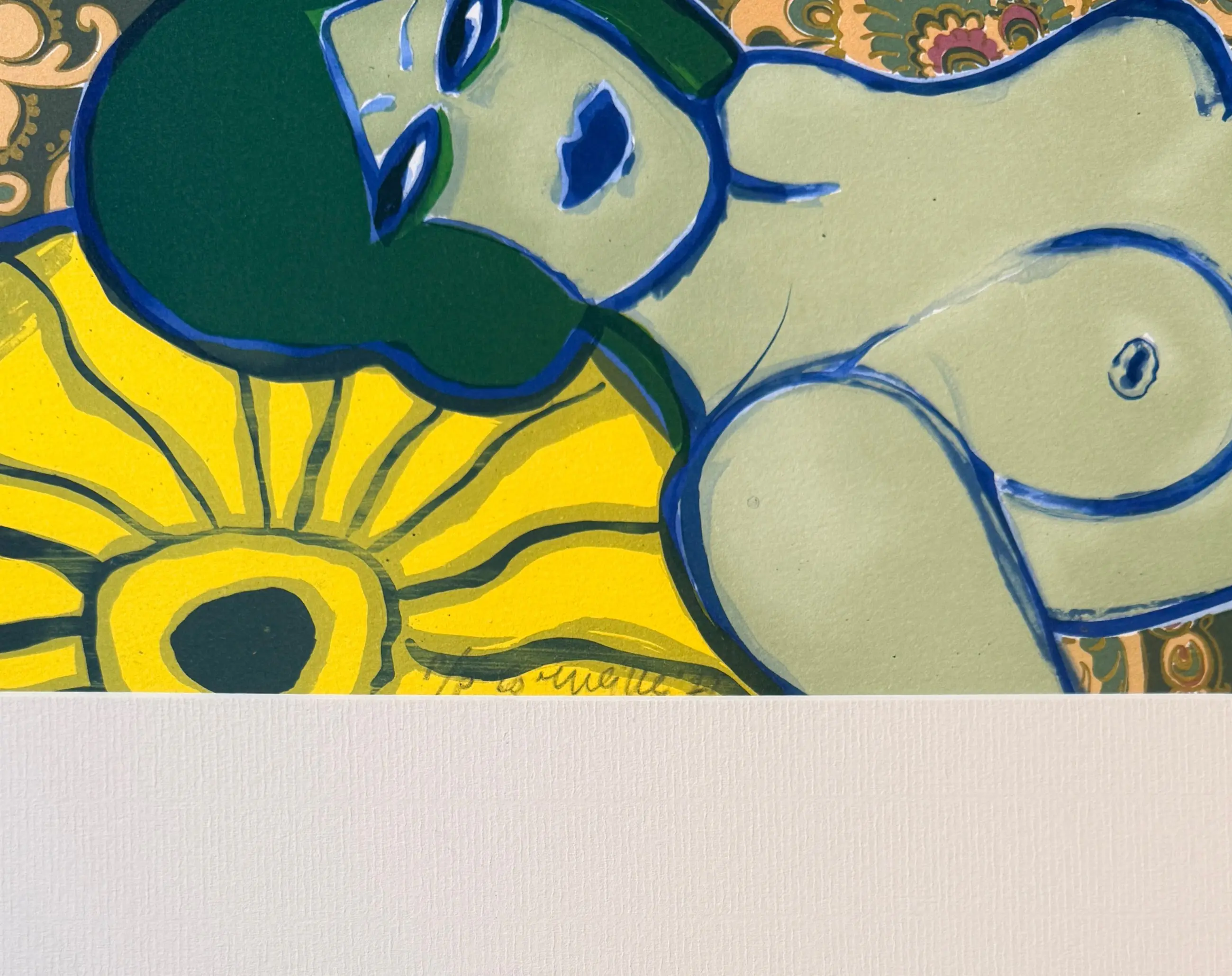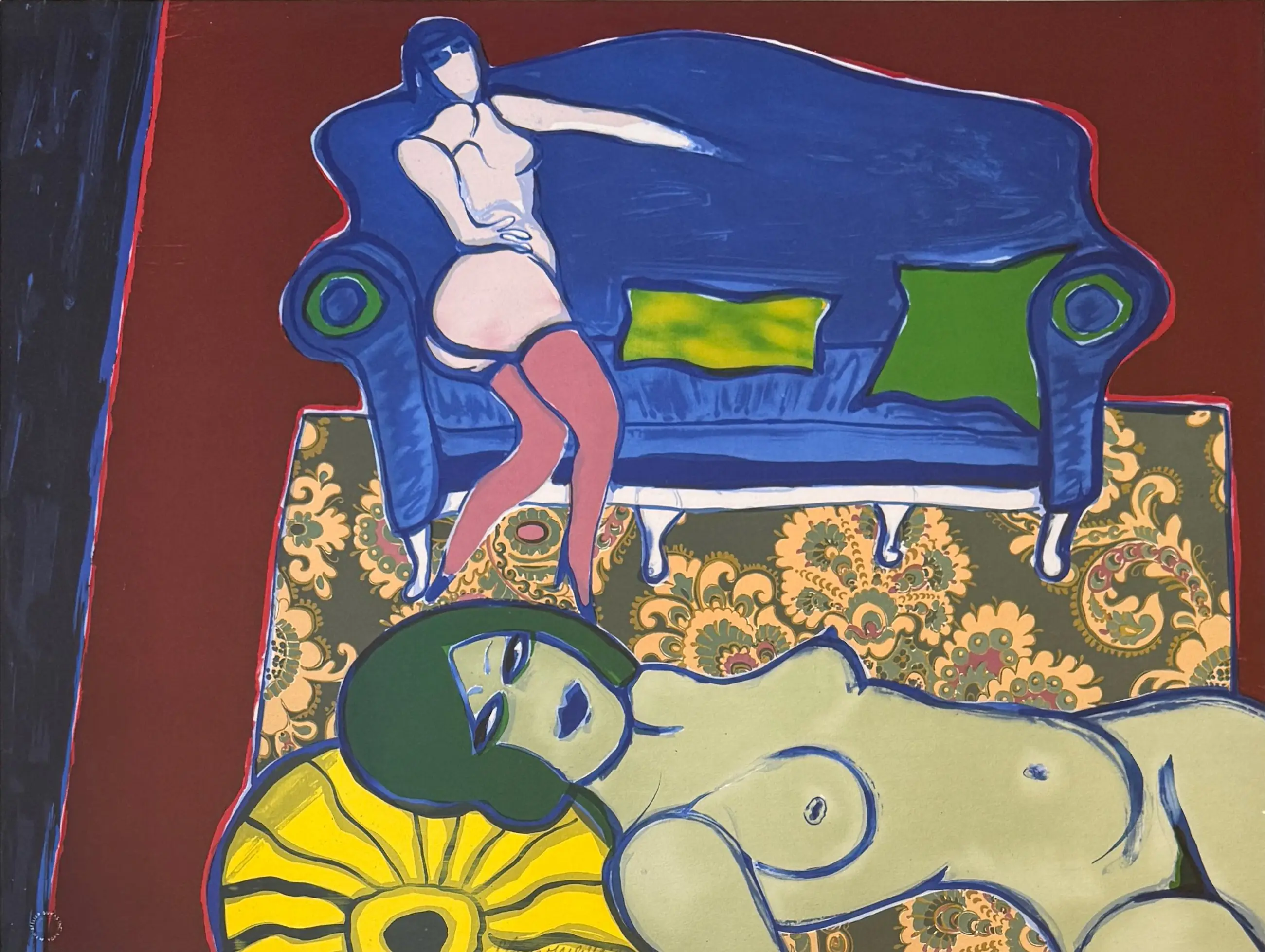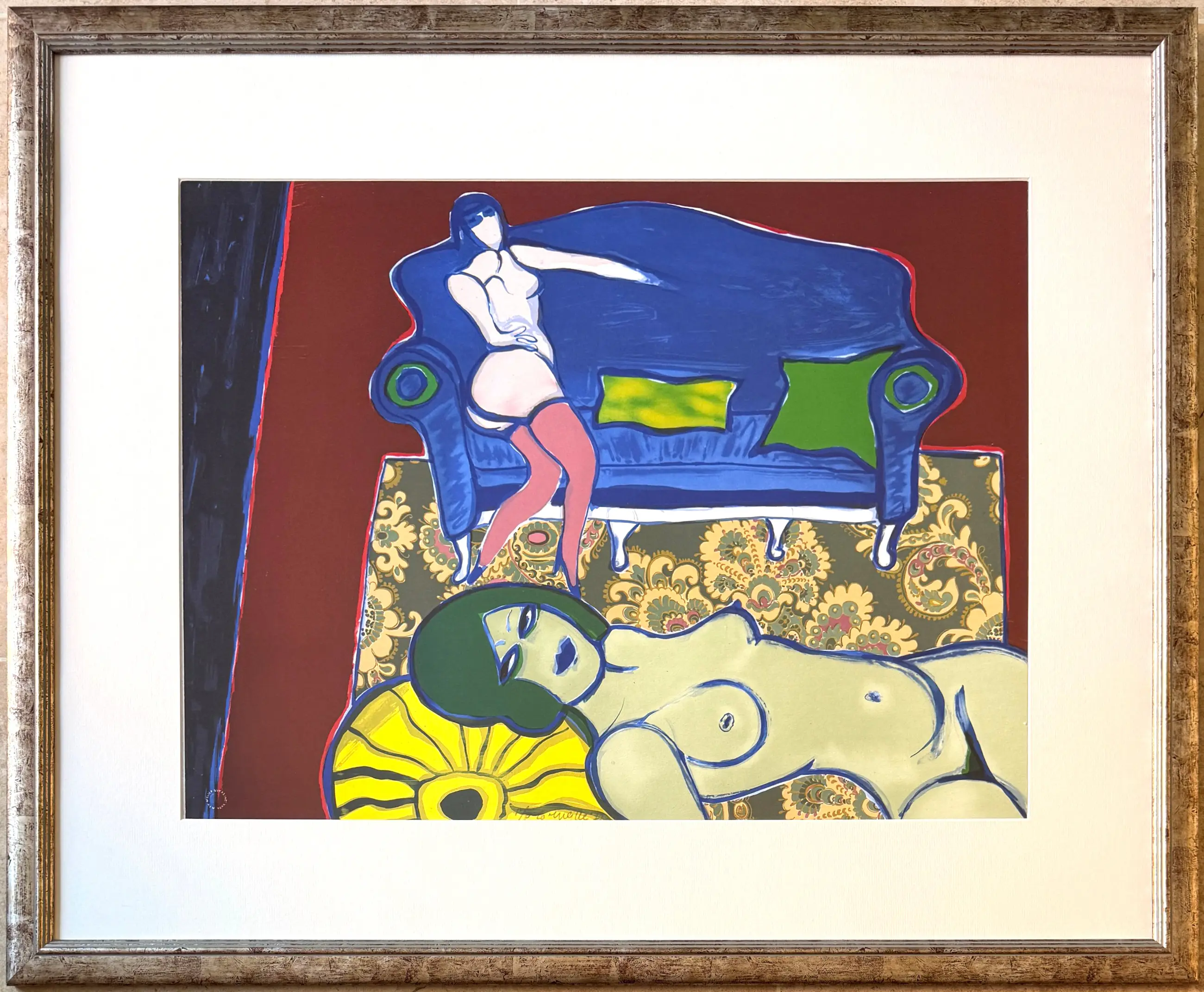 Kleurenlitho van Corneille uit 1971 'Le Divan Bleu'. Het werk is middenonder met de hand gesigneerd door de kunstenaar.