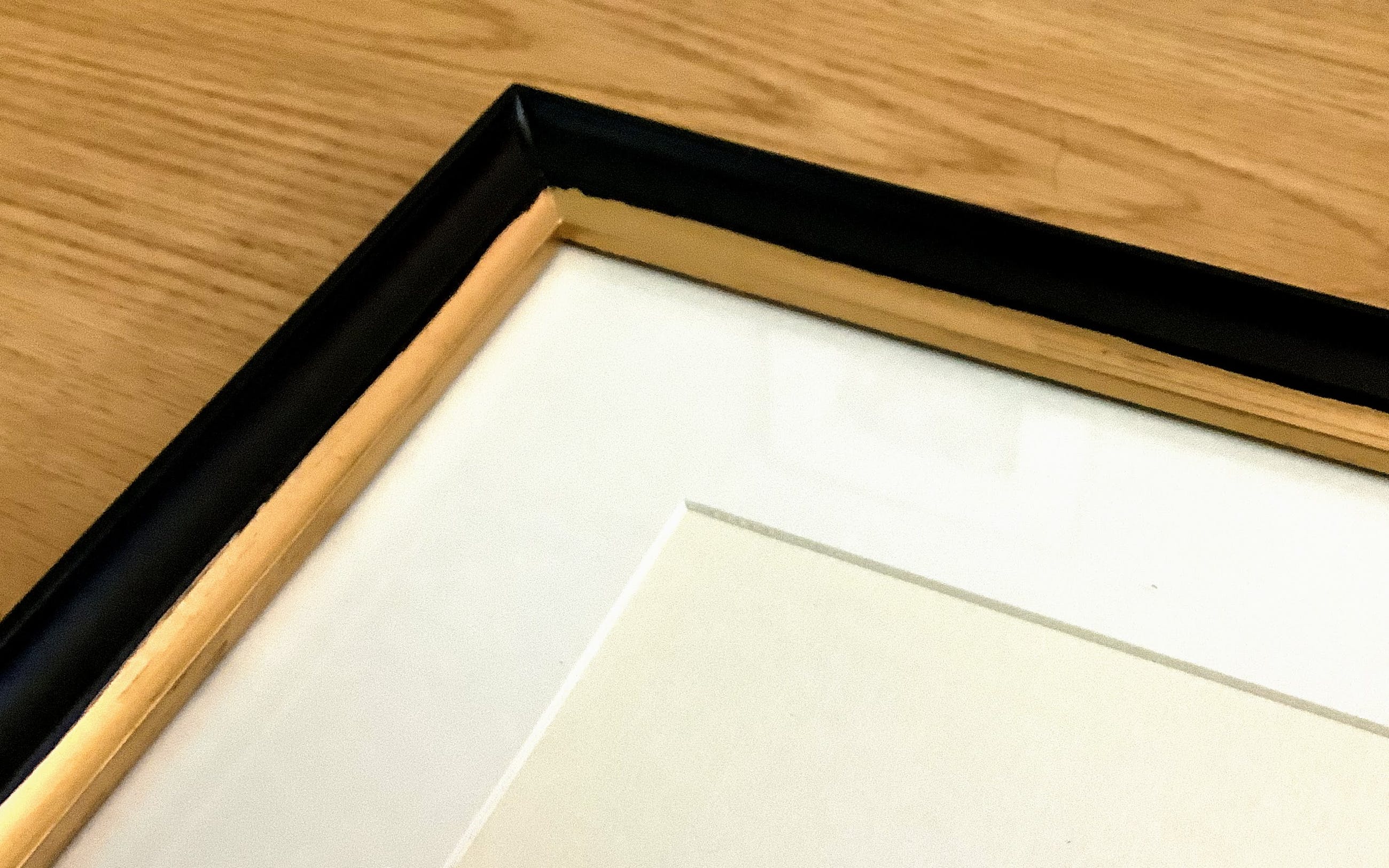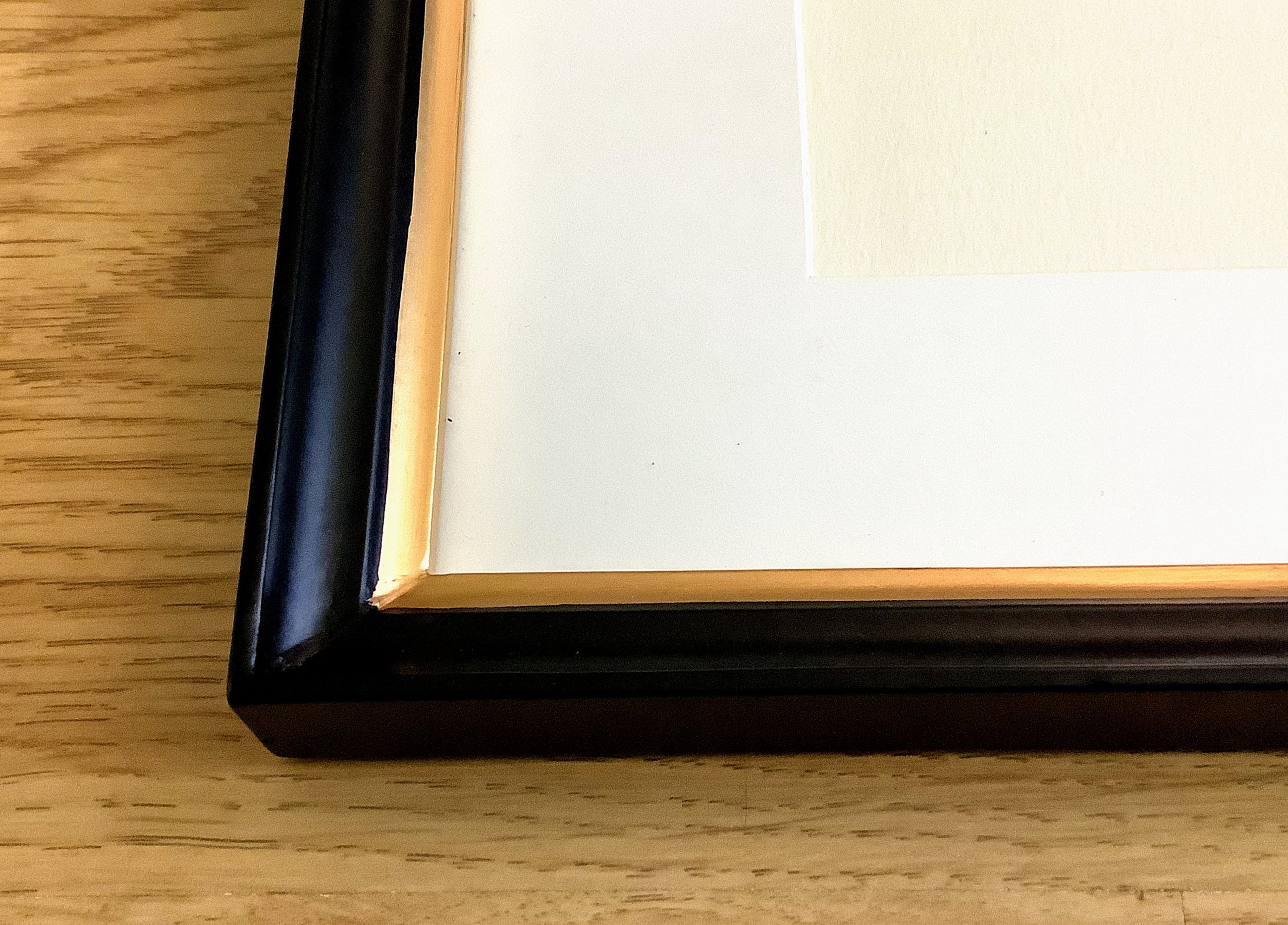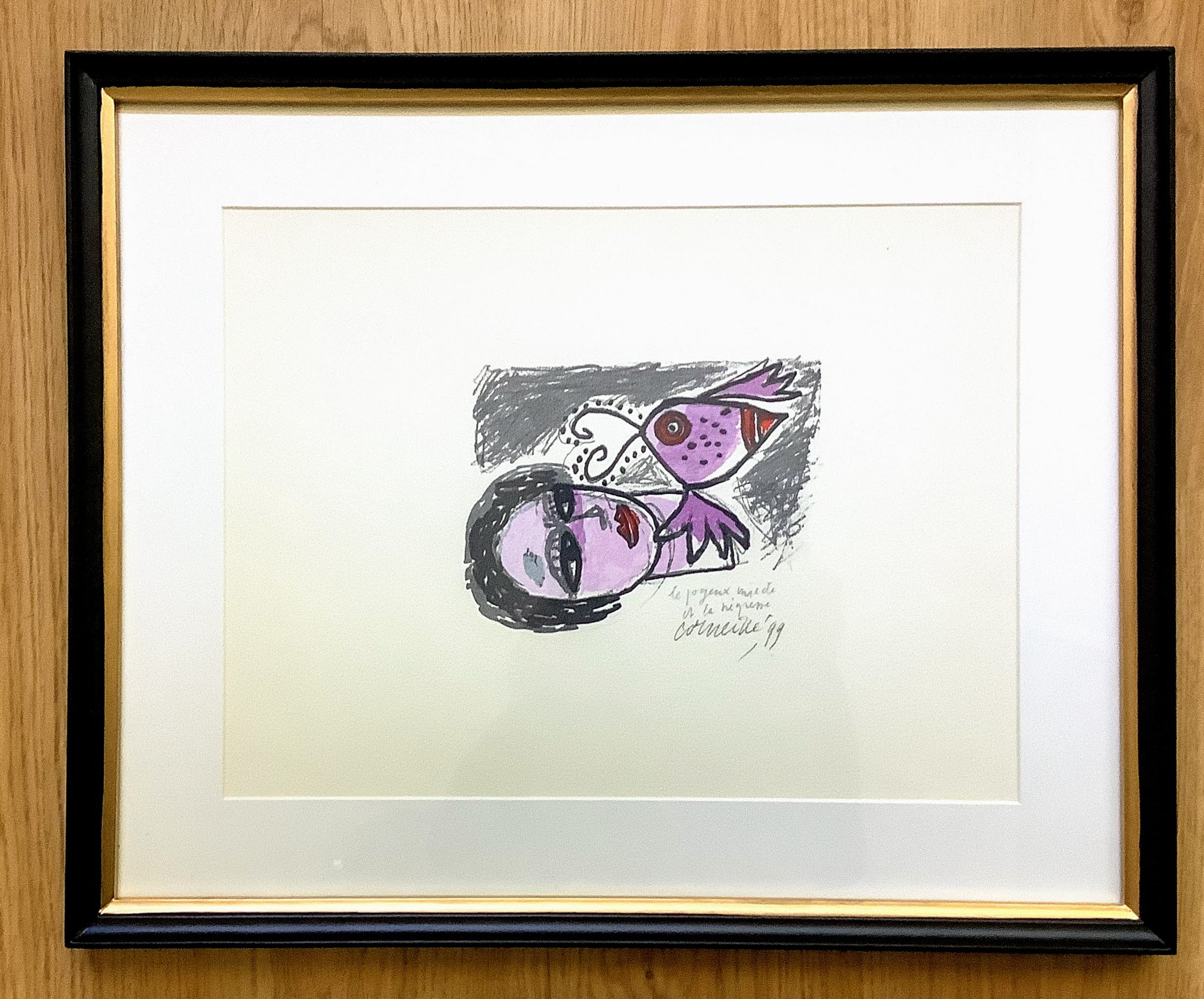 Aangeboden in eenvoudige zwarte houten lijst met goudkleurige bies in wit pars partout. 2 cm breed en 2,5 cm hoog.