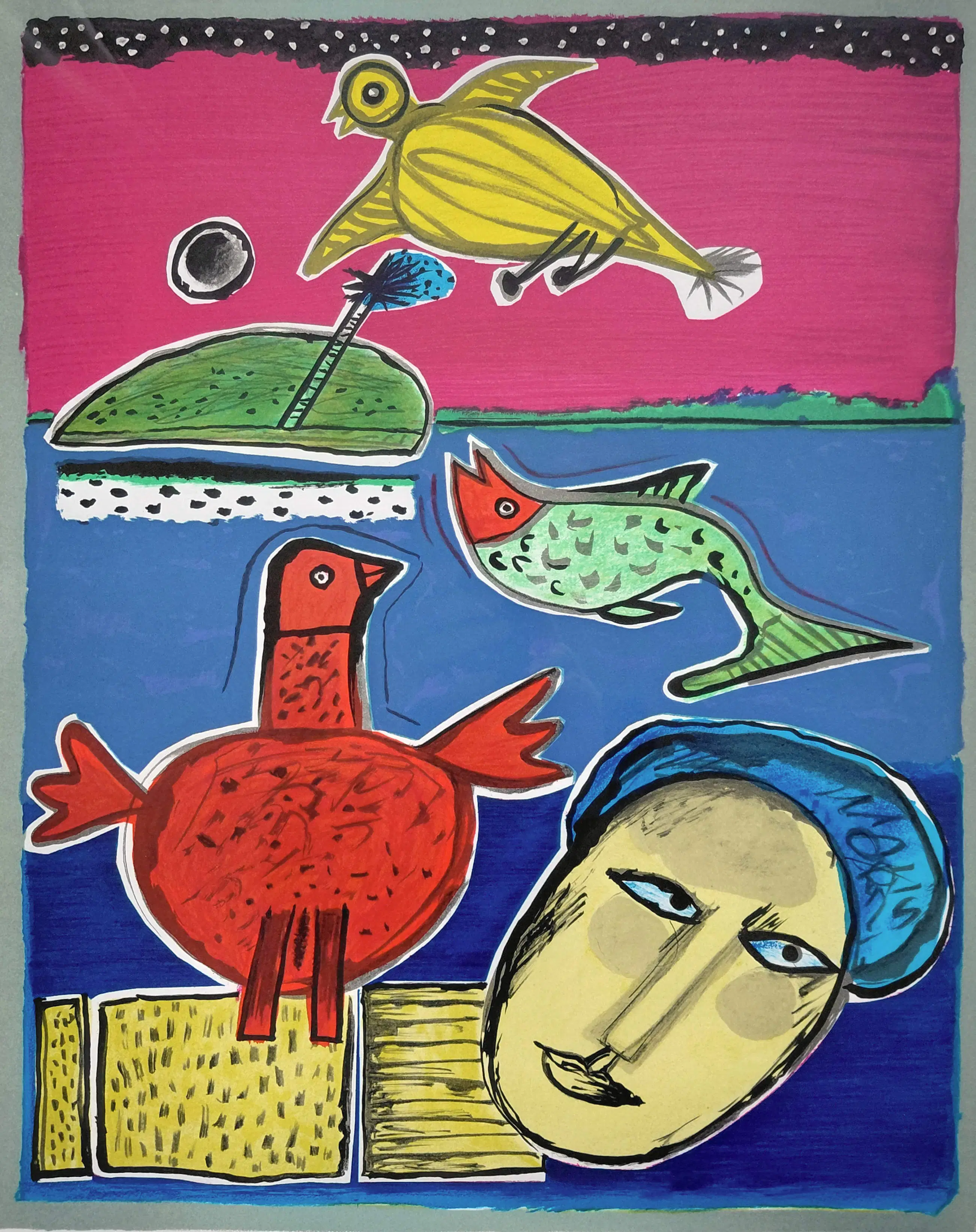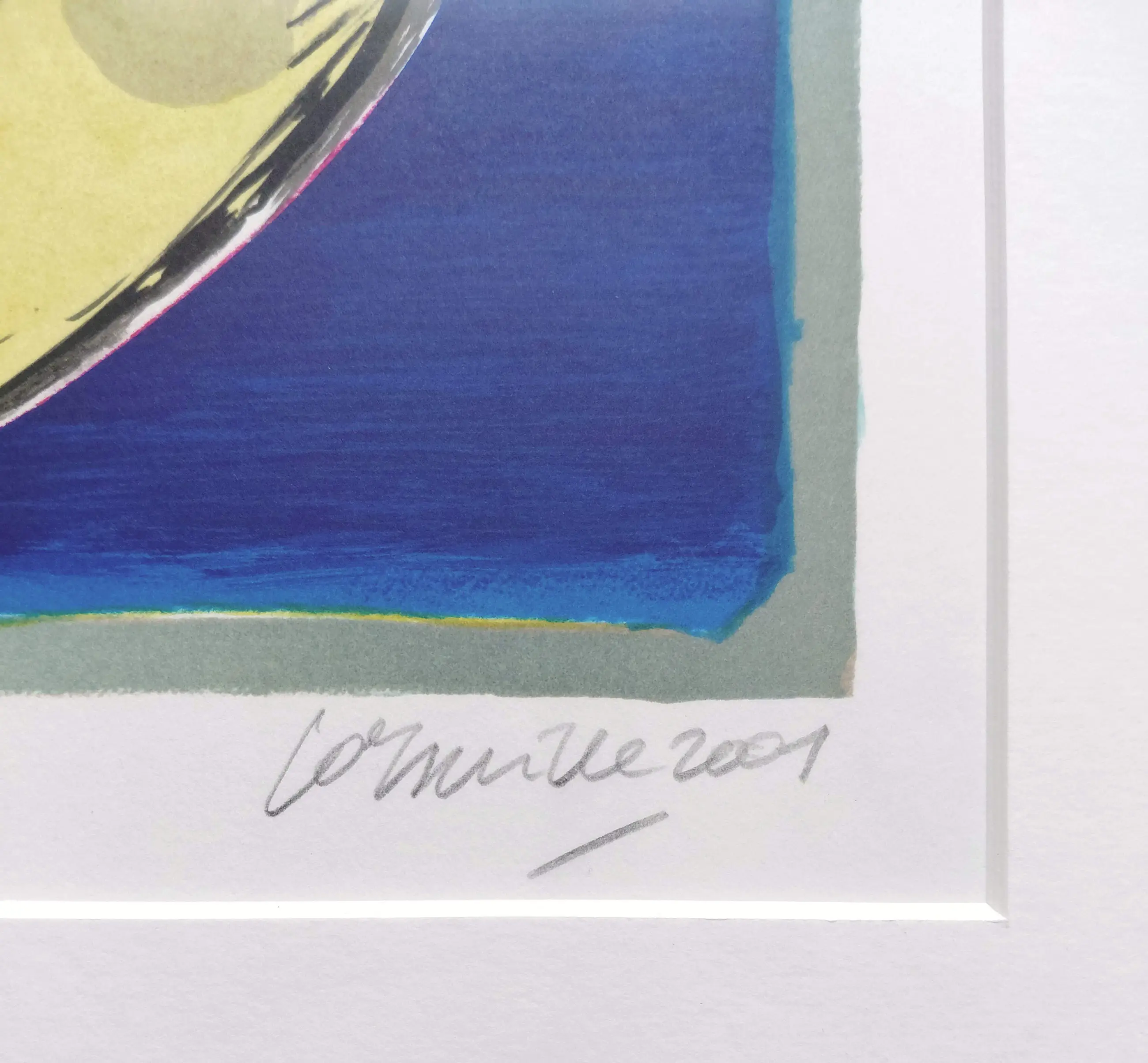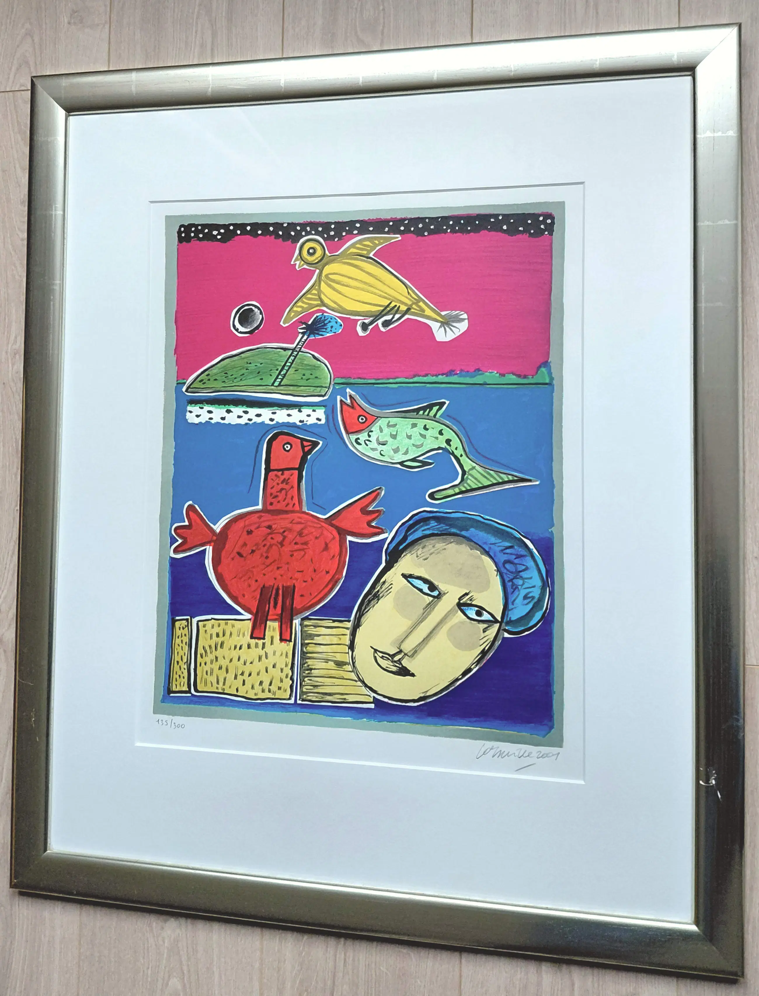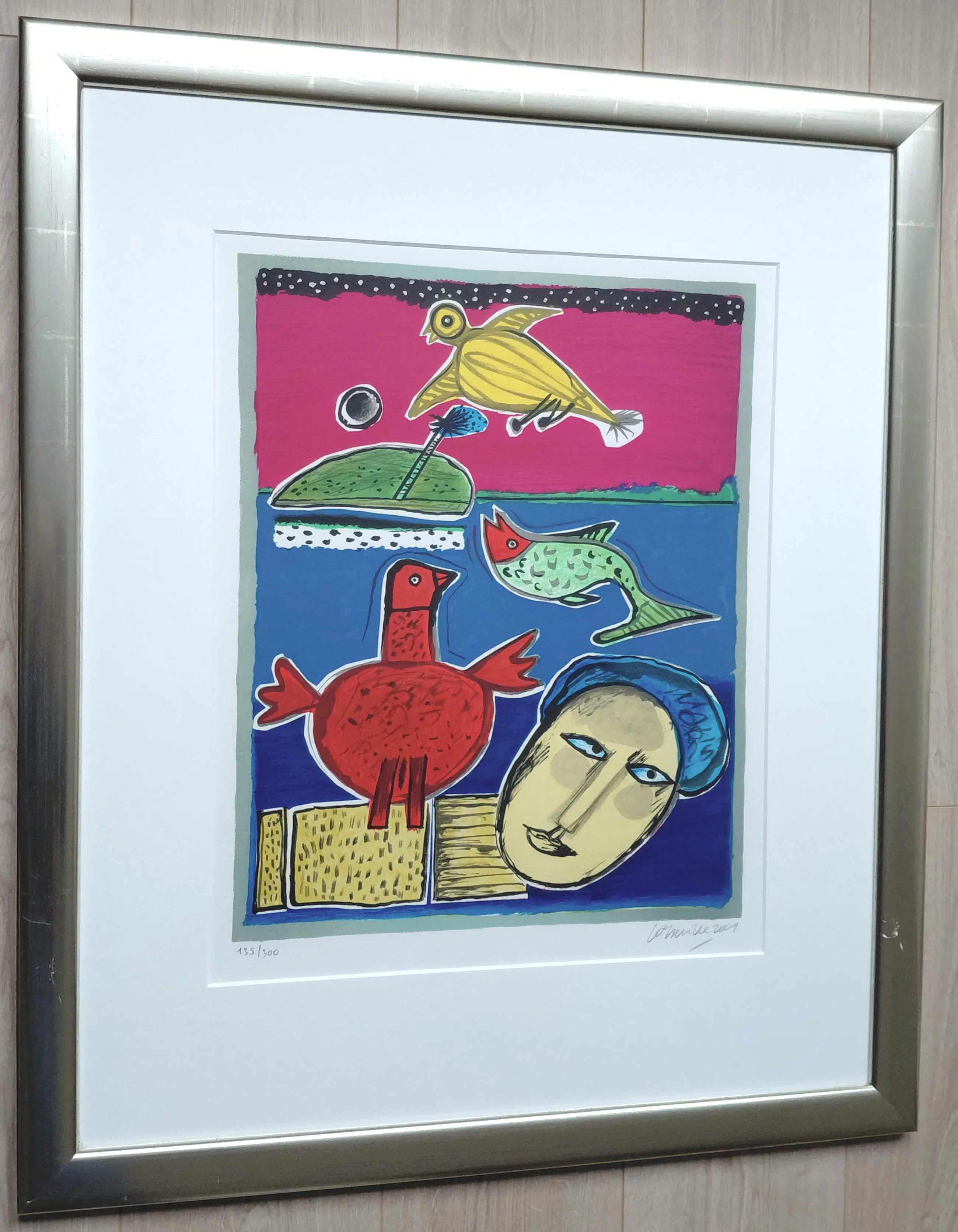 Mooi, kleurrijk werk van Corneille. Zeefdruk op geschept papier, met potlood gesigneerd, gedateerd (2001) en genummerd (135/300). Mooi ingelijst, achter glas en met smetteloos, zuurvrij passe-partout. Het geheel in zeer goede conditie. Herkomst: Holland Art Gallery, De Bijenkorf.