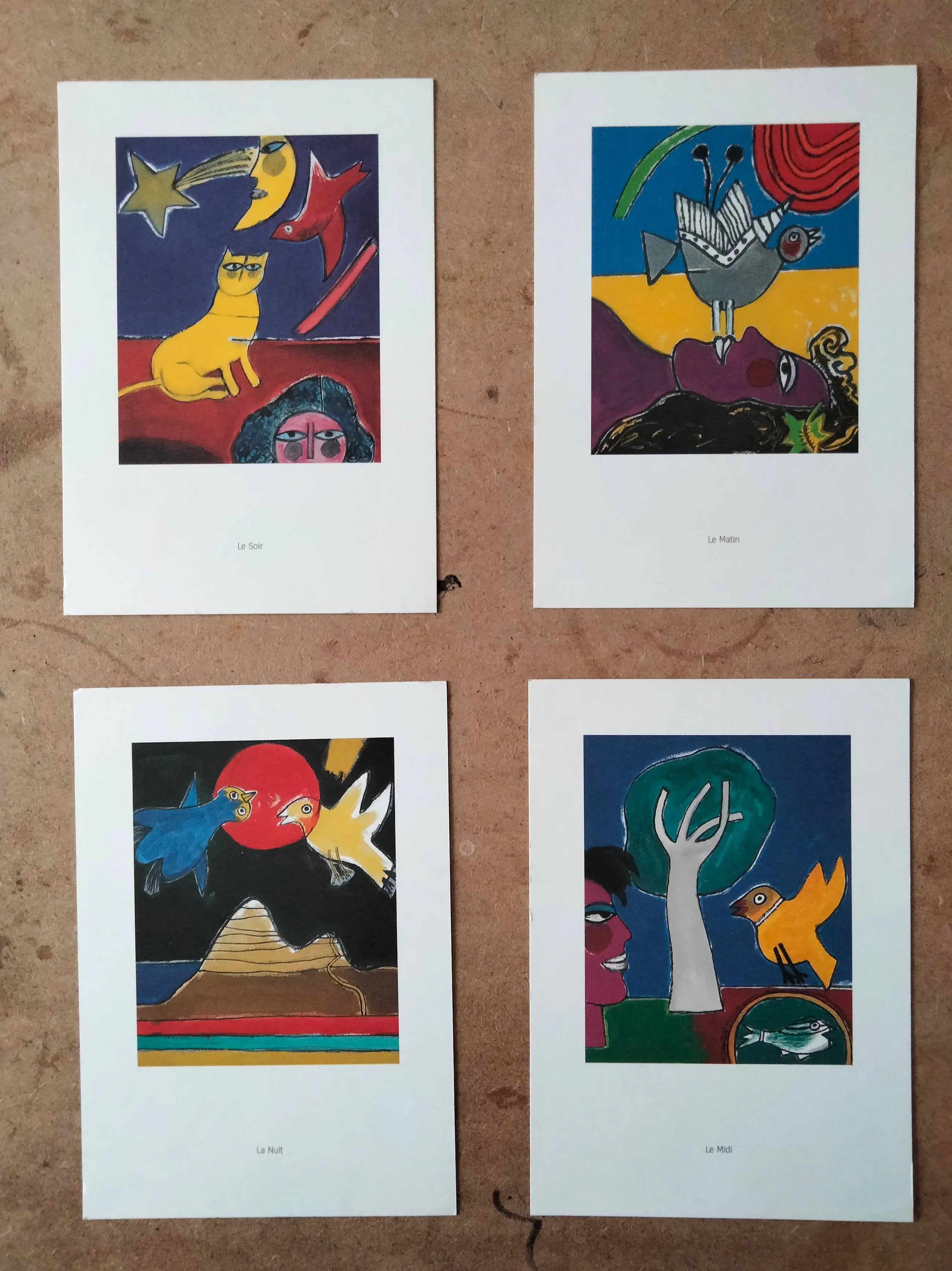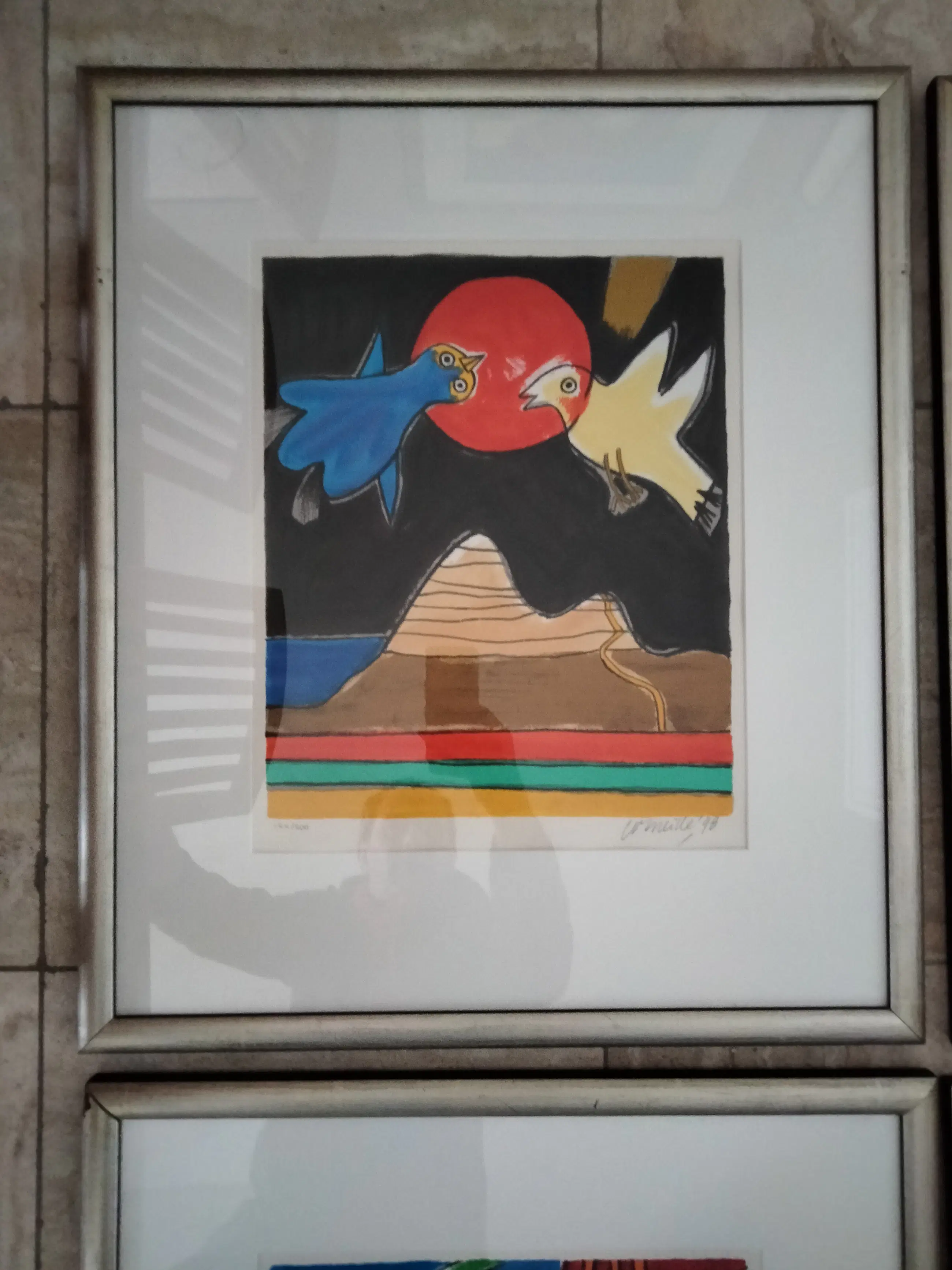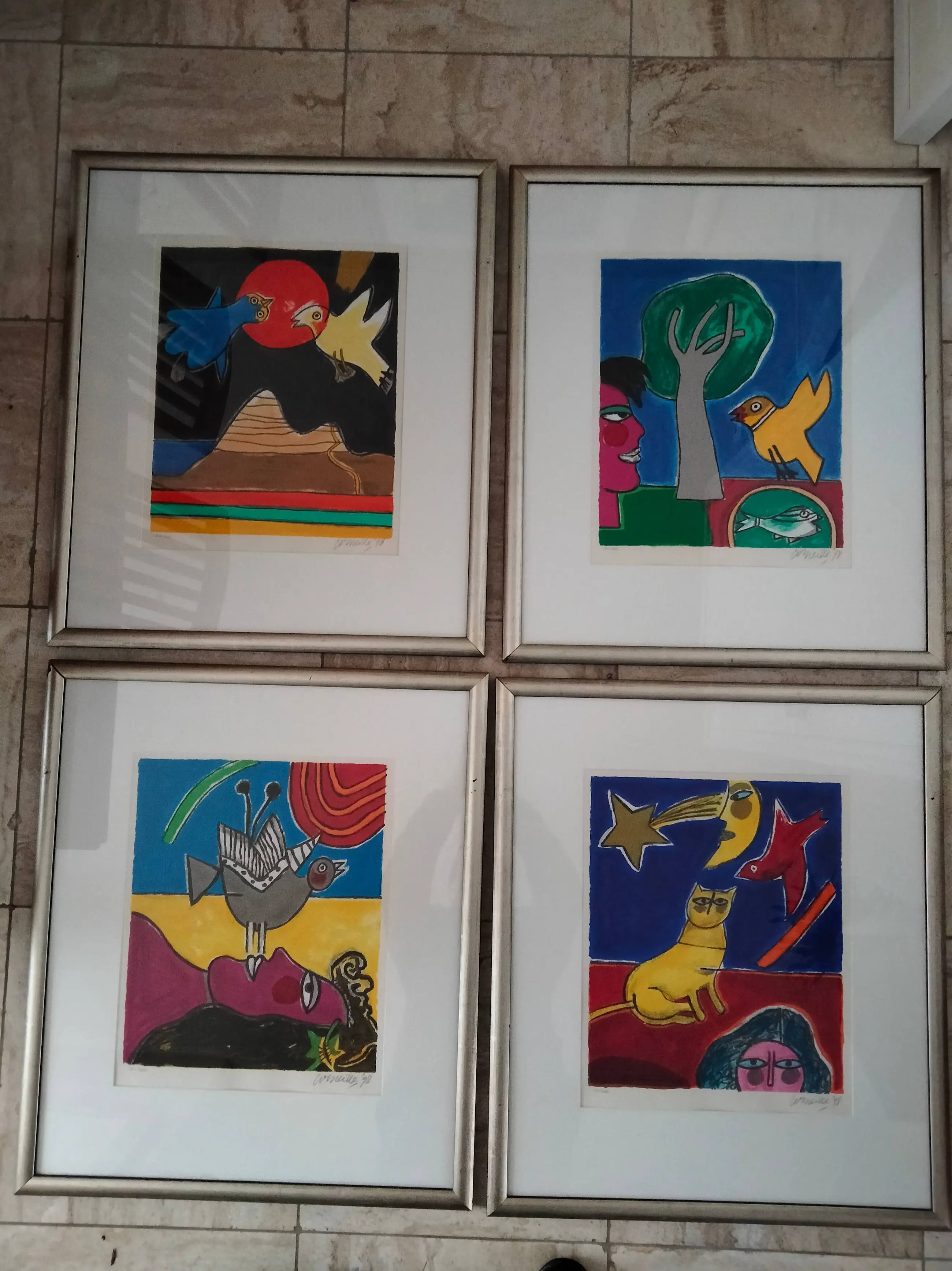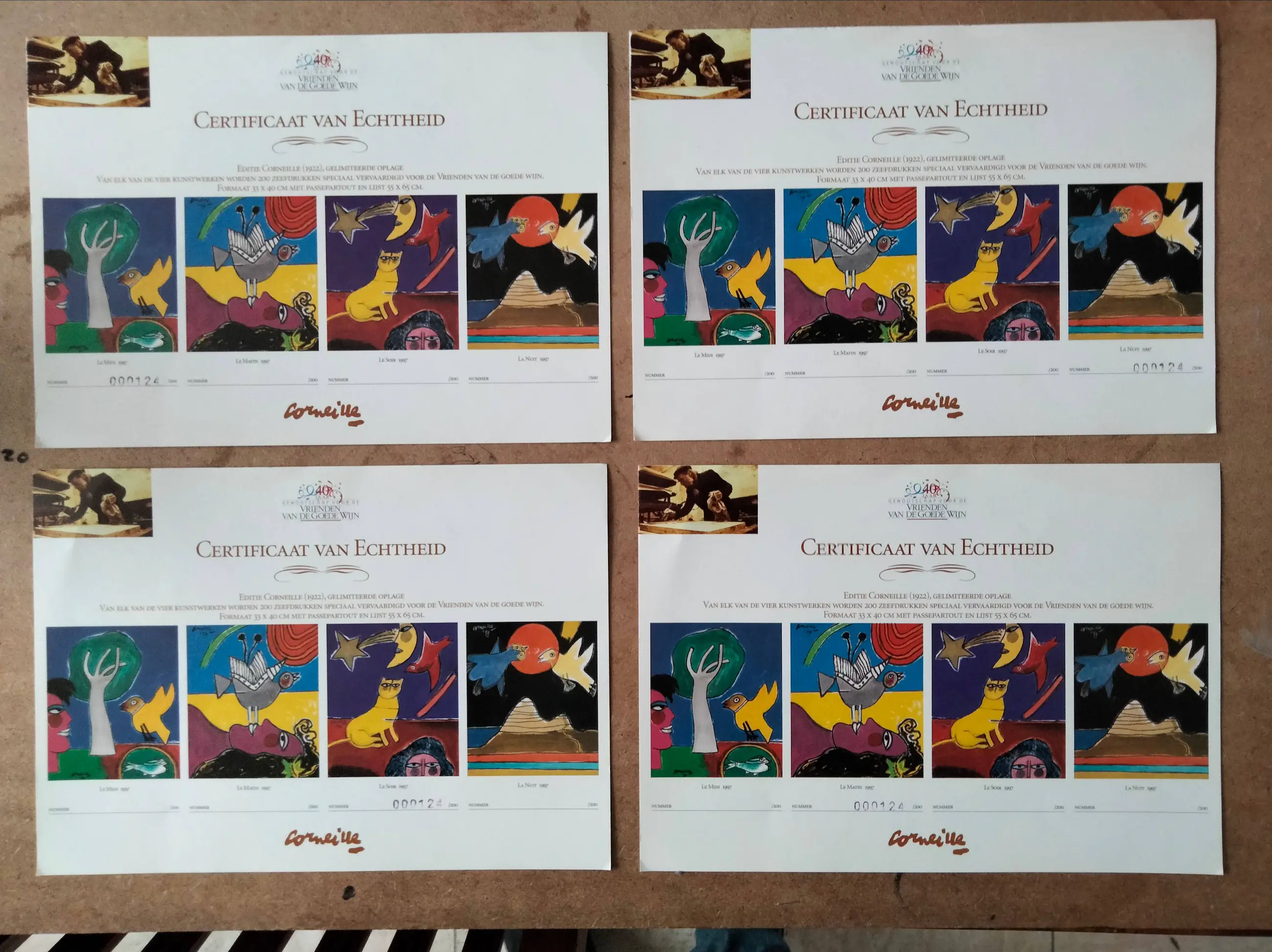 Complete set van vier zeefdrukken gemaakt in 1998 door Corneille speciaal vervaardigd voor de vrienden van de goede wijn. Le midi,Le matin Le Soir,la nuit. De zeefdrukken hebben allemaal hetzelfde oplage nummer 124/200. En komen allemaal met een certificaat,dus 4 certificaten.