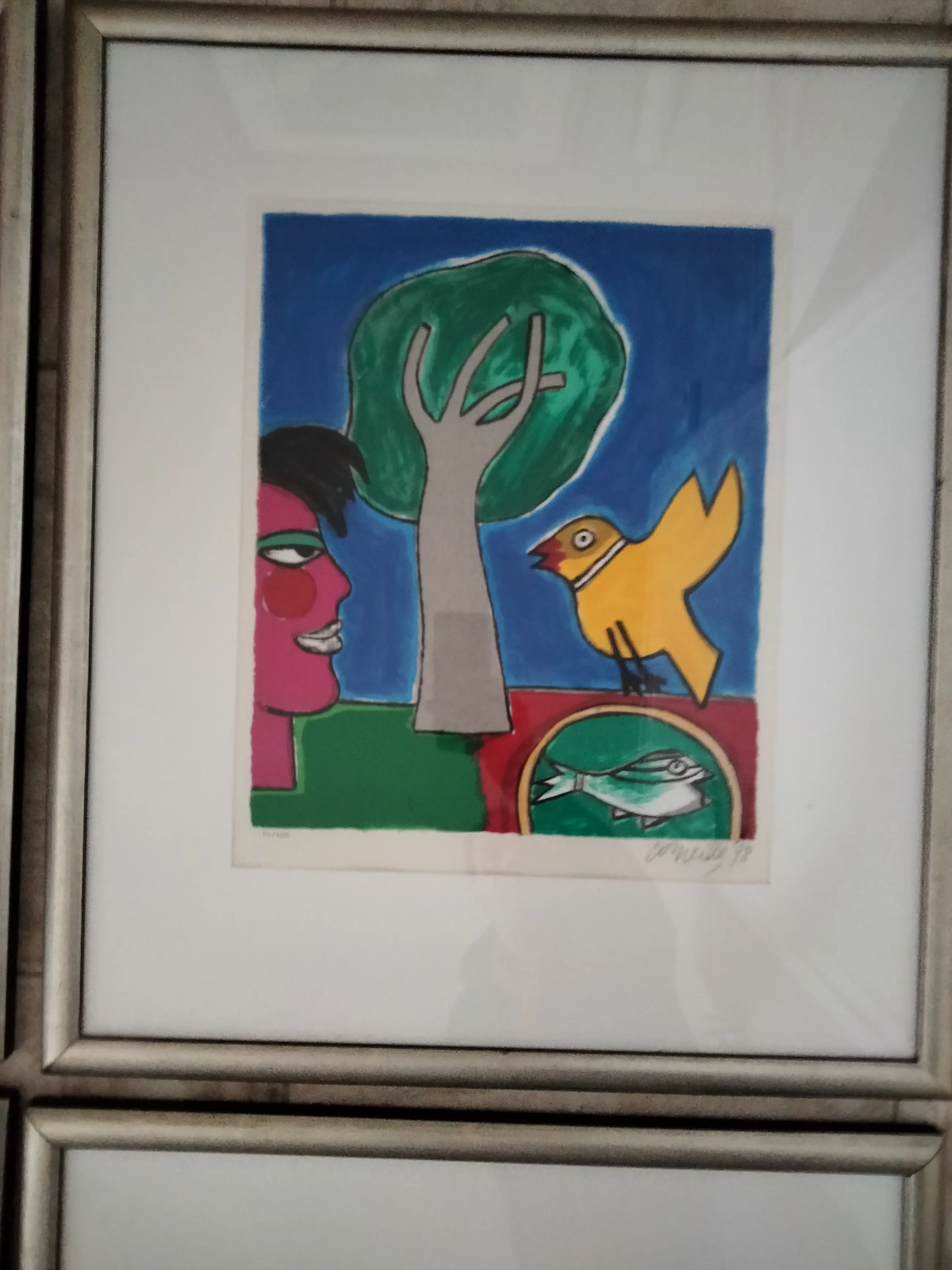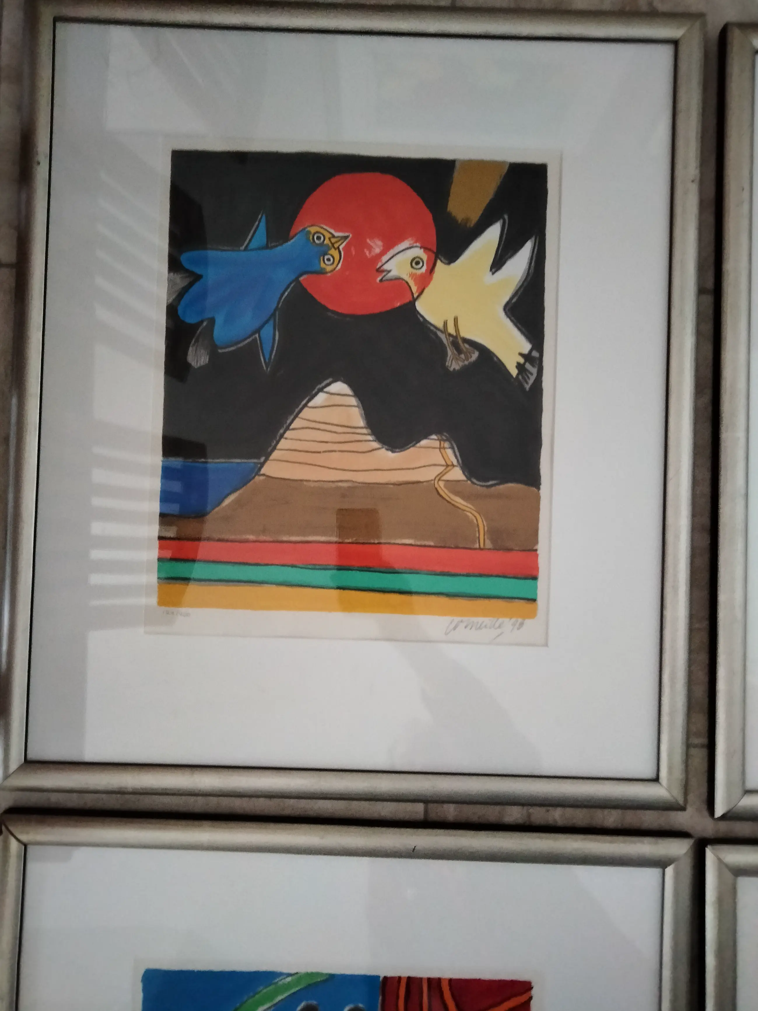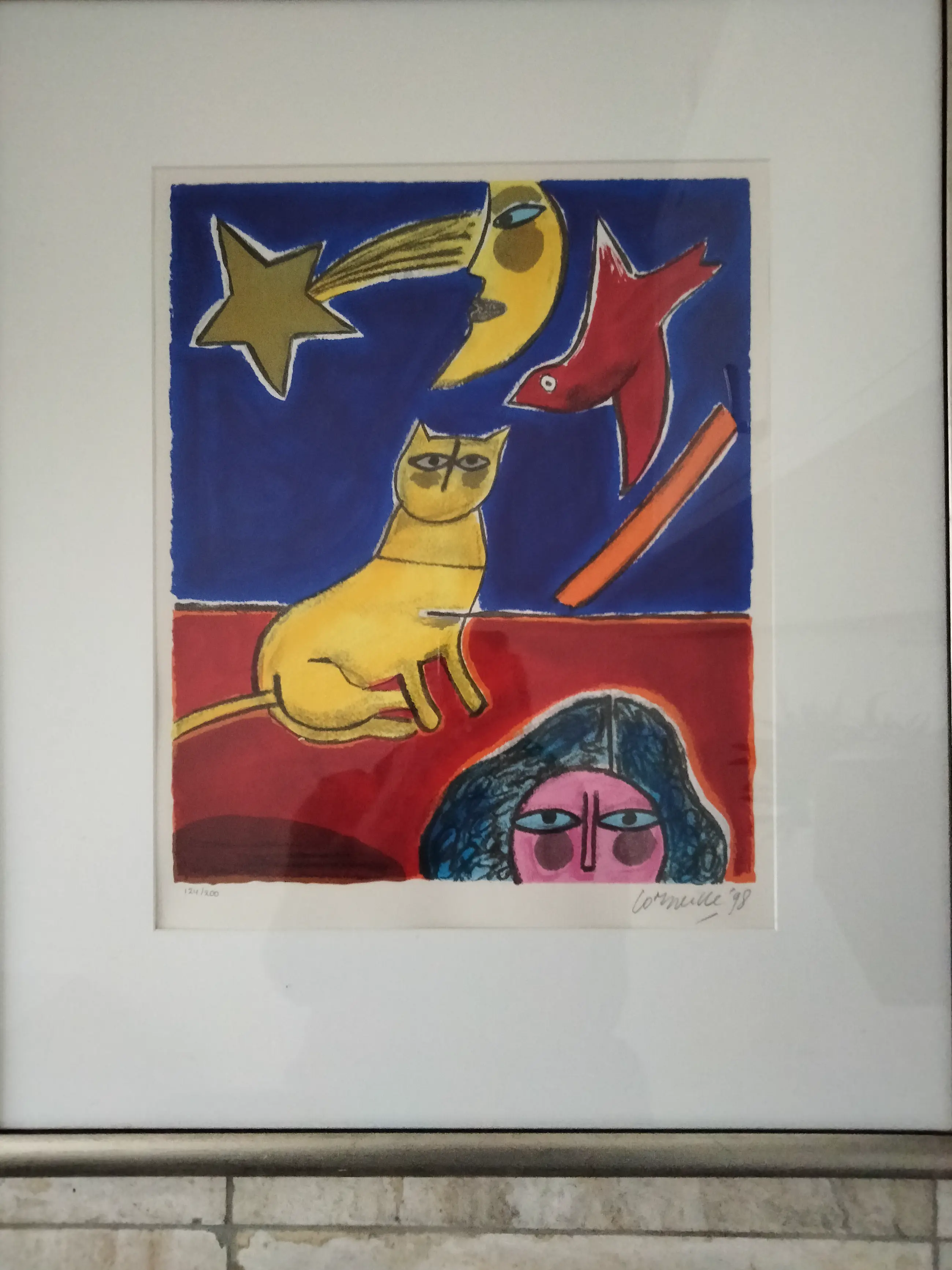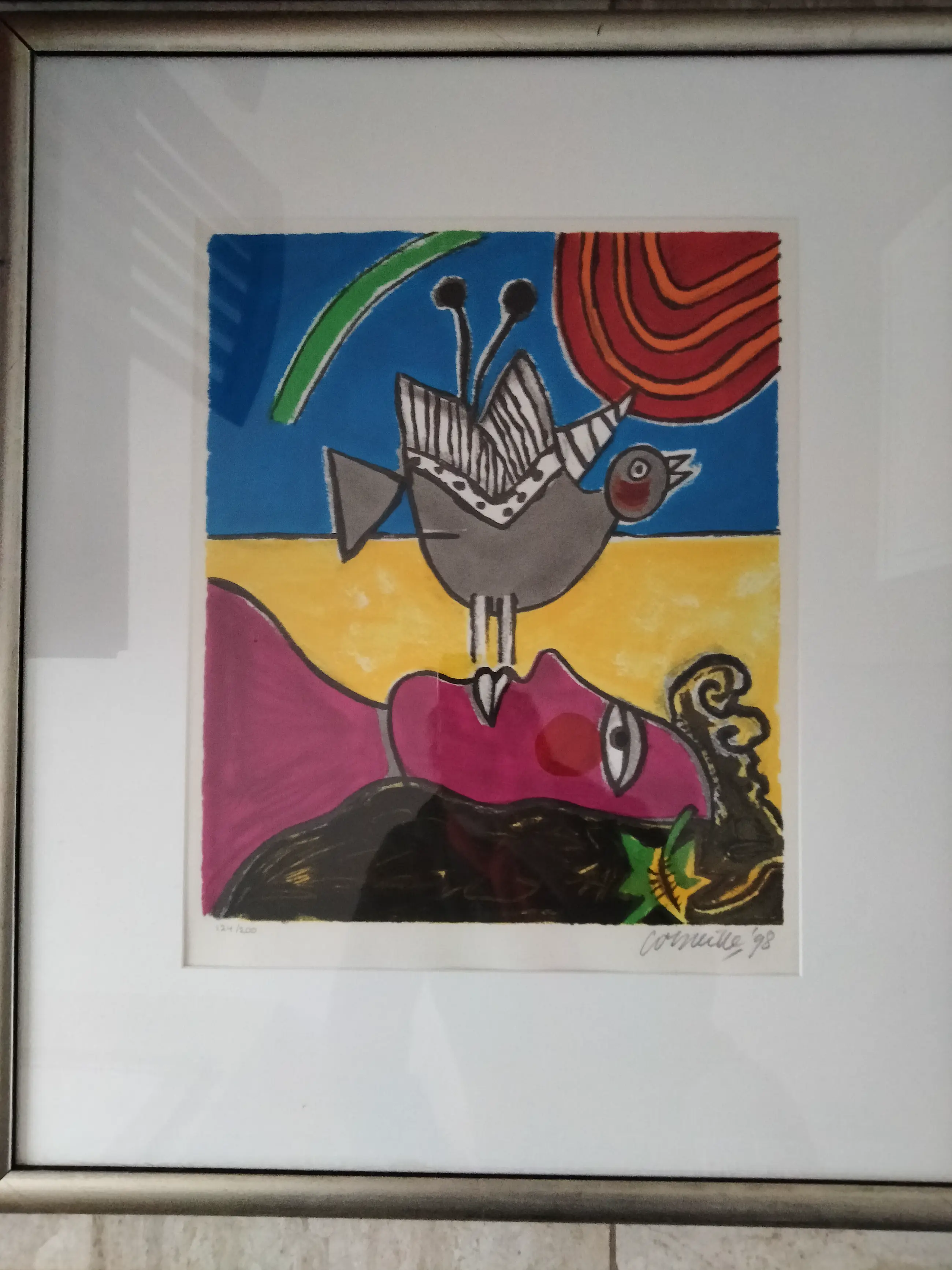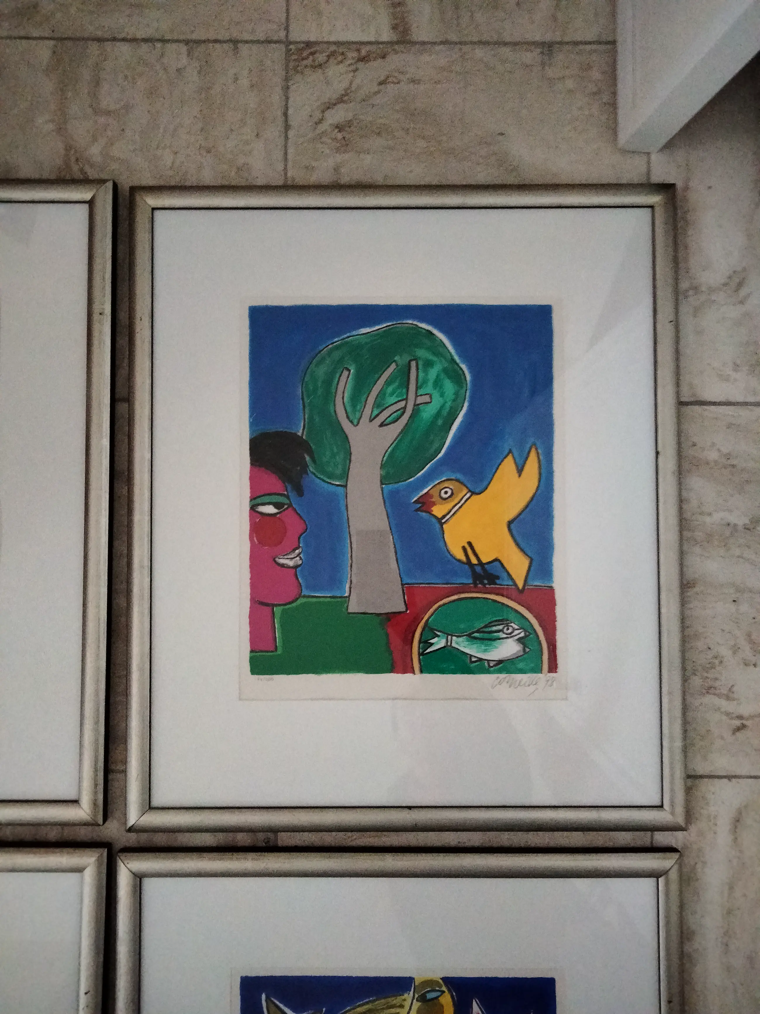 Complete set van vier zeefdrukken gemaakt in 1998 door Corneille speciaal vervaardigd voor de vrienden van de goede wijn. Le midi,Le matin Le Soir,la nuit. De zeefdrukken hebben allemaal hetzelfde oplage nummer 124/200. En komen allemaal met een certificaat,dus 4 certificaten.