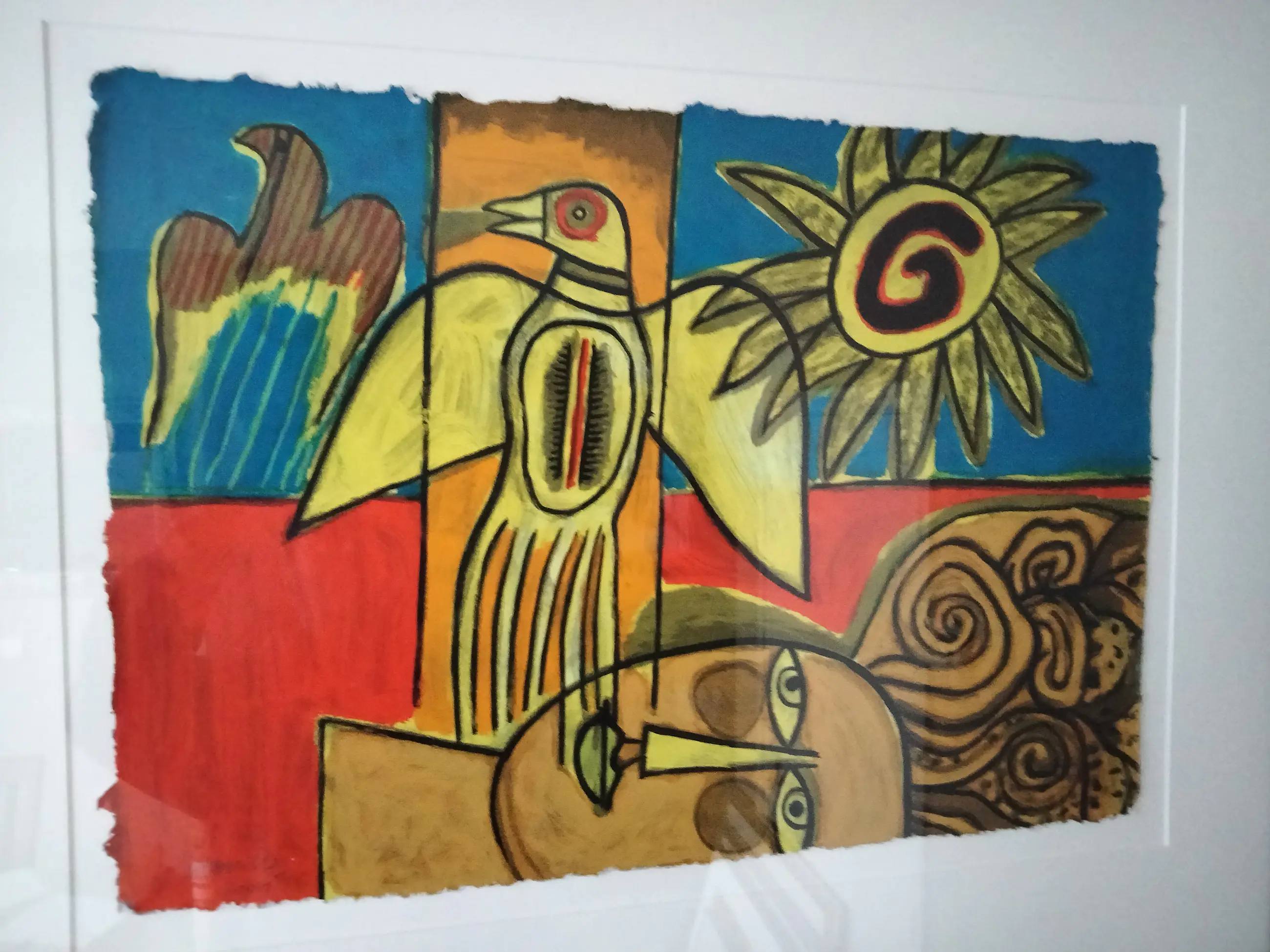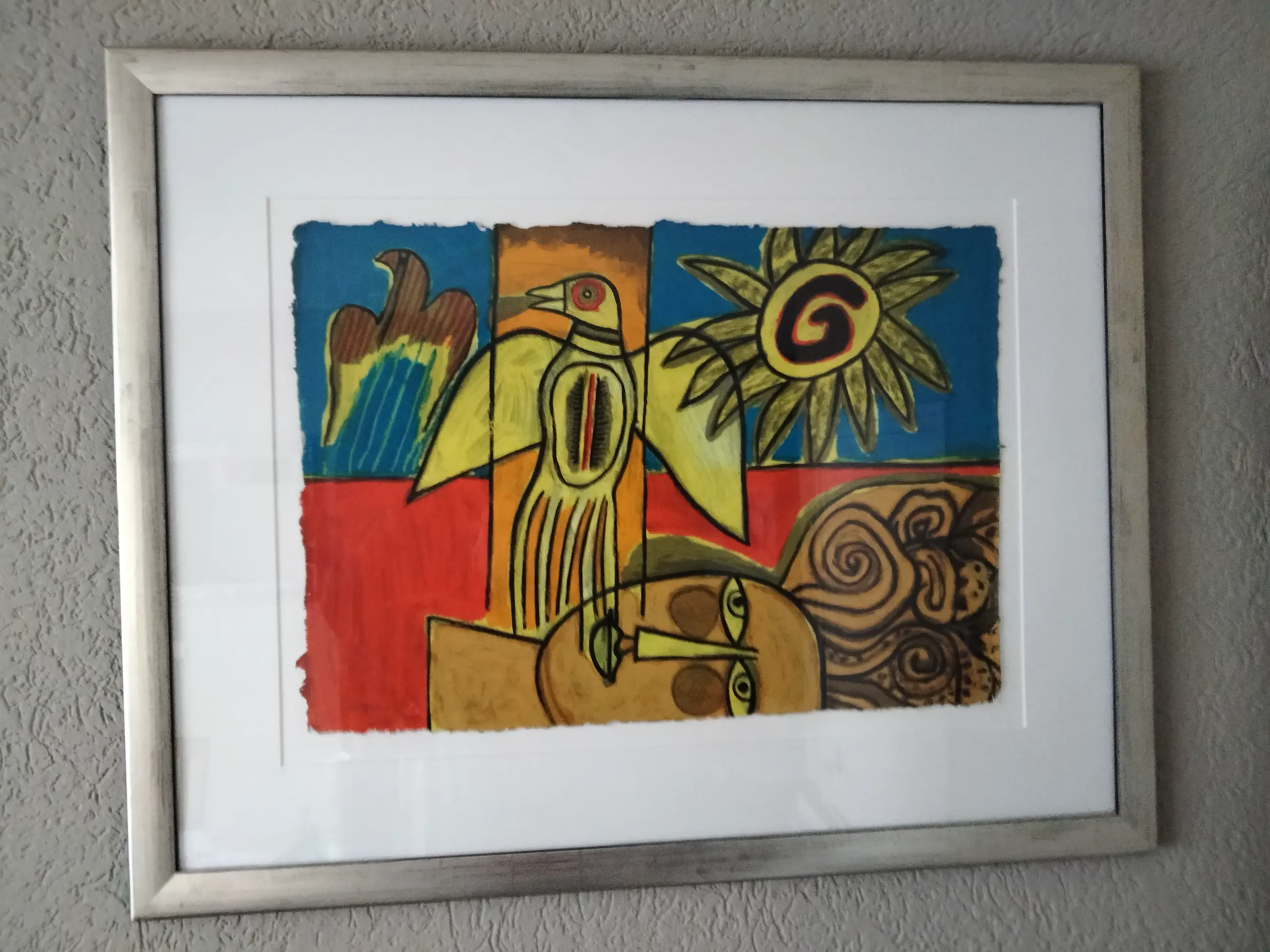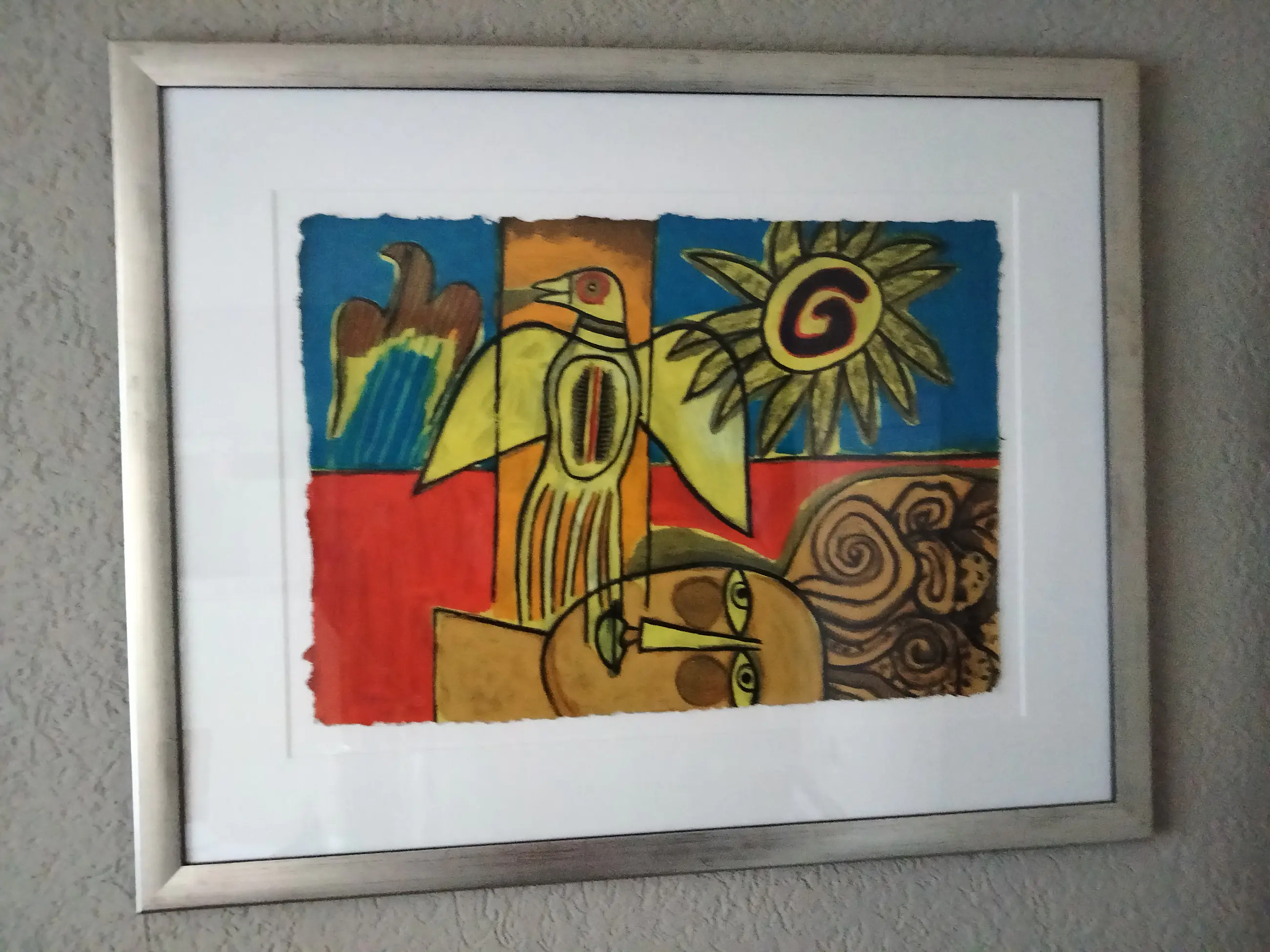 Zeer mooie kleurrijke zeefdruk van corneille op dun papier getiteld:Le oiseau et son double uit 2001 De druk omvat het gehele papier tot aan de rafelige randen. Super mooi en strak ingelijst,ophangklaar. apart en uniek werk. Oplage nummer :74/150 Uiteraard potlood gesigneerd gedateerd en genummerd door corneille.