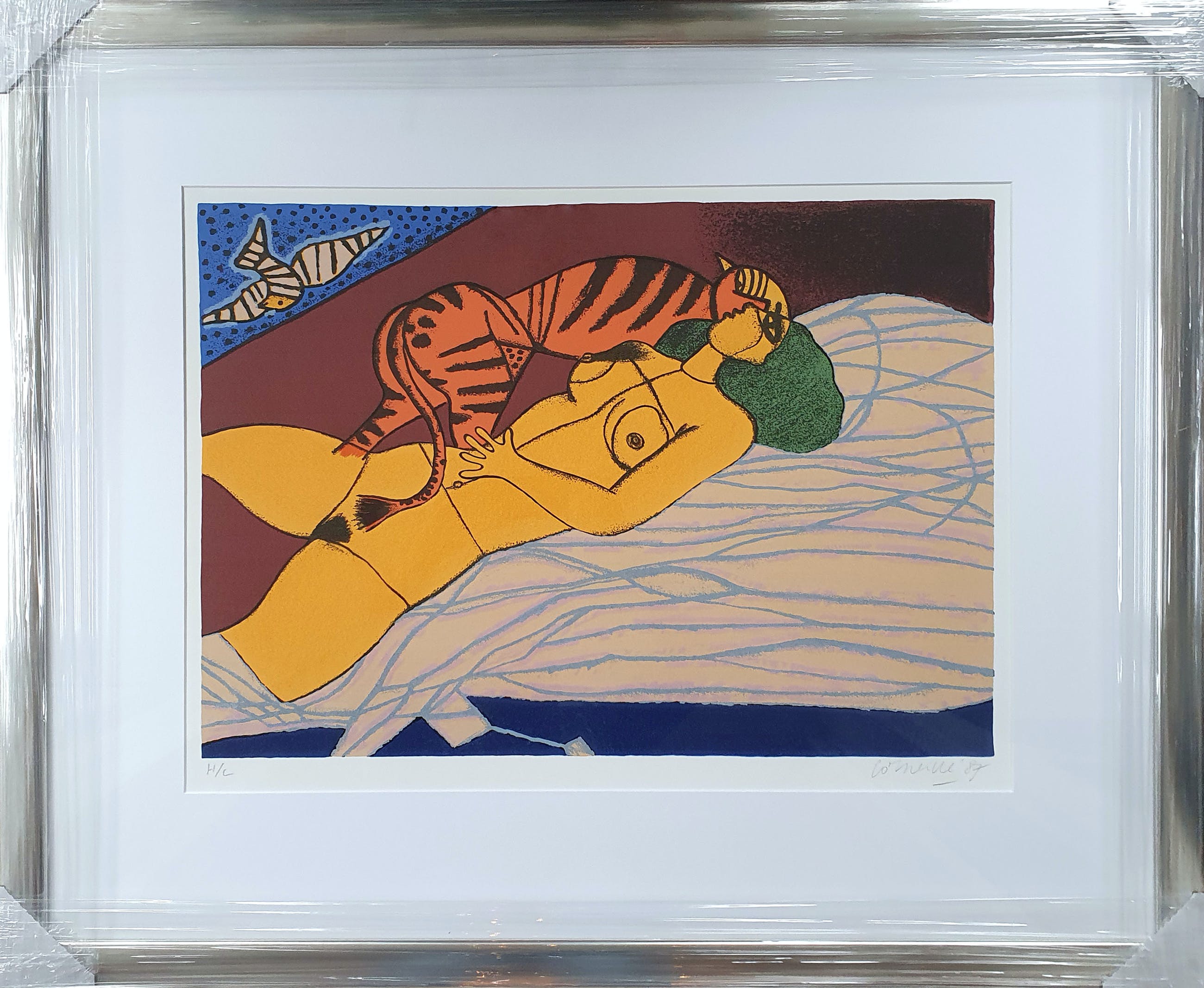 Lithografie van Corneille met de titel: 'Le tigre Amoureaux'. Het werk is rechtsonder met de hand gesigneerd en gedateerd ('87) door de kunstenaar.