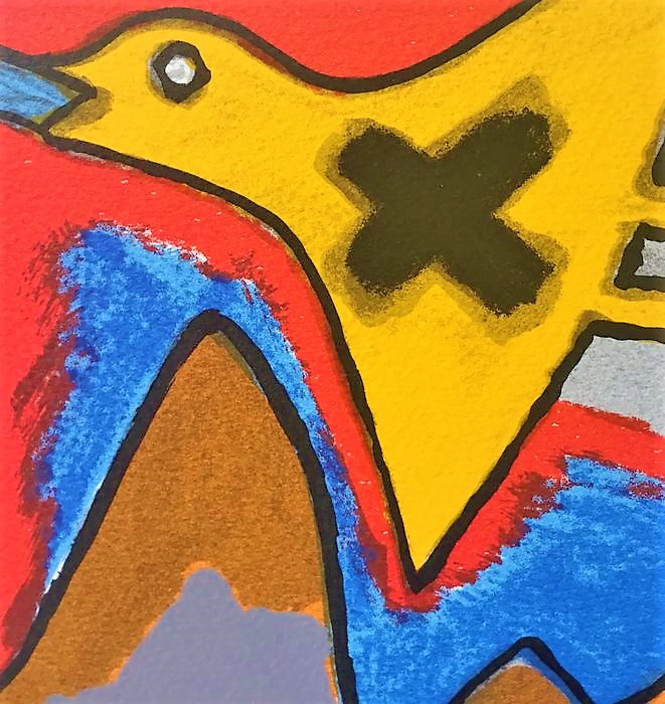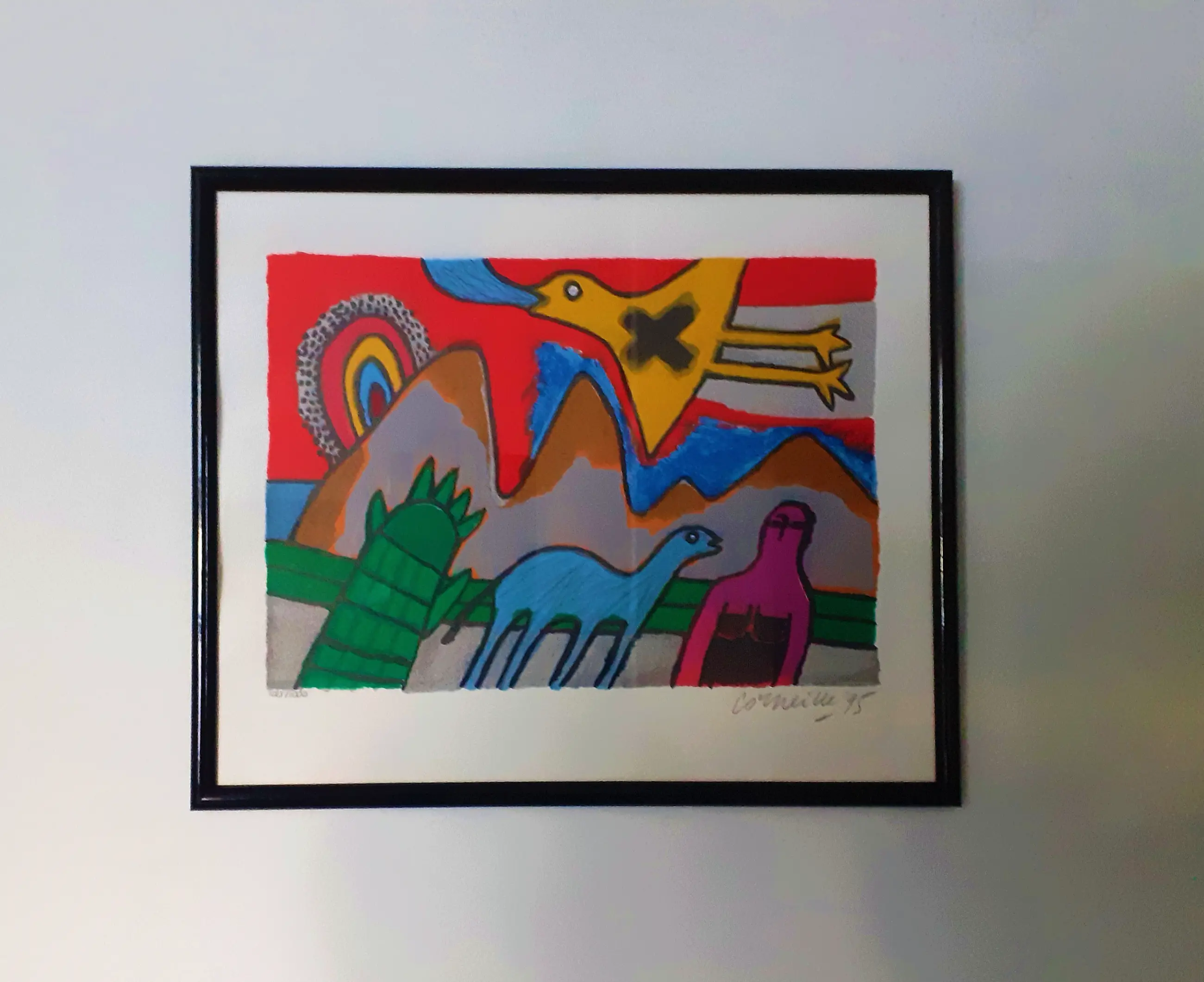 Zeer kleurrijke zeefdruk 'Le Voyage' van de hand van Corneille met de voor hem zo kenmerkende onderwerpen: vogel, vrouw, zon. (Reflectie van licht op foto)