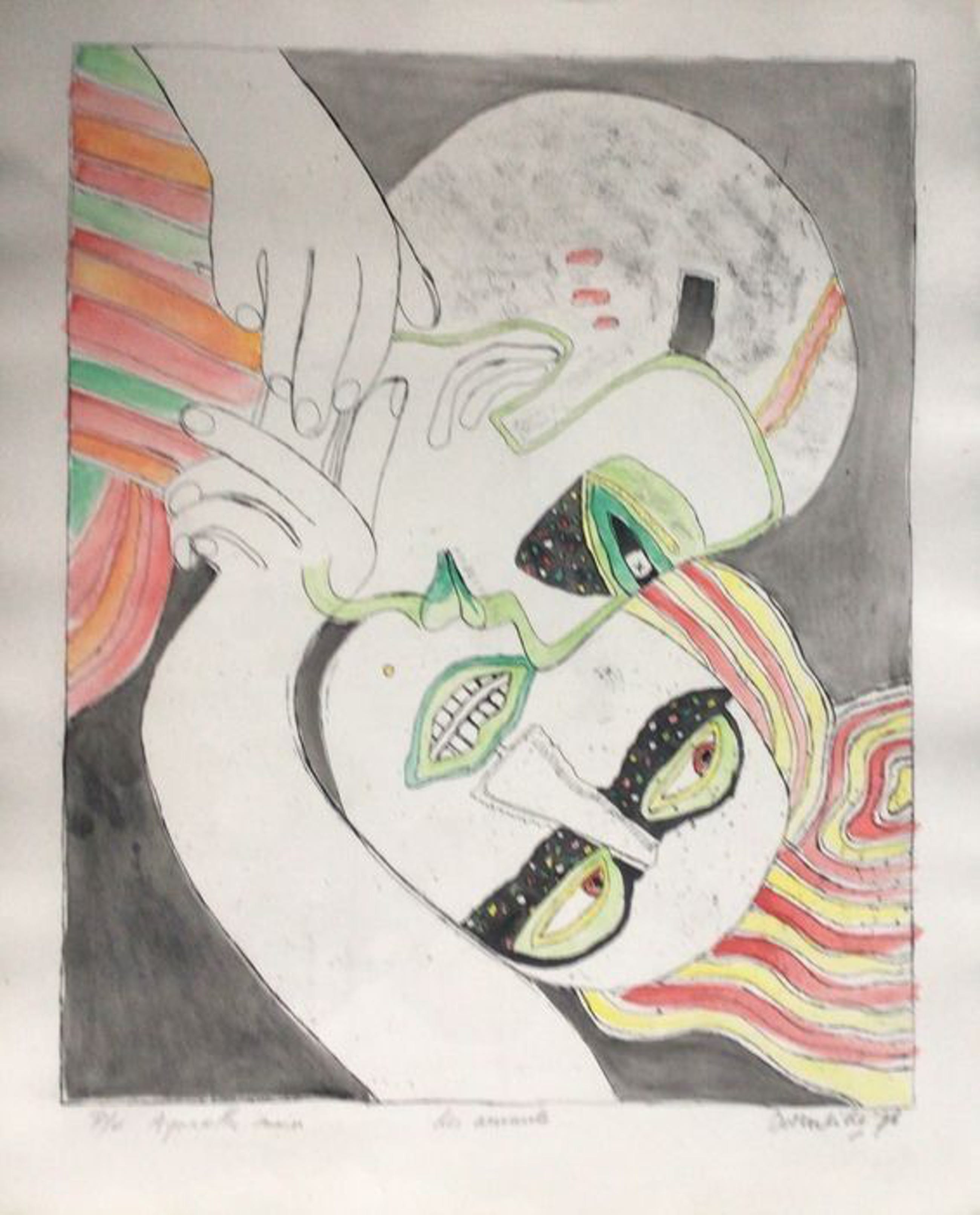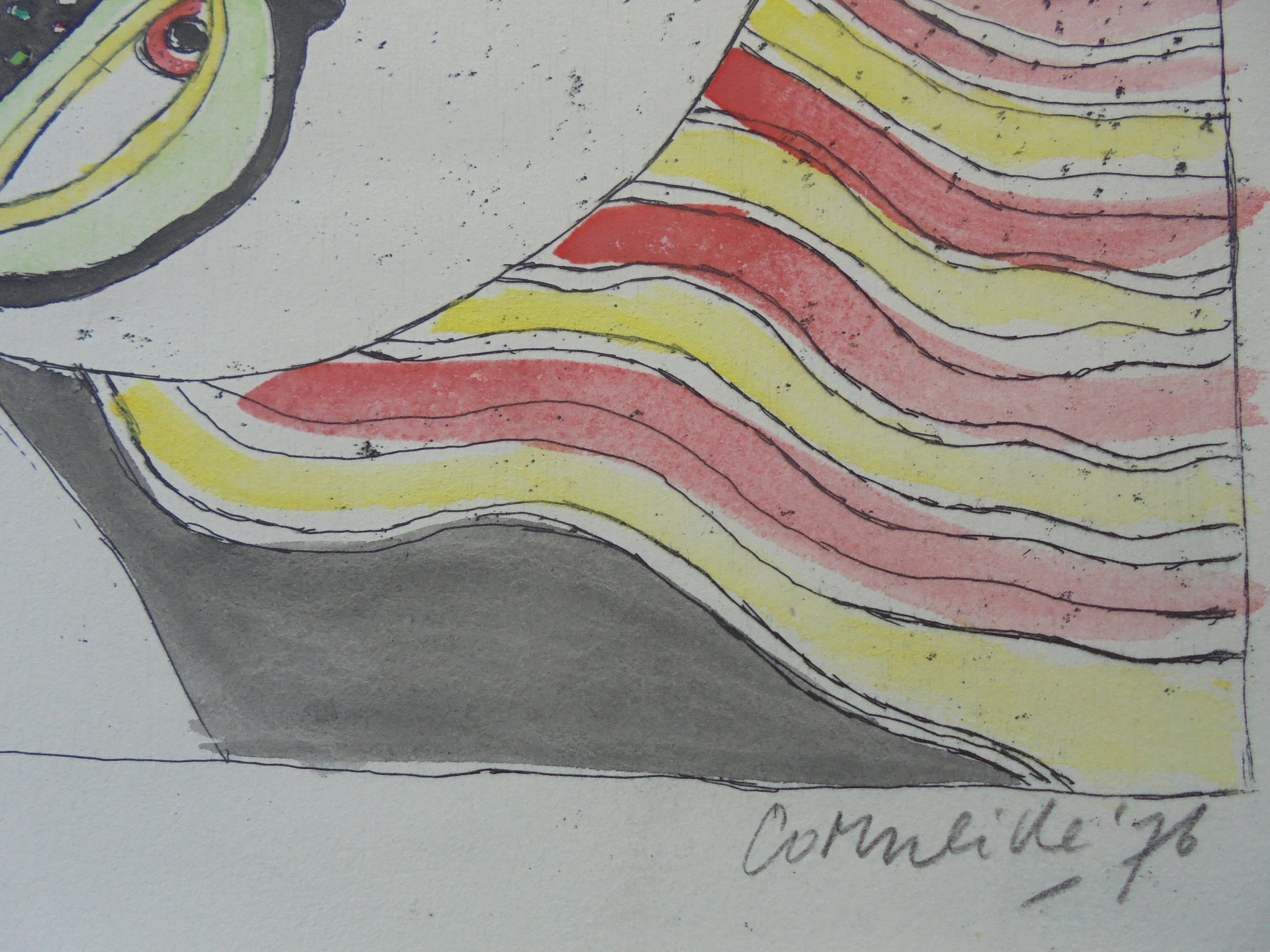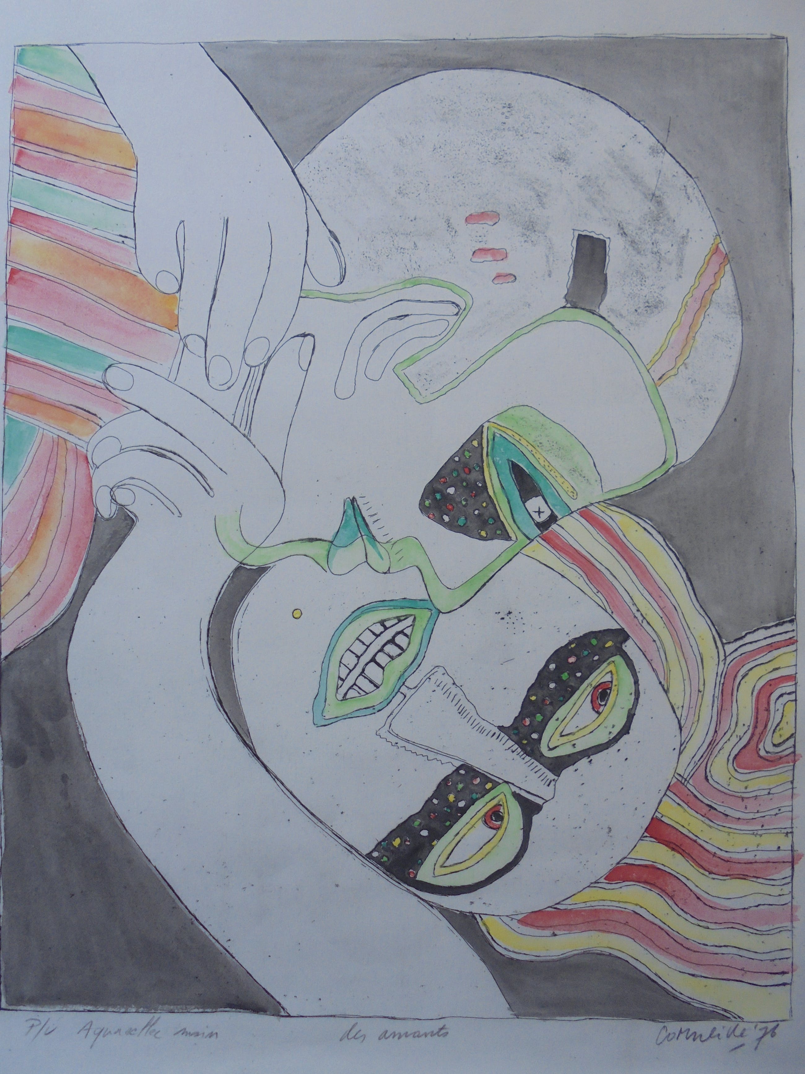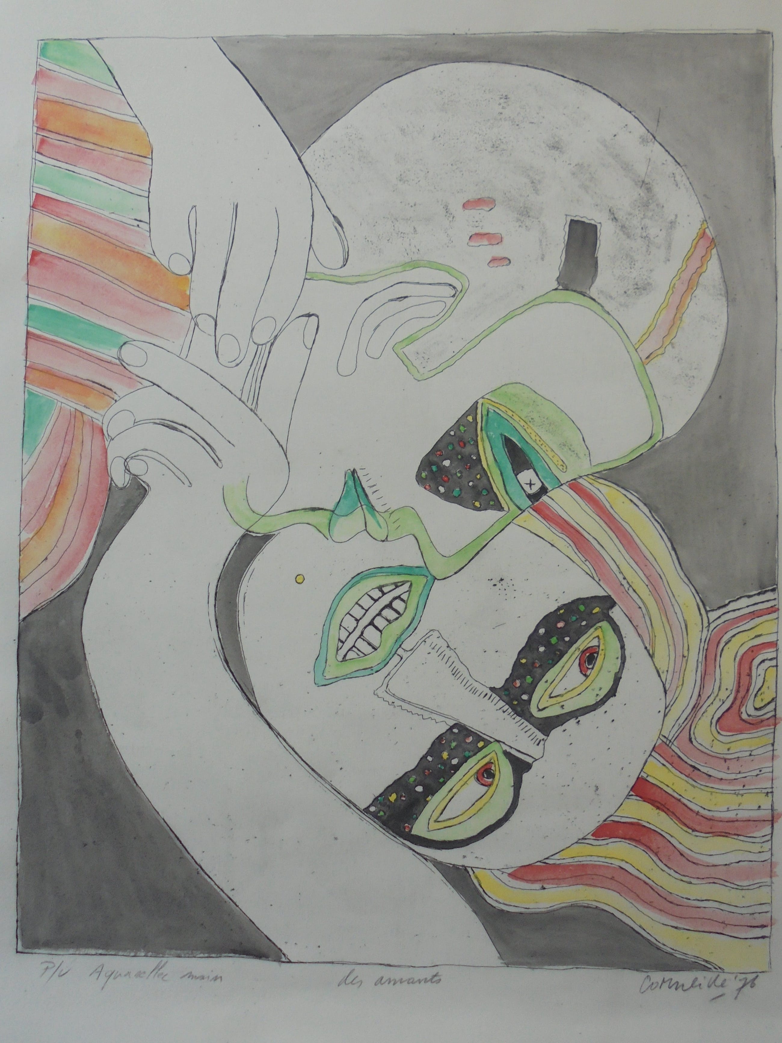 Het gaat om een verhoogde zwart-wit prent die door Corneille met de hand geaquarelleerd werd, zoals door Corneille eigenhandig met potlood geschreven: “Aquarellée main”. Corneille schreef eveneens “P/U”, dit staat voor “Pièce Unique” en bevestigt dat dit een uniek werk is. De verdere beschrijving spreekt voor zich via de foto’s.