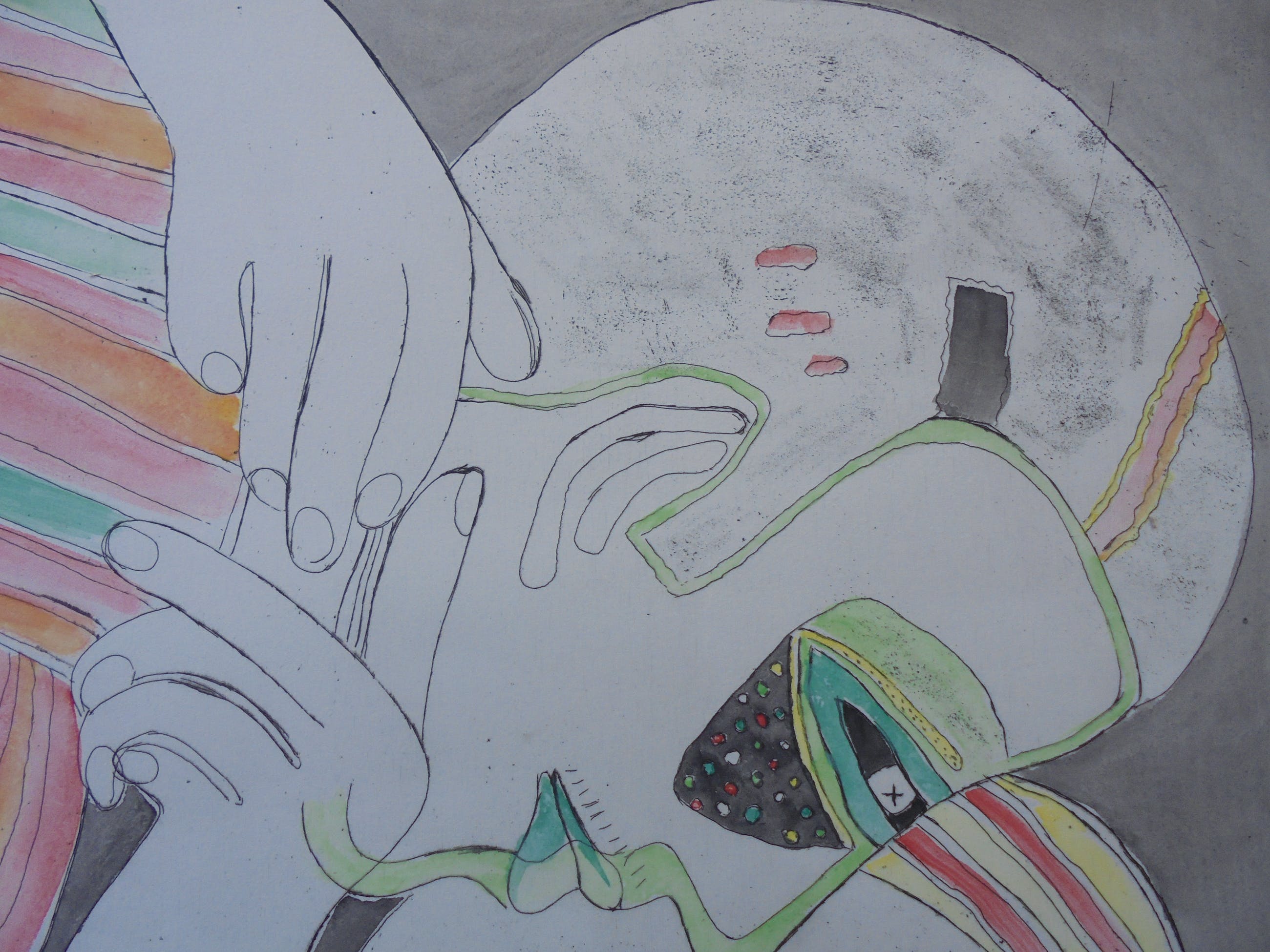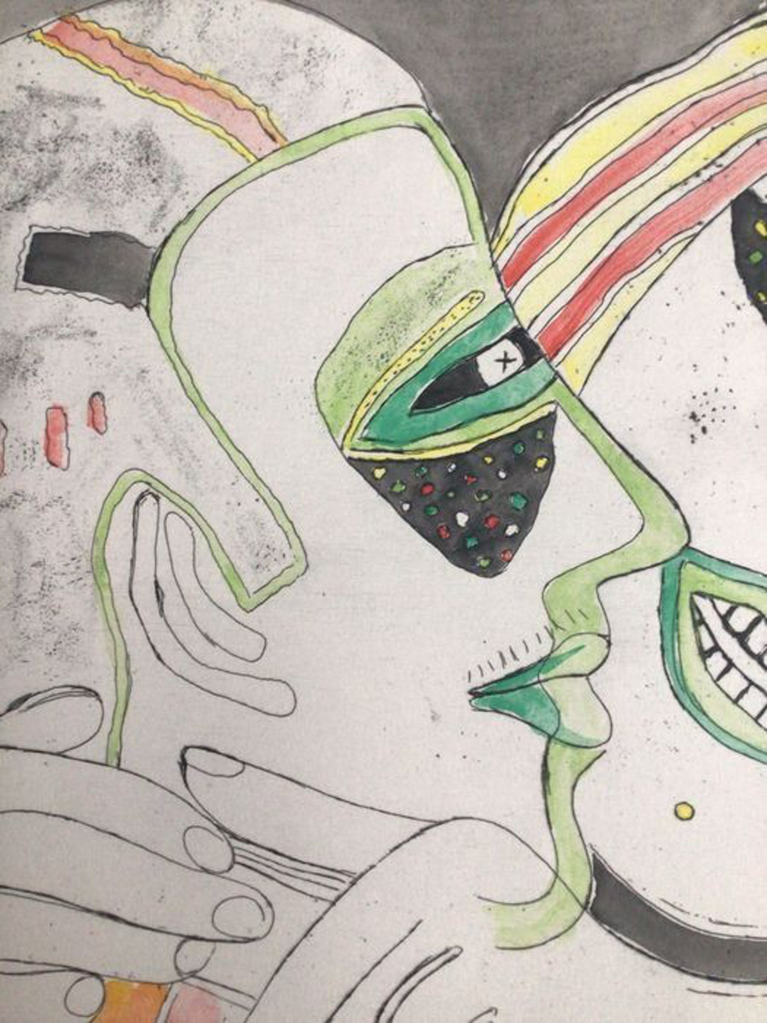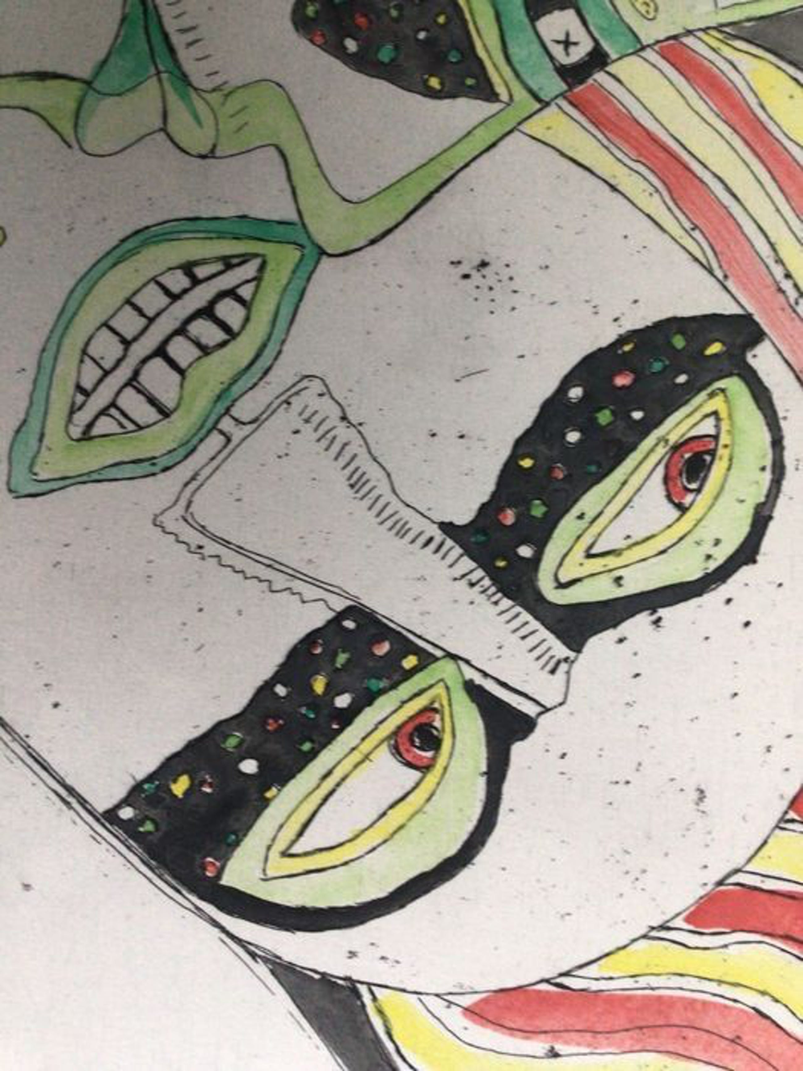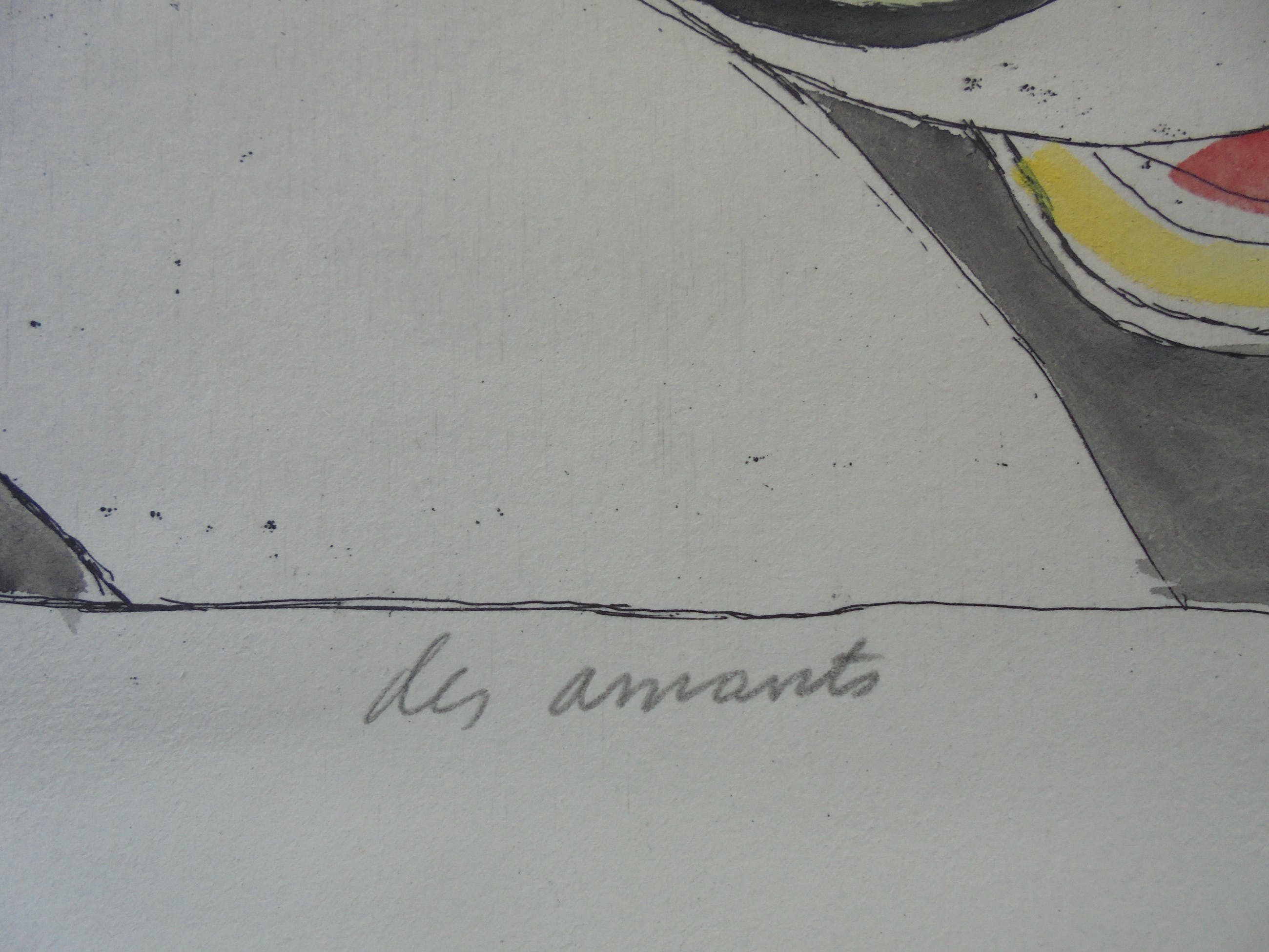Het gaat om een verhoogde zwart-wit prent die door Corneille met de hand geaquarelleerd werd, zoals door Corneille eigenhandig met potlood geschreven: “Aquarellée main”. Corneille schreef eveneens “P/U”, dit staat voor “Pièce Unique” en bevestigt dat dit een uniek werk is. De verdere beschrijving spreekt voor zich via de foto’s.
