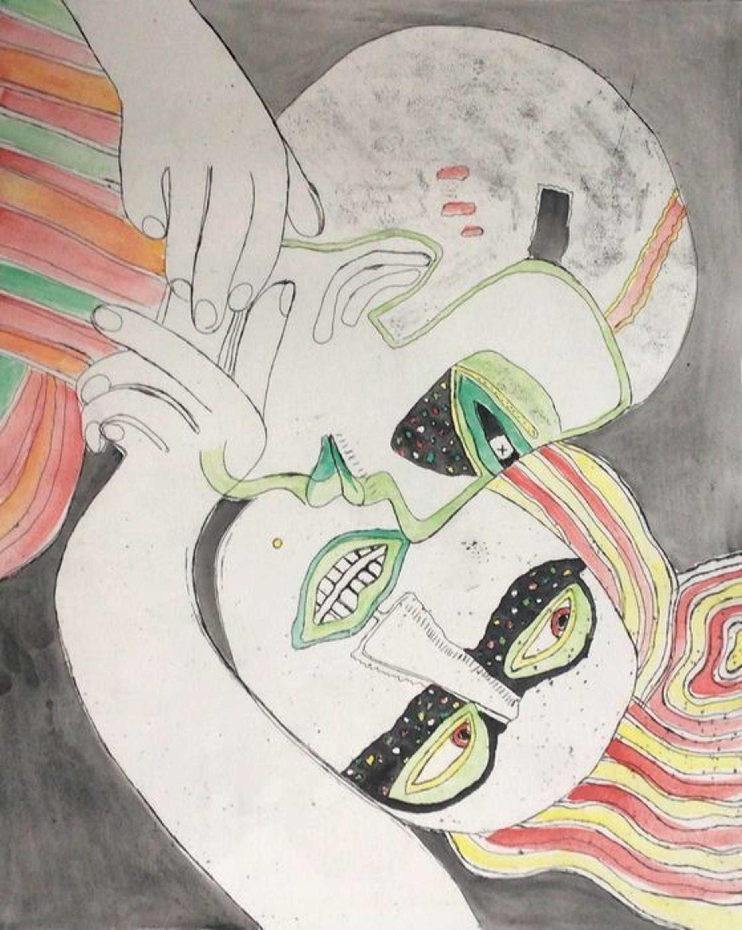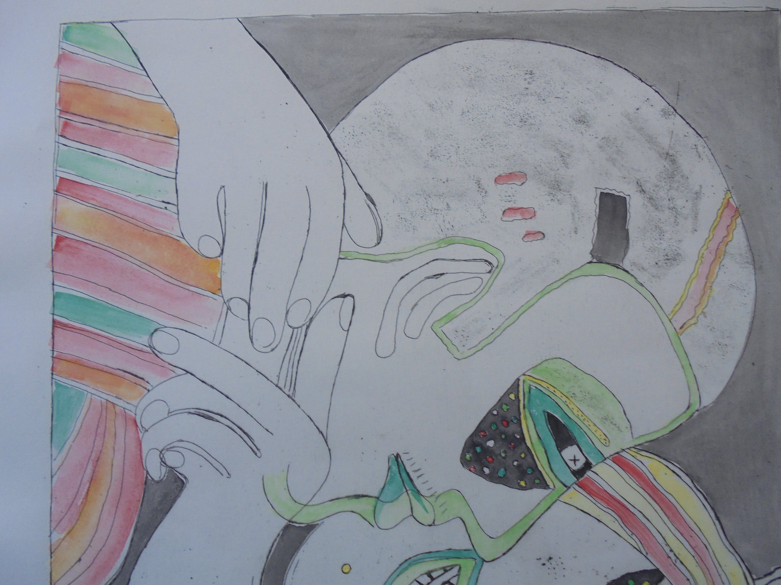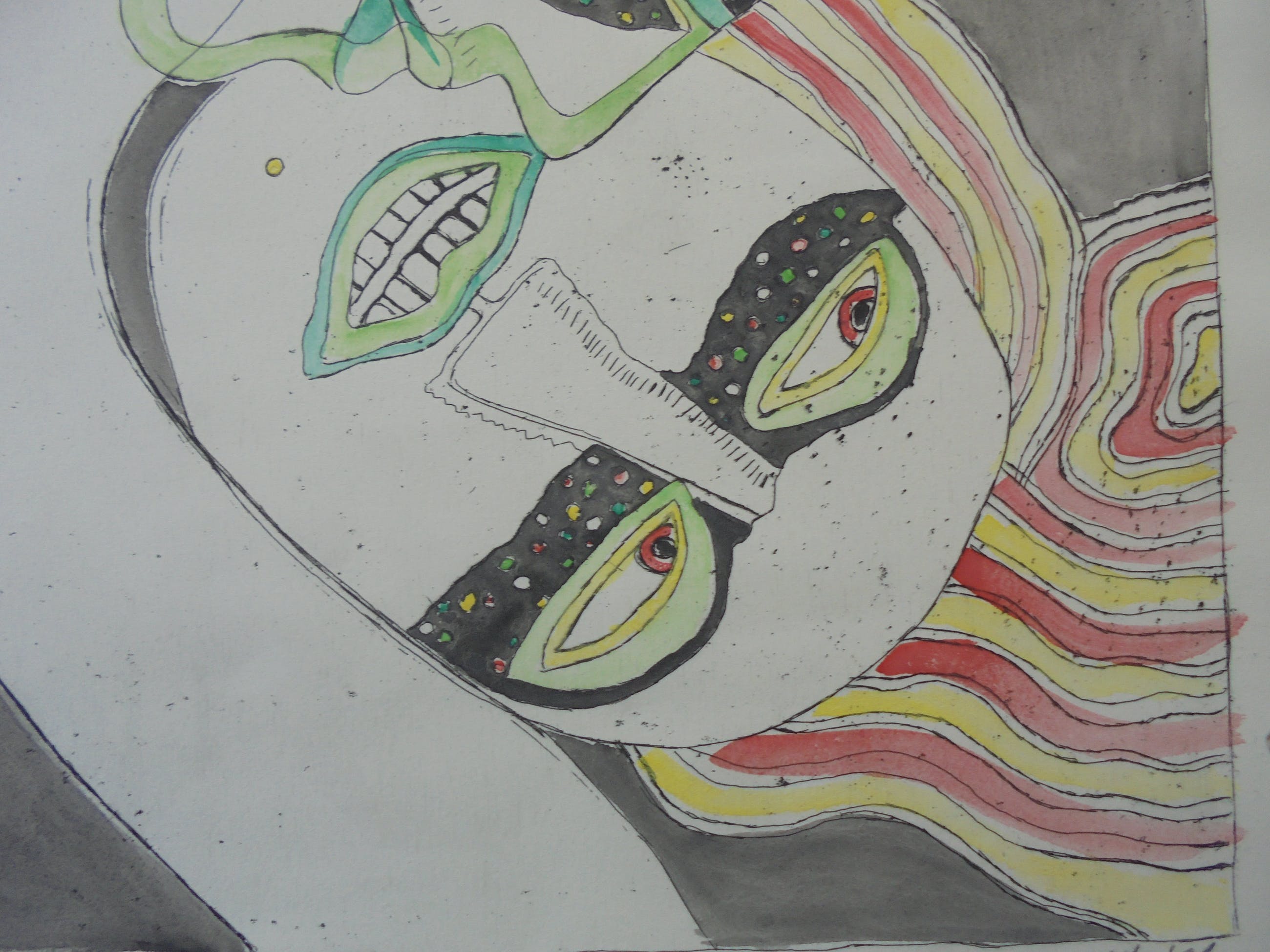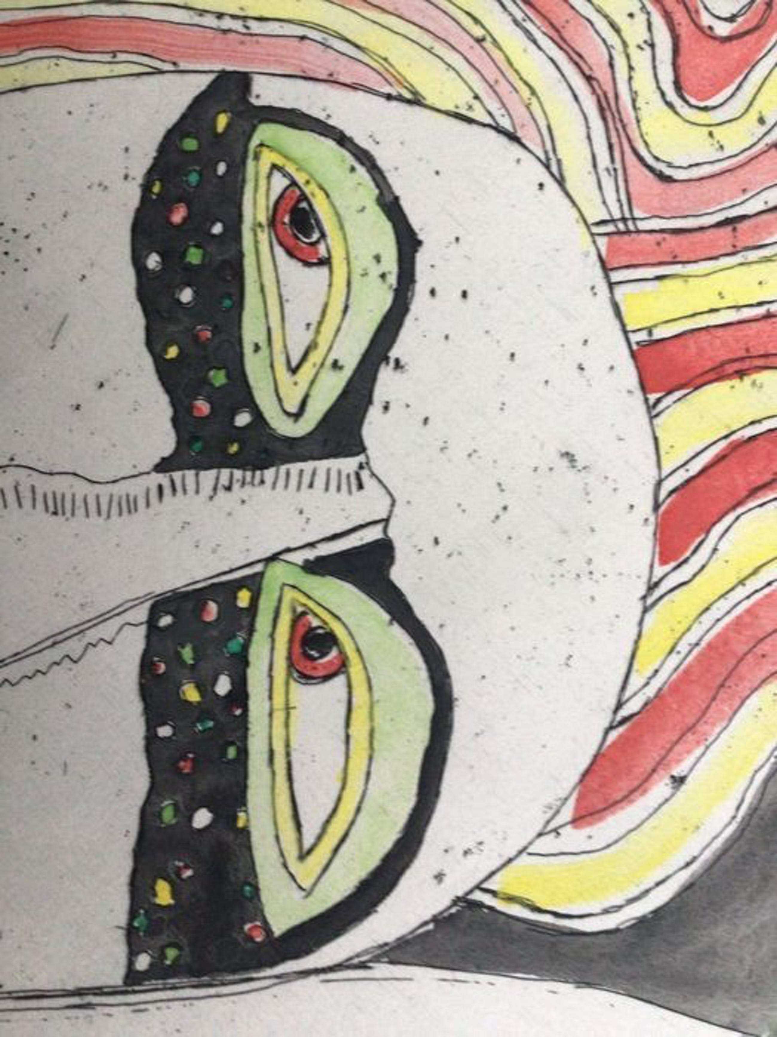 Het gaat om een verhoogde zwart-wit prent die door Corneille met de hand geaquarelleerd werd, zoals door Corneille eigenhandig met potlood geschreven: “Aquarellée main”. Corneille schreef eveneens “P/U”, dit staat voor “Pièce Unique” en bevestigt dat dit een uniek werk is. De verdere beschrijving spreekt voor zich via de foto’s.