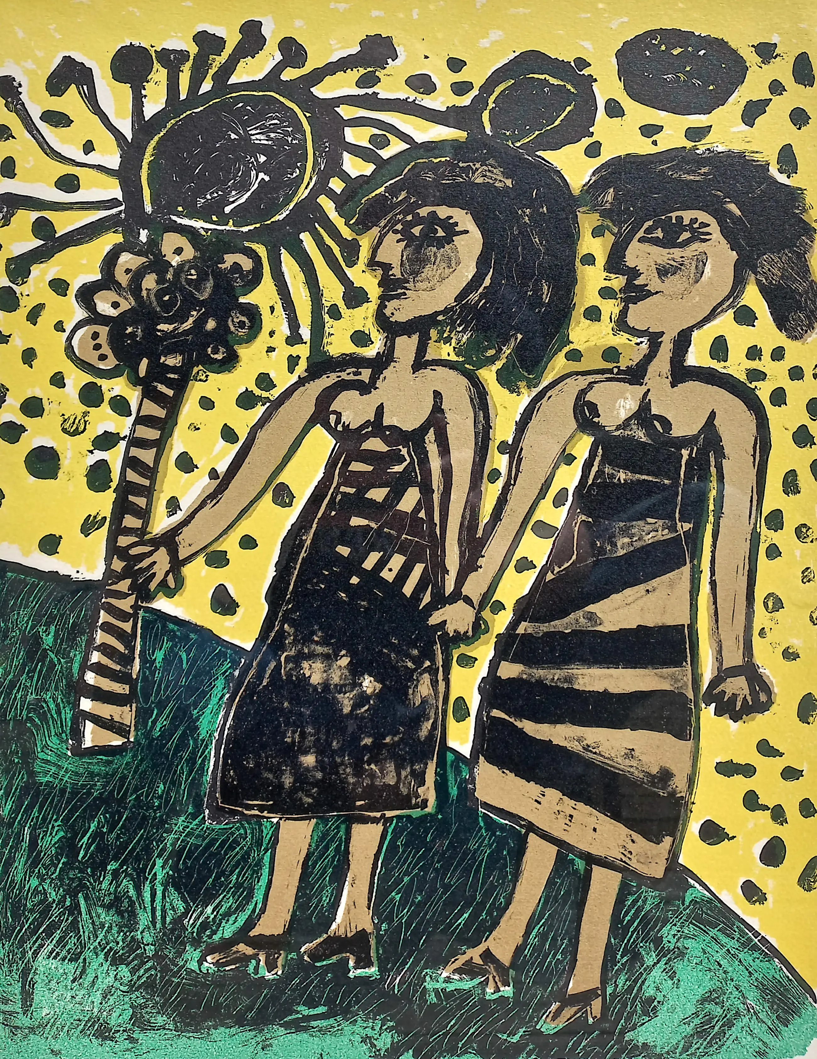 Karakteristieke compositie van Corneille uit 1969. Litho op papier, met potlood gesigneerd, gedateerd en genummerd (56/180). In nette, complementerende lijst, achter glas en met smetteloos, zuurvrij passe-partout. Alles in zeer goede conditie. Literatuur: Donkersloot 230.