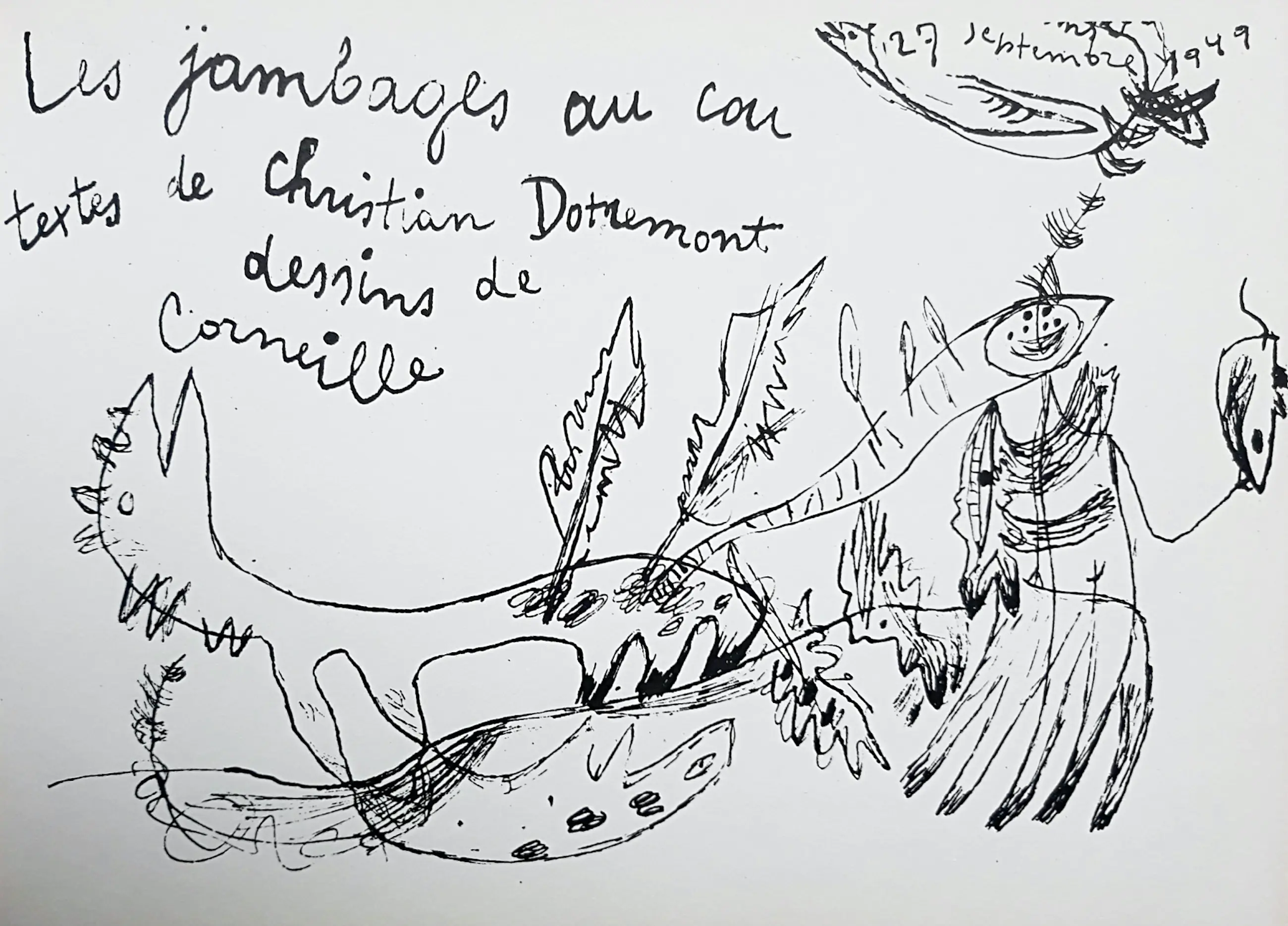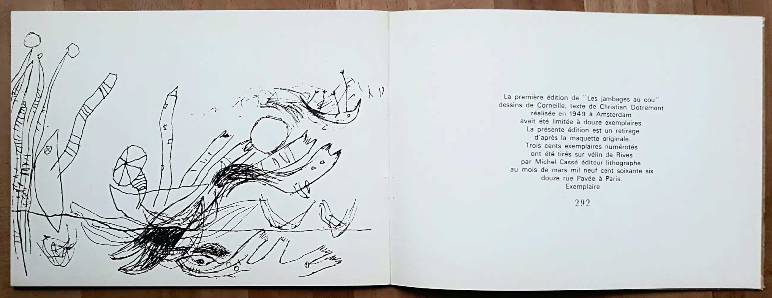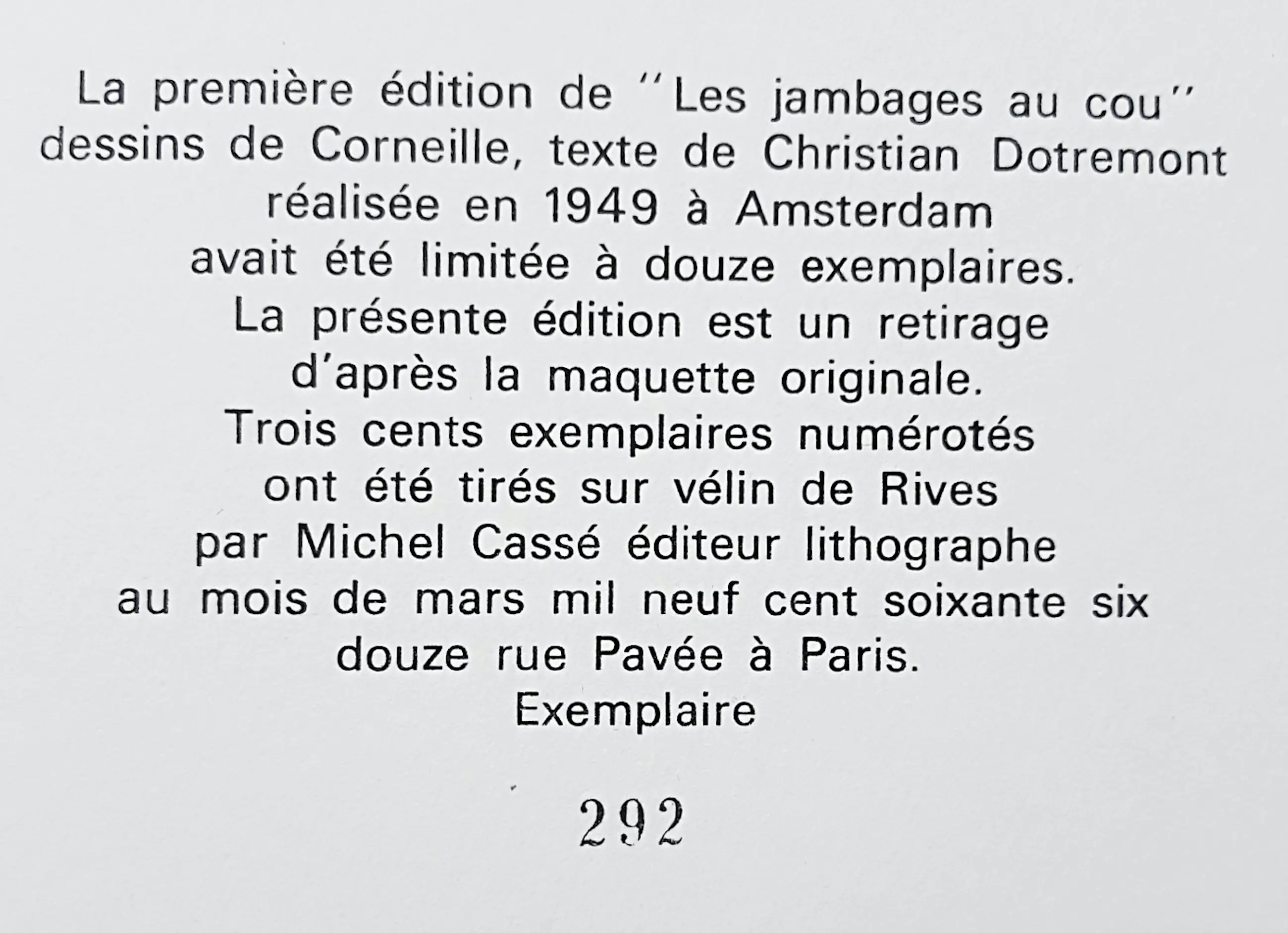 De eerste heruitgave van dit werk dat oorspronkelijk in 1949 verscheen. Negen composities van Corneille met begeleidende tekst van Christian Dotremont, met de originele transparante stofomslag er nog omheen. Uitgave op Rives papier in een oplage van 300 exemplaren, dit is exemplaar 292. In zeer goede conditie. Literatuur: Donkersloot 5 (voetnoot).