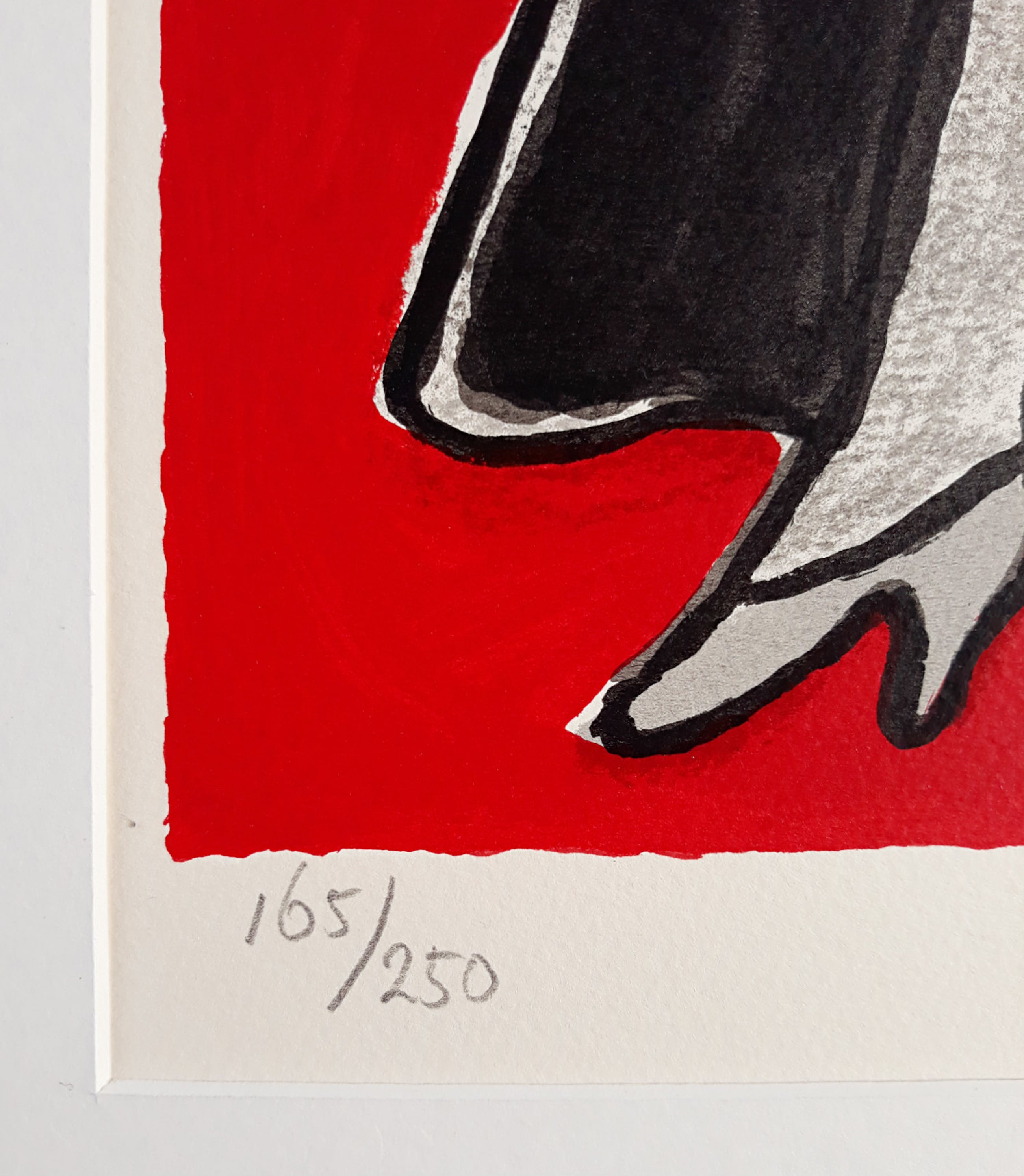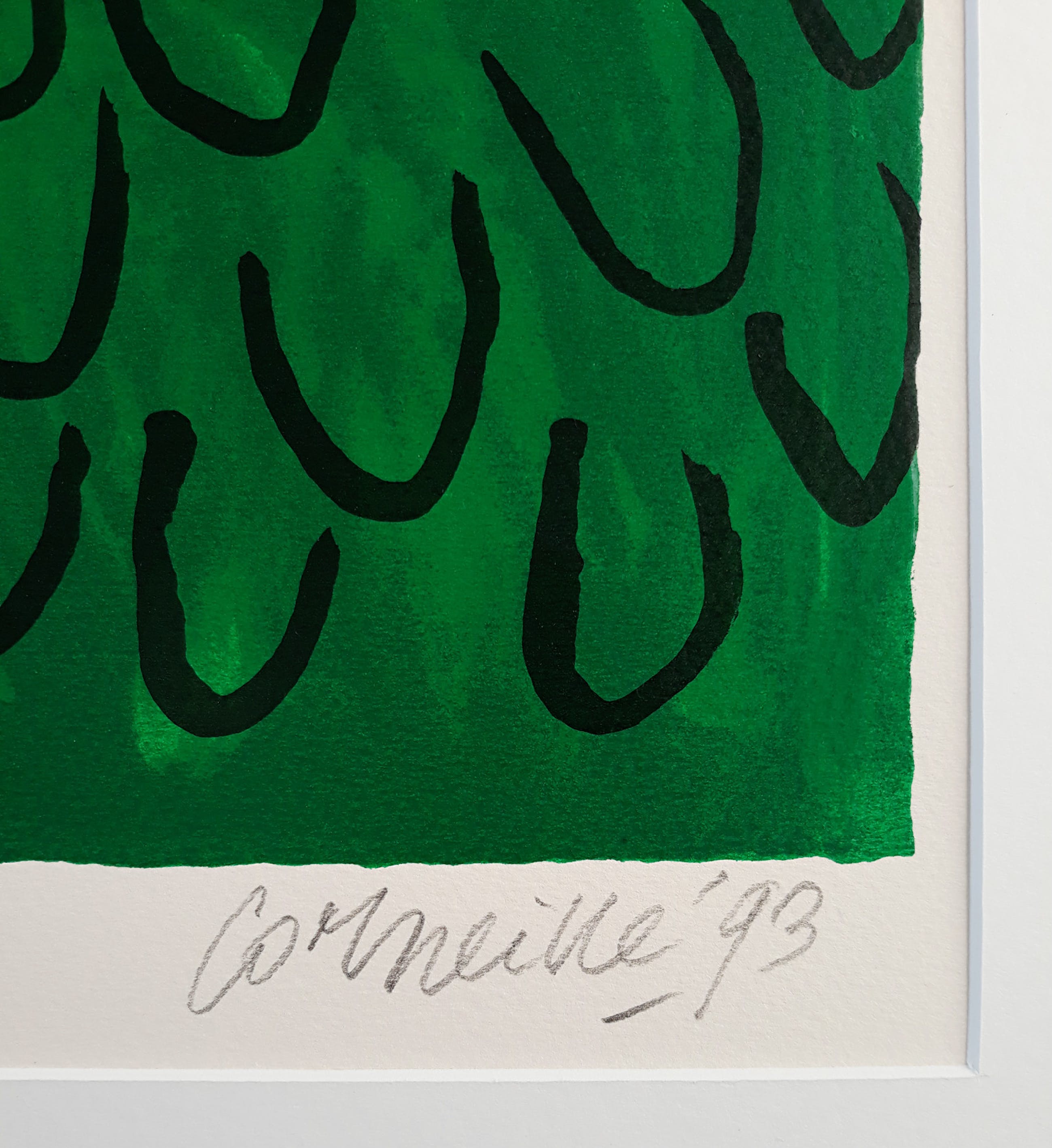 Kleurrijk, karakteristiek werk van Corneille. Zeefdruk op geschept papier, met potlood gesigneerd, gedateerd (‘93) en genummerd (165/250). Het blad is aan de bovenkant netjes gemonteerd in een smetteloos, zuurvrij passe-partout. Alles in uitstekende conditie.