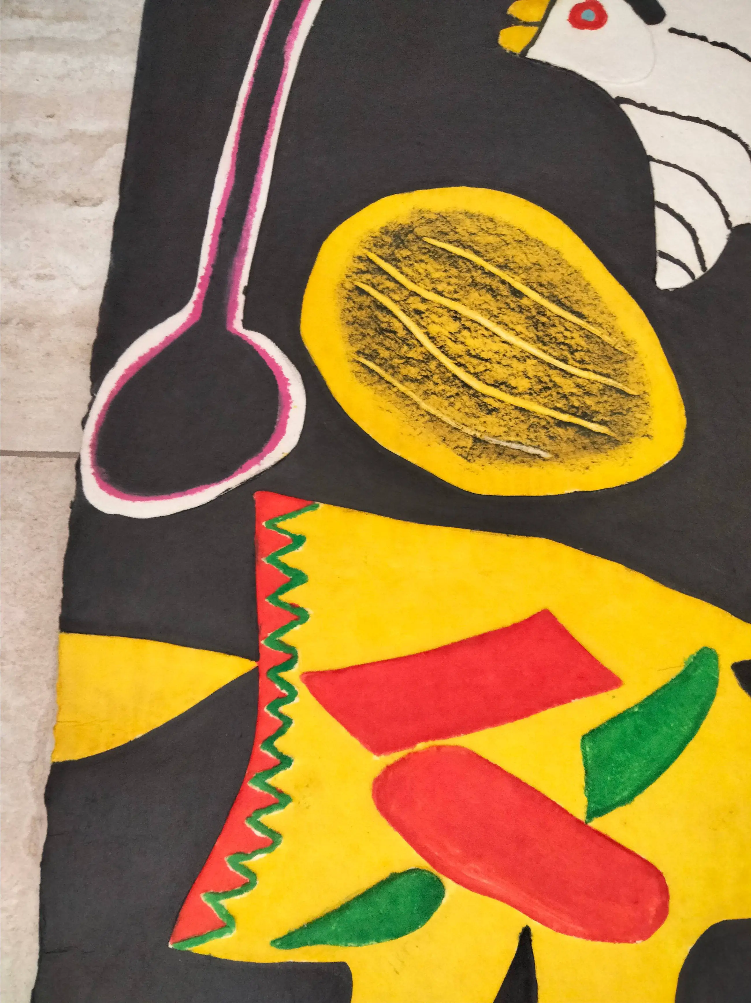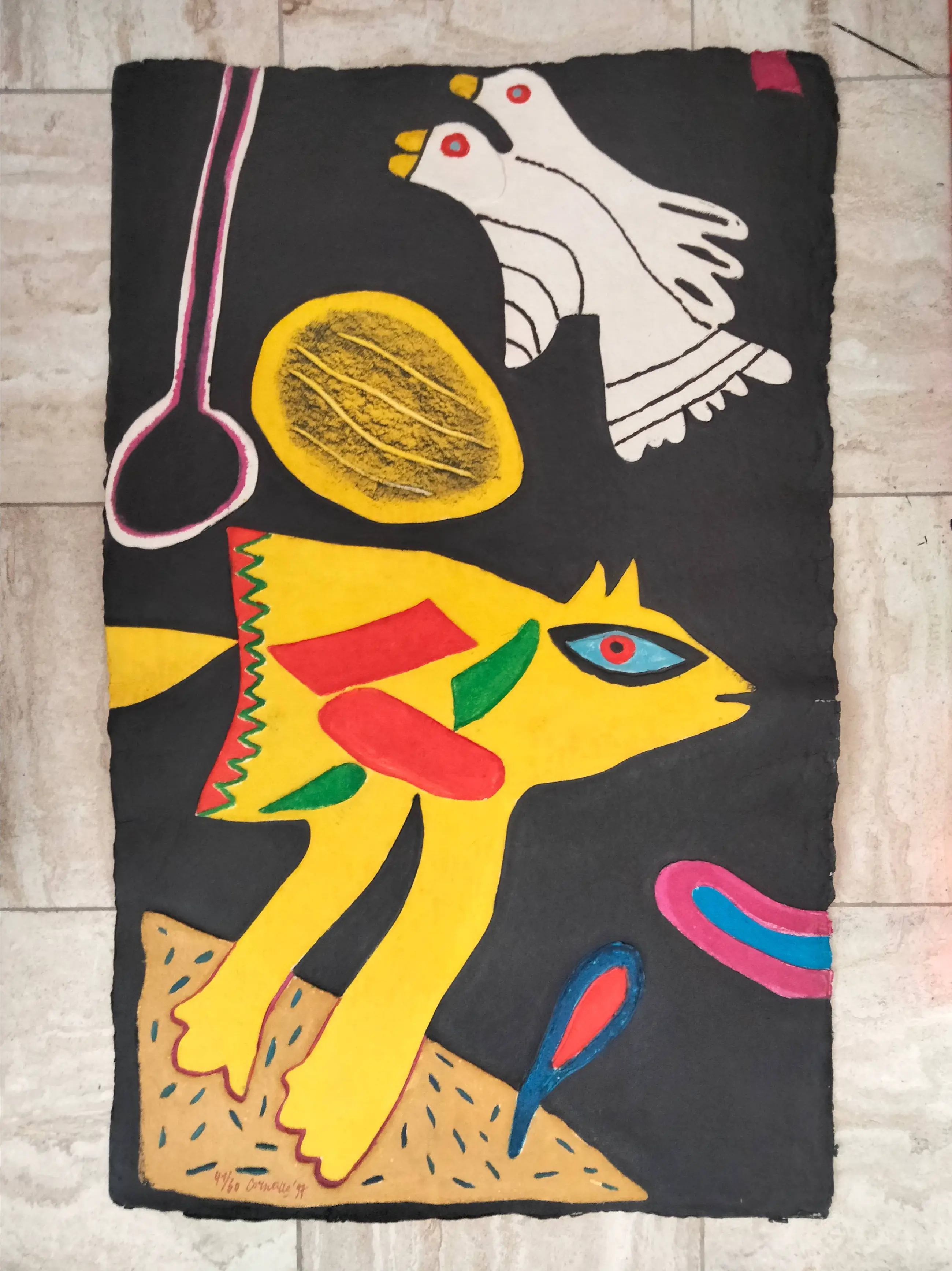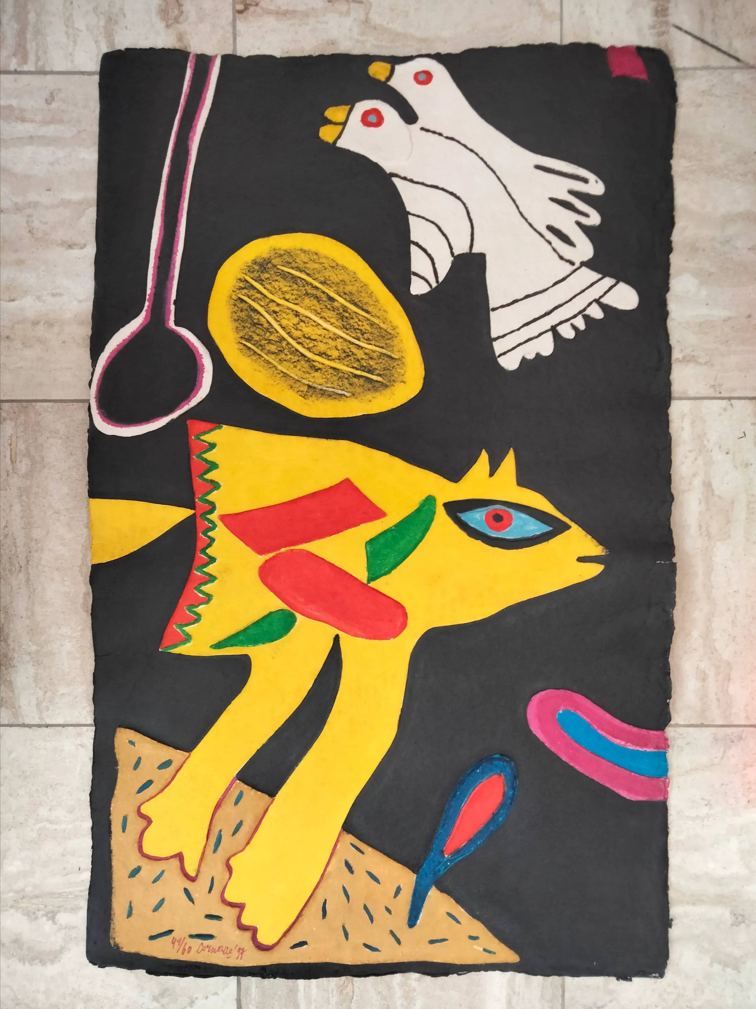 Zeer grote en kleurrijke aquagravure van Corneille getiteld:Les oiseaux jumeaux. Prachtig reliëf,hand ingekleurd door Corneille. Lage oplage van 60 exemplaren. Dit exemplaar heeft nummer 41/60 In goede staat verkerend werk.