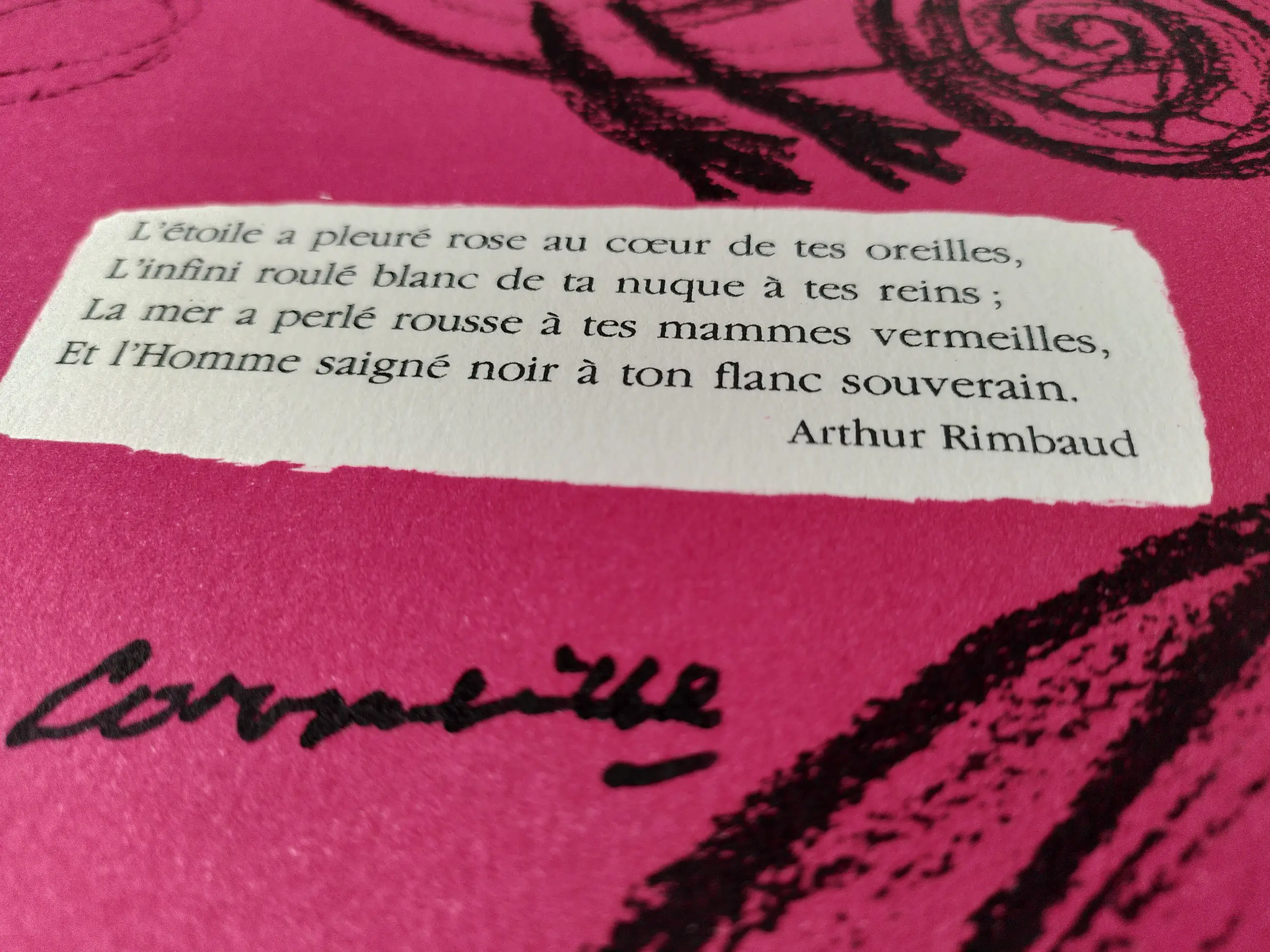Deze zeefdruk is in uitstekende staat. Het is gemaakt in 1991 door de Nederlandse kunstenaar Corneille, die lid was van de COBRA-groep. De zeefdruk is in de plaat gesigneerd, verder heeft Corneille twee aantekeningen met potlood gemaakt. In de linker benedenhoek voegde hij een code 2/9/730 en de rechterbovenhoek EA 5/30 (epreuve artiste 5 uit 30)