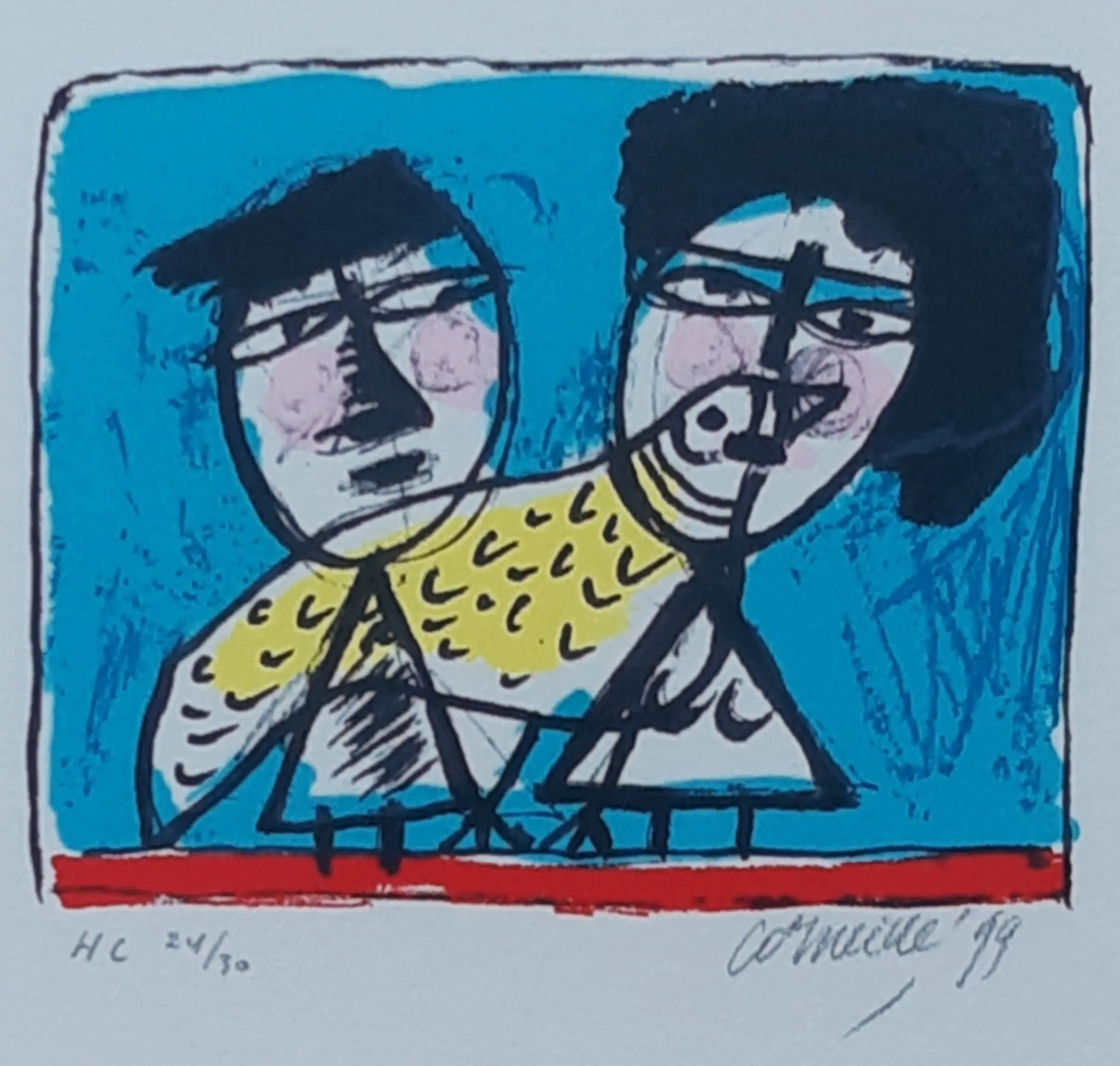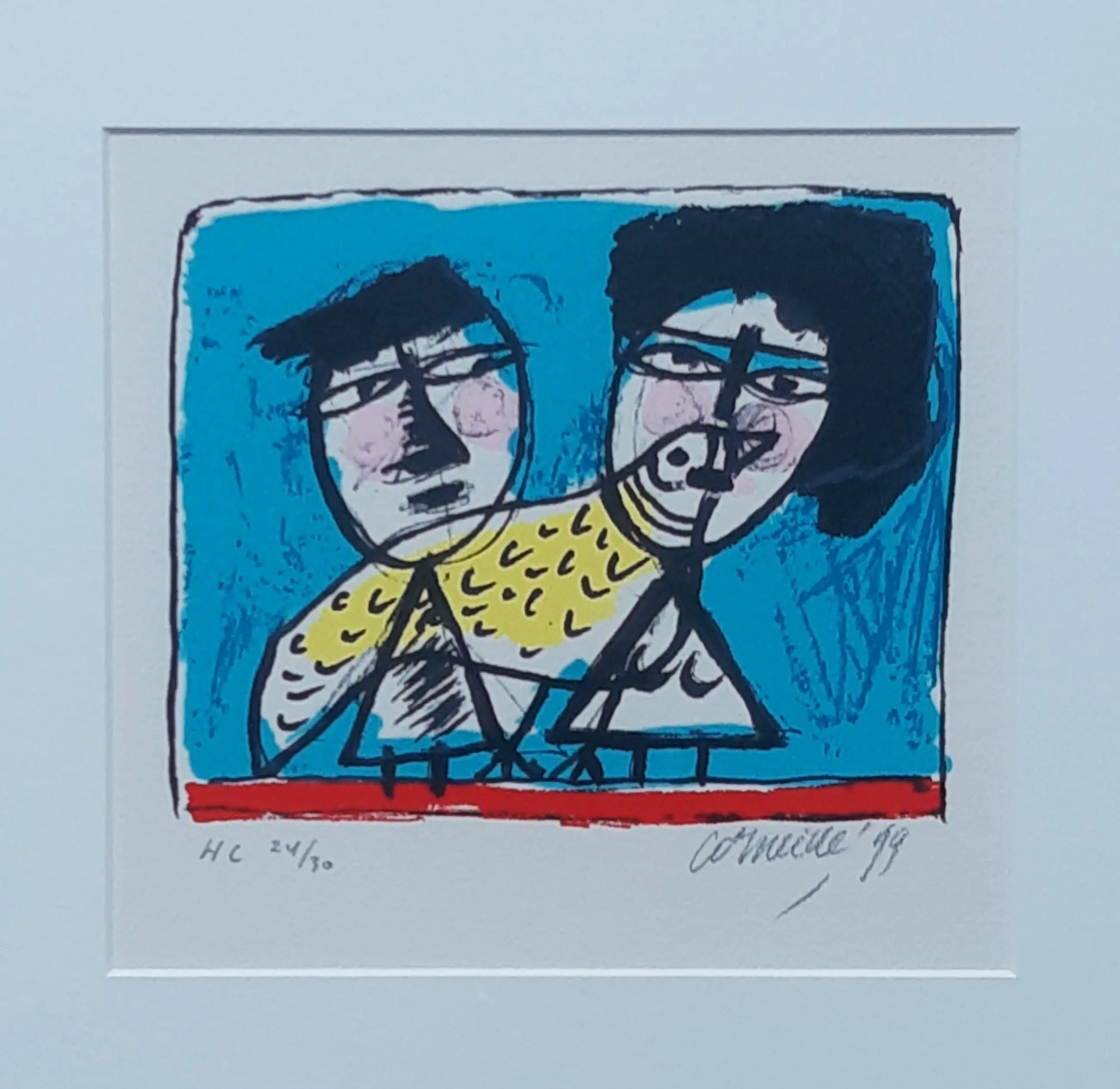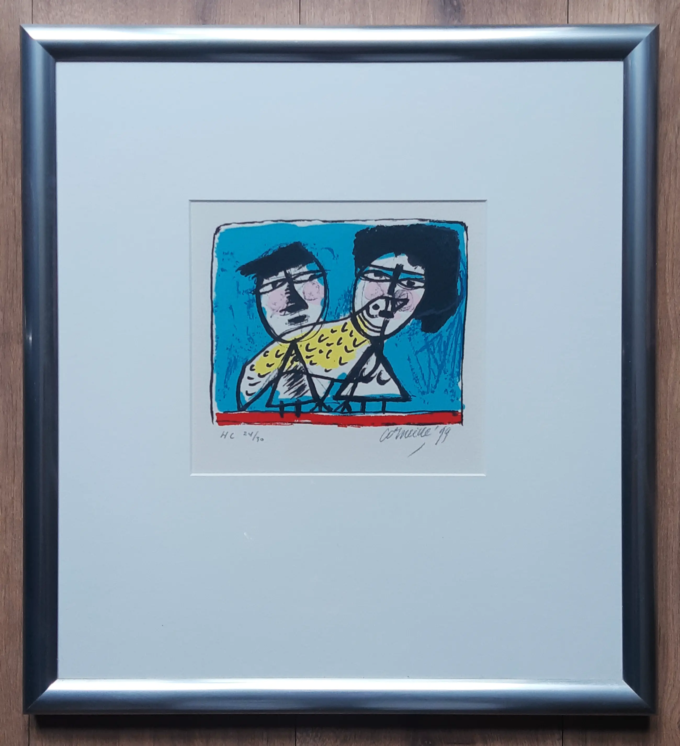 Erg leuke zeefdruk van CoBrA kunstenaar Corneille. Ingelijst in een brede, zilverkleurige aluminium lijst en voorzien van een Passe-partout. Dit is een Hors Commerce exemplaar uitgegeven naast de reguliere serie. Deze drukken werden buiten de serie gehouden en bedoeld voor bijvoorbeeld vrienden en relaties van de kunstenaar zelf. Dit is nummer 24 van 30 exemplaren. Gesigneerd, gedateerd en genummerd in potlood door de kunstenaar.