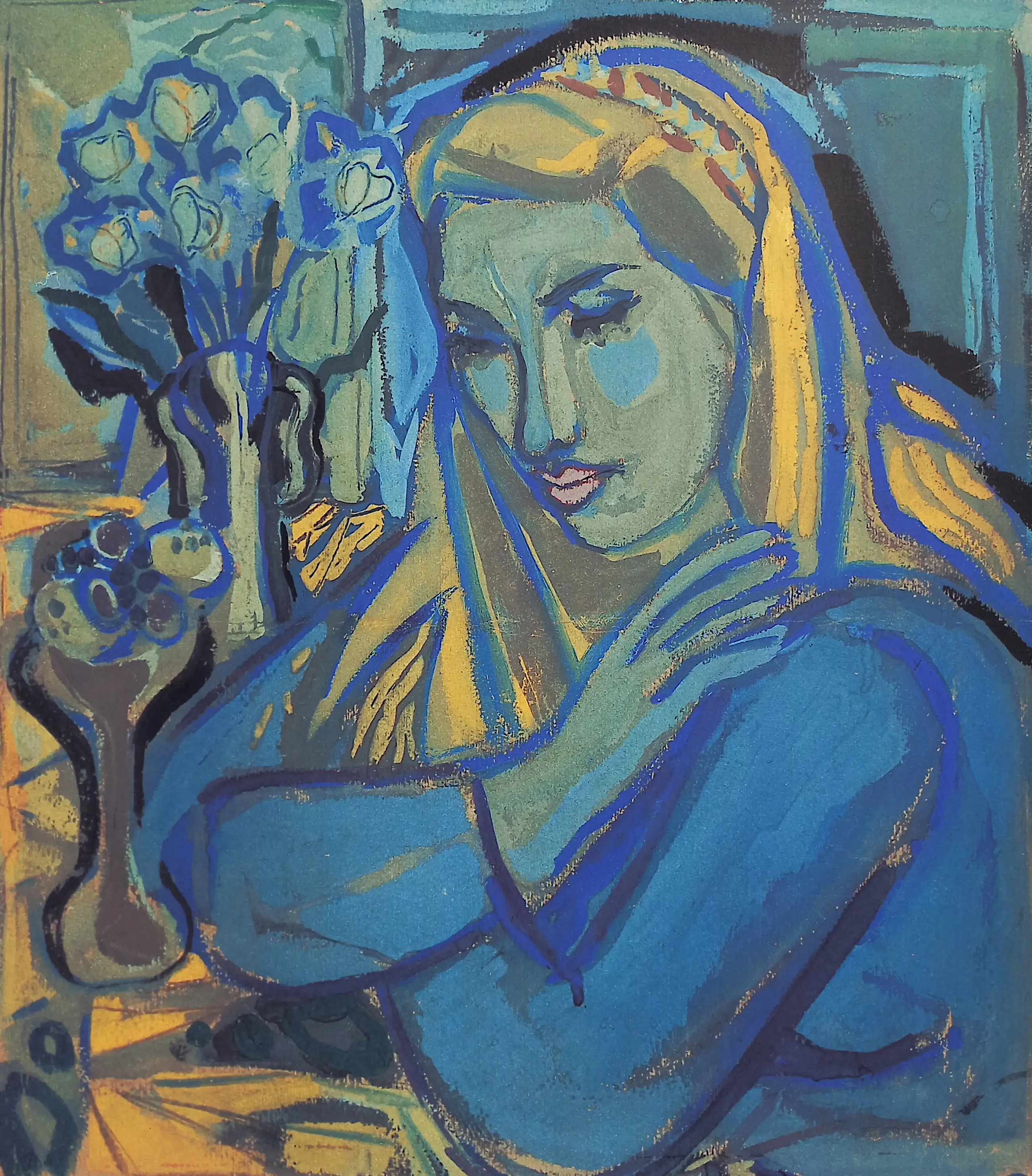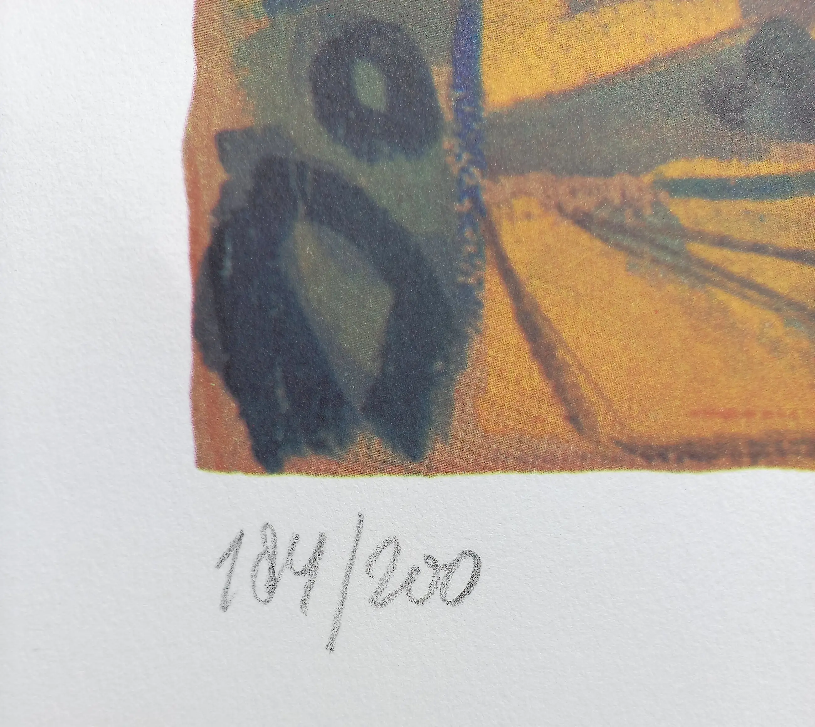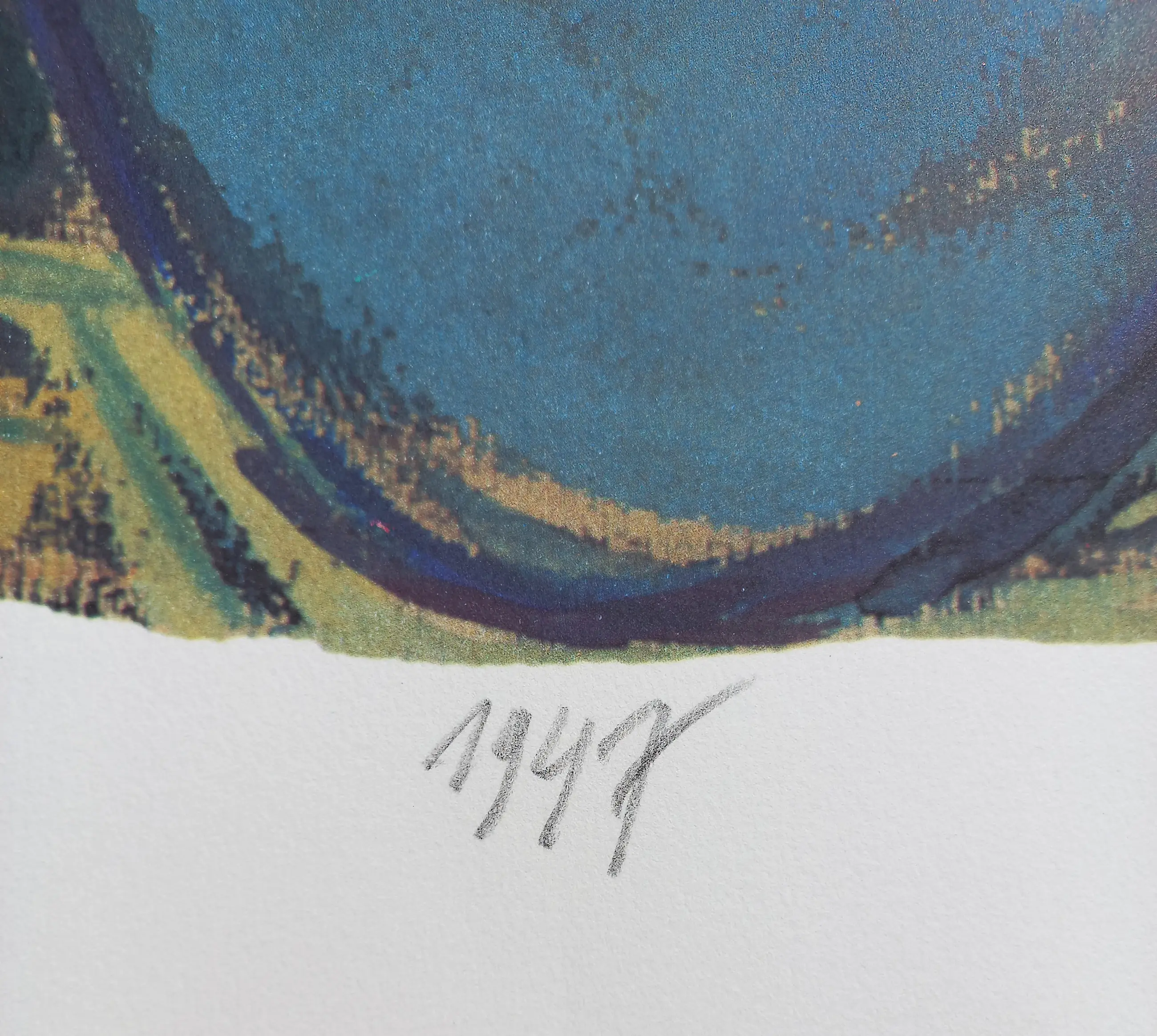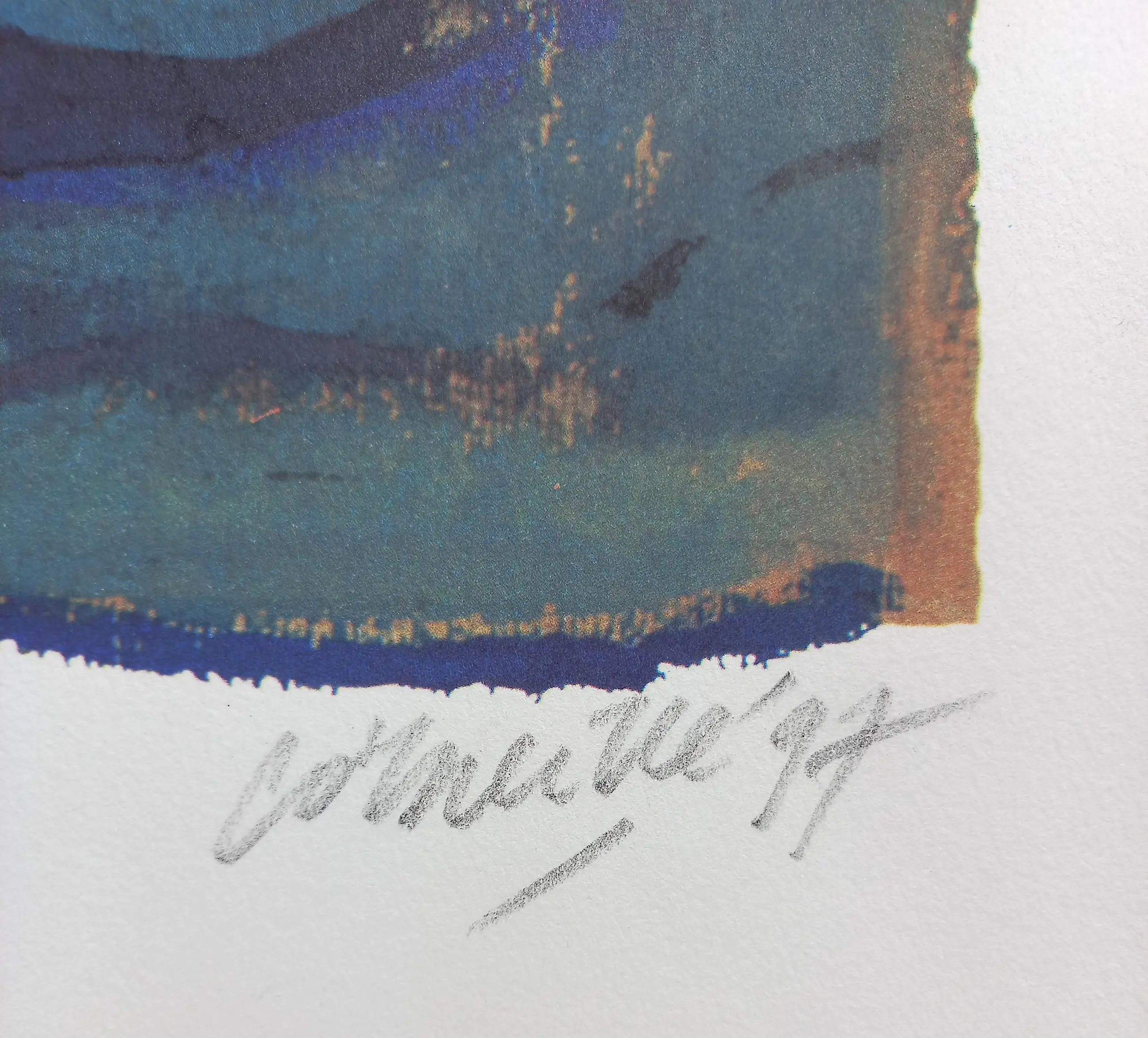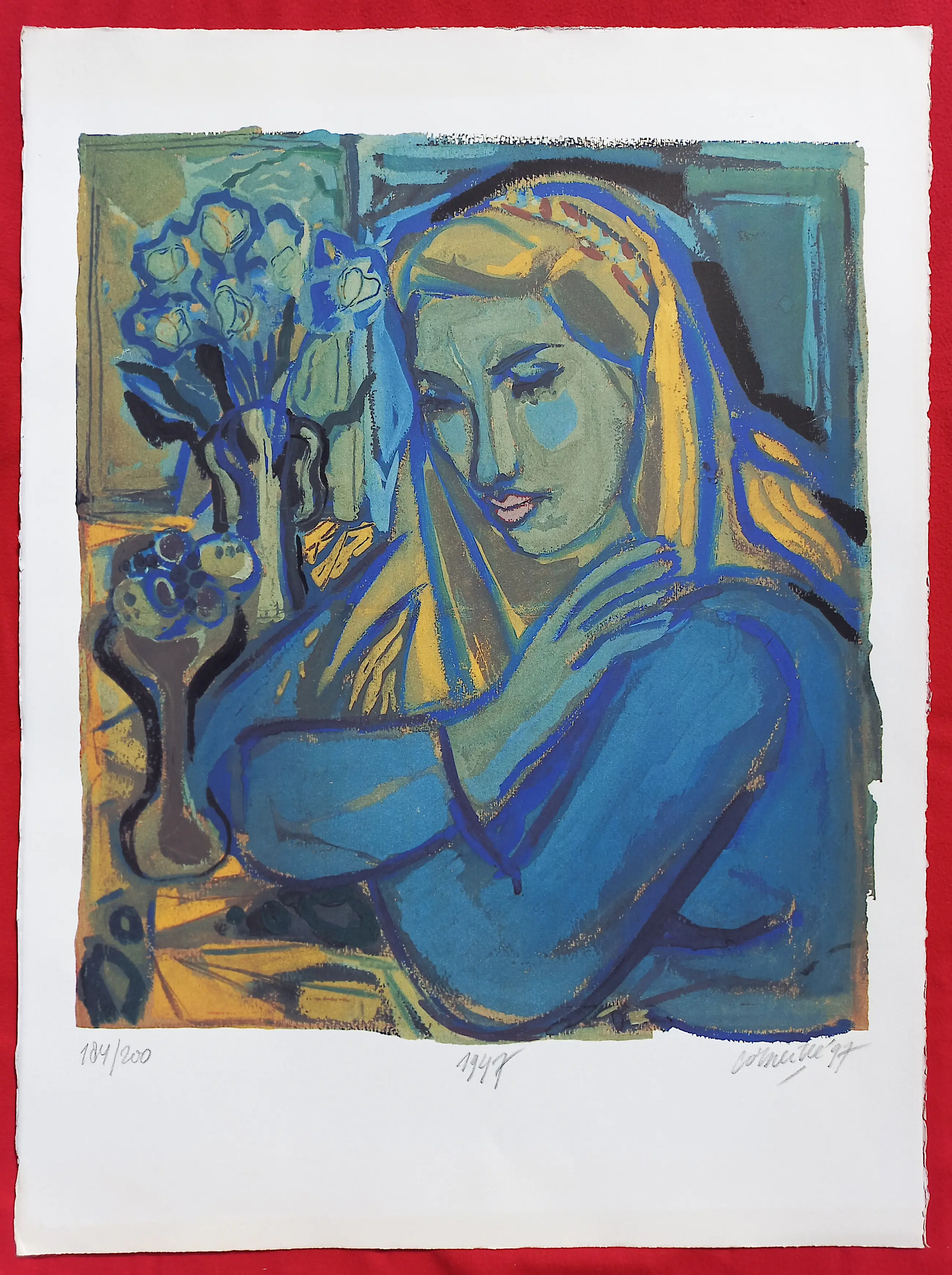 Ingetogen portret van een jonge vrouw door een eveneens jonge Corneille. Zeefdruk op Rives papier, met potlood gesigneerd, gedateerd (“1947” en ”’97”) en genummerd (184/200). Een dubbele datering omdat het om een speciale herdruk uit 1997 gaat van een oorspronkelijk werk dat Corneille maakte in 1947. In uitstekende conditie.
