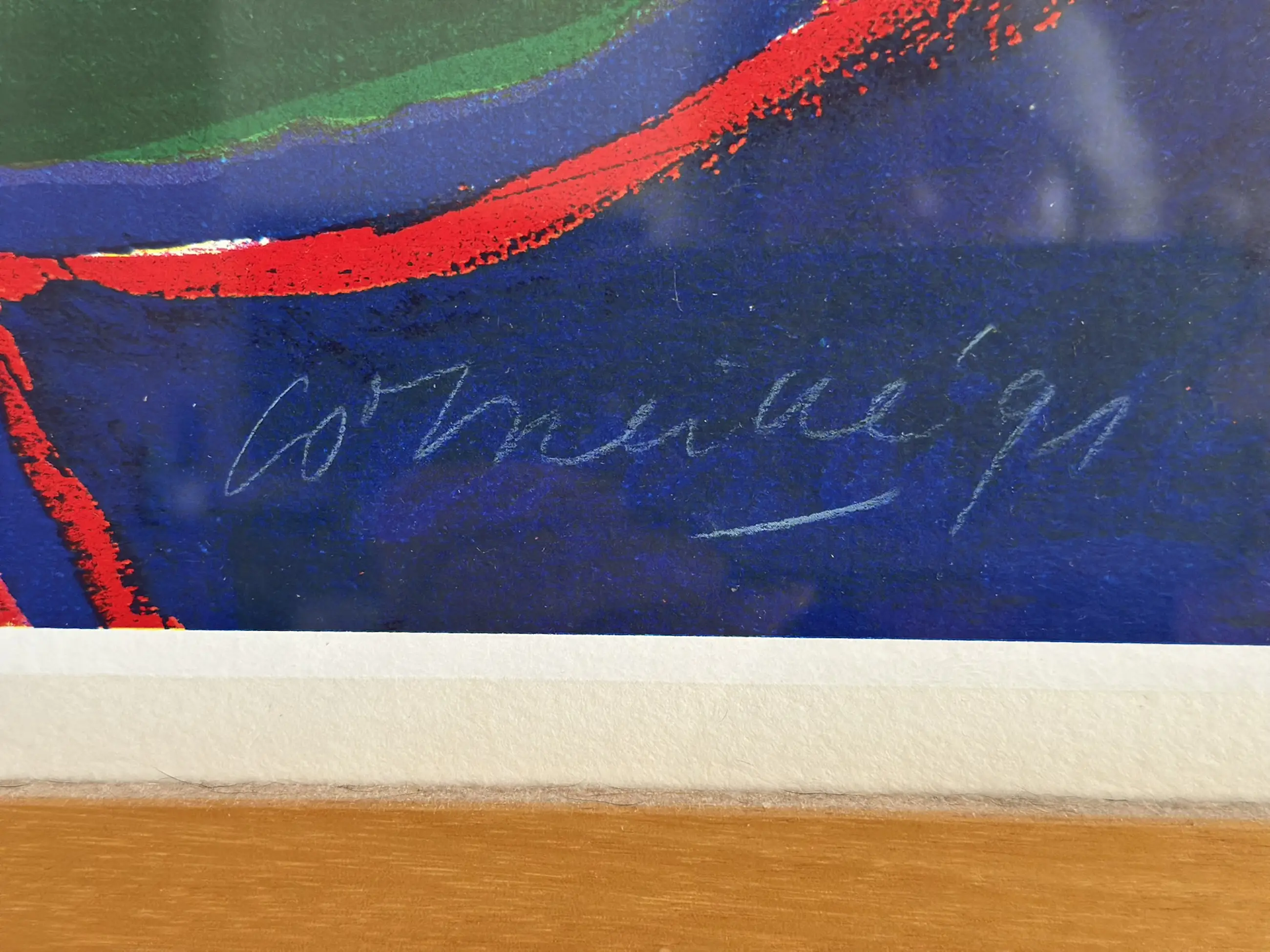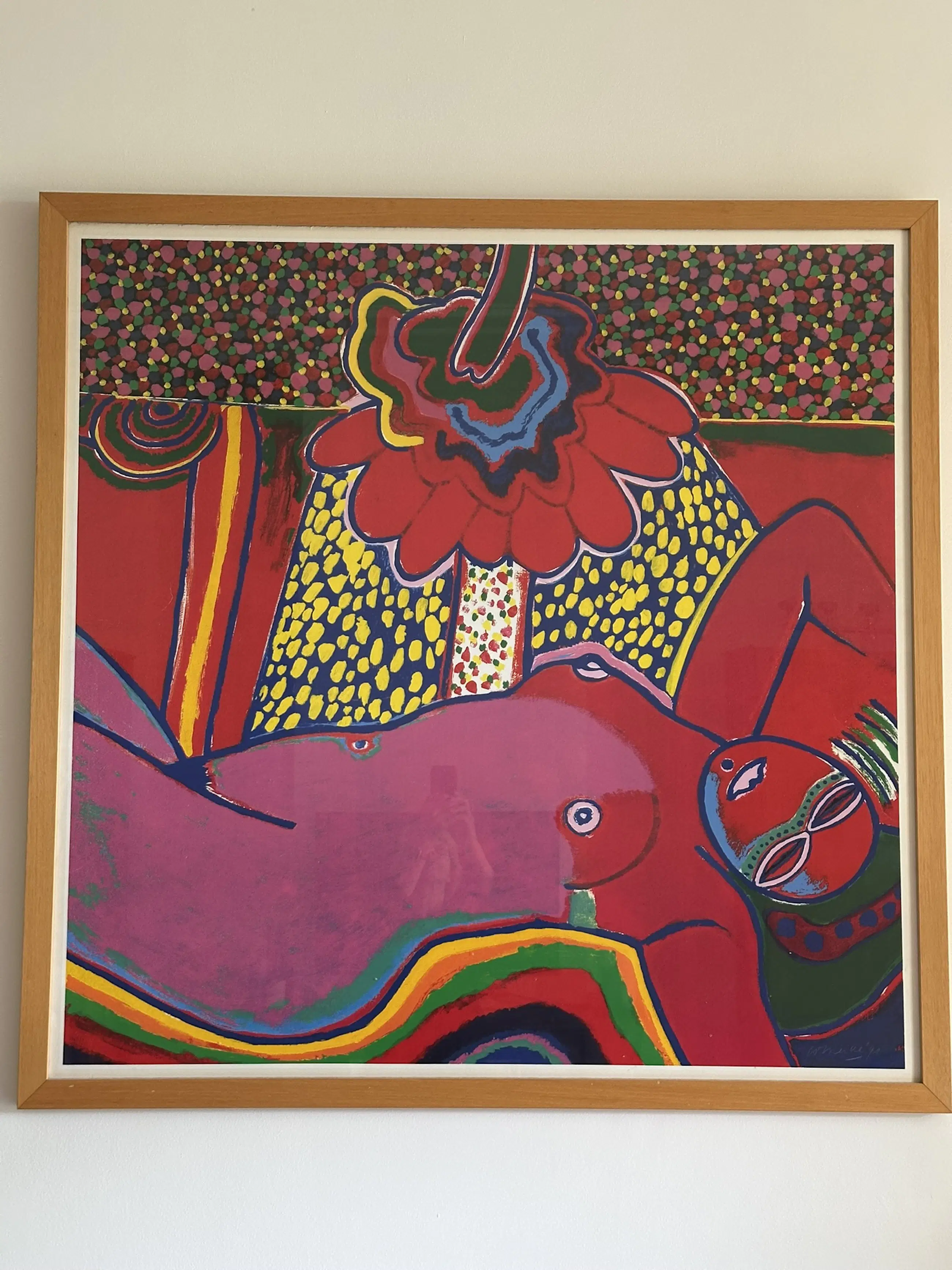Grote vierkante ingelijste litho van Corneille, liggende vrouw met bloem, veelkleurig, vooral rood en roze
