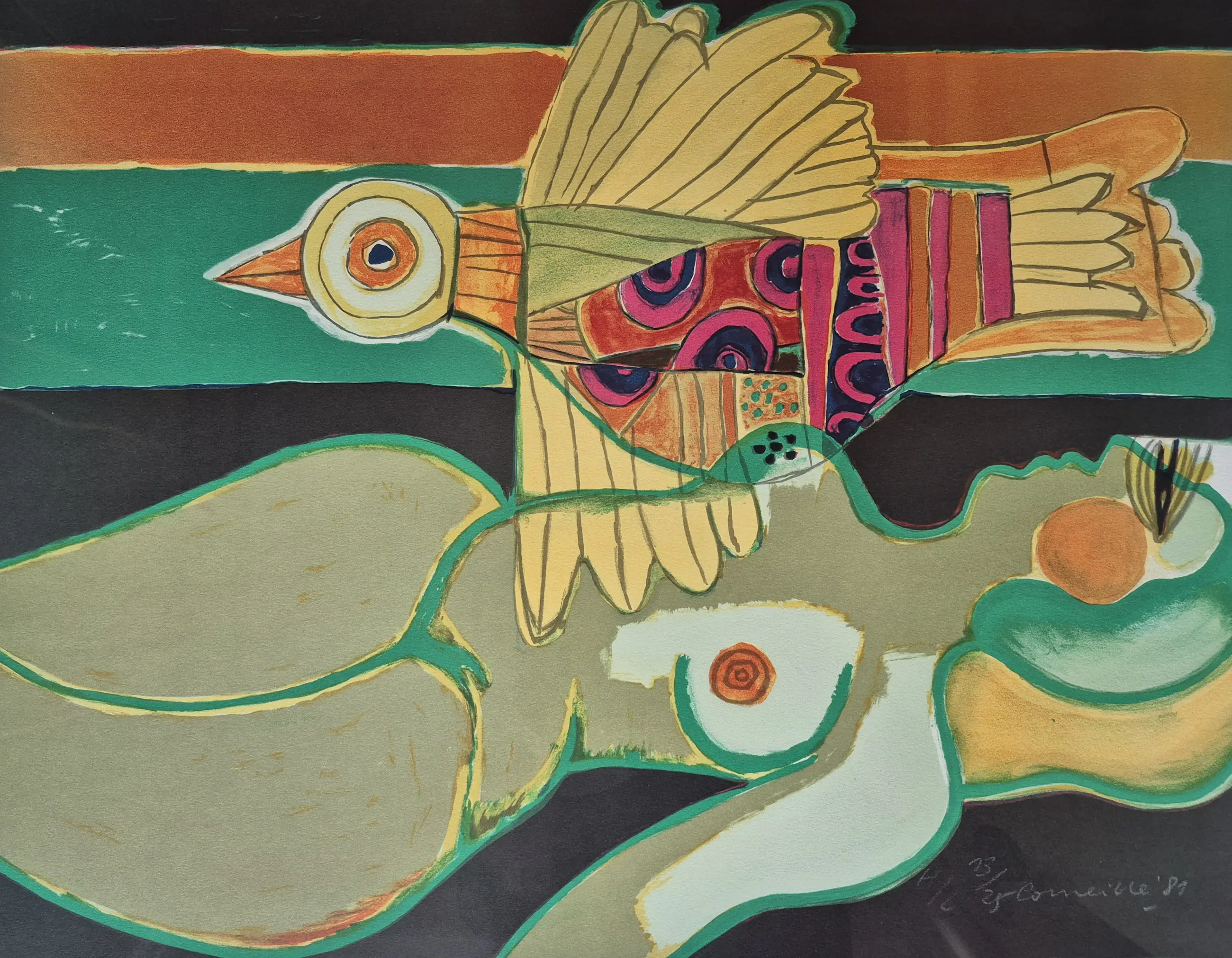 Corneille Beverloo, Cornelis Guillaume van. 1922-07-03 (Luik) – 2010-09-05 (Parijs). Beeldhouwer, keramist, collagist, graficus, fotograaf, illustrator, wandschilder, schilder, tekenaar, pentekenaar, pastellist, sieraadontwerper. Opleiding: Rijksacademie van beeldende kunsten Amsterdam (1940-1943), Parijs: opleiding (1953). Werkzaam in: Luik (1922-1938), Haarlem (1938-1939), Amsterdam (1939-1949), Hongarije (1947), Noord-Afrika (1948-1949), Parijs (1950-1999), Sahara (1952), Mallorca (1953), Zuid-Amerika (1958), Cuba (1967), Val-d’Oise (2010). Prijzen: Ridder in de Orde van Oranje Nassau (1969), Artist of the Year (2003). Corneille was een Nederlandse Cobra-schilder. Aanvankelijk sterk beïnvloed door het werk van Picasso maakte hij zich hier in 1948 van los en trad toe tot de Cobra-beweging. Hij is hiervan medeoprichter samen met onder andere Karel Appel, Jan en Constant Nieuwenhuis. De schilderijen en grafieken van Corneille genieten grote internationale bekendheid en kenmerken zich vooral door kleurrijke afbeeldingen van vrouwen, katten en vogels. Voor Corneille is zijn Cobra-tijd vooral een periode van het experiment. Hierna ontwikkelt hij zijn eigen krachtige en kleurrijke stijl. Tegelijkertijd verdwijnt langzaam de gruwelijke herinnering aan de Tweede Wereldoorlog uit zijn werk. ‘Ellende kan ik voor mijn werk niet gebruiken. Oorlog, daar ben ik niet op gebouwd.' Corneille beweerde dat schilderen geen hobby of werk is maar een roeping.