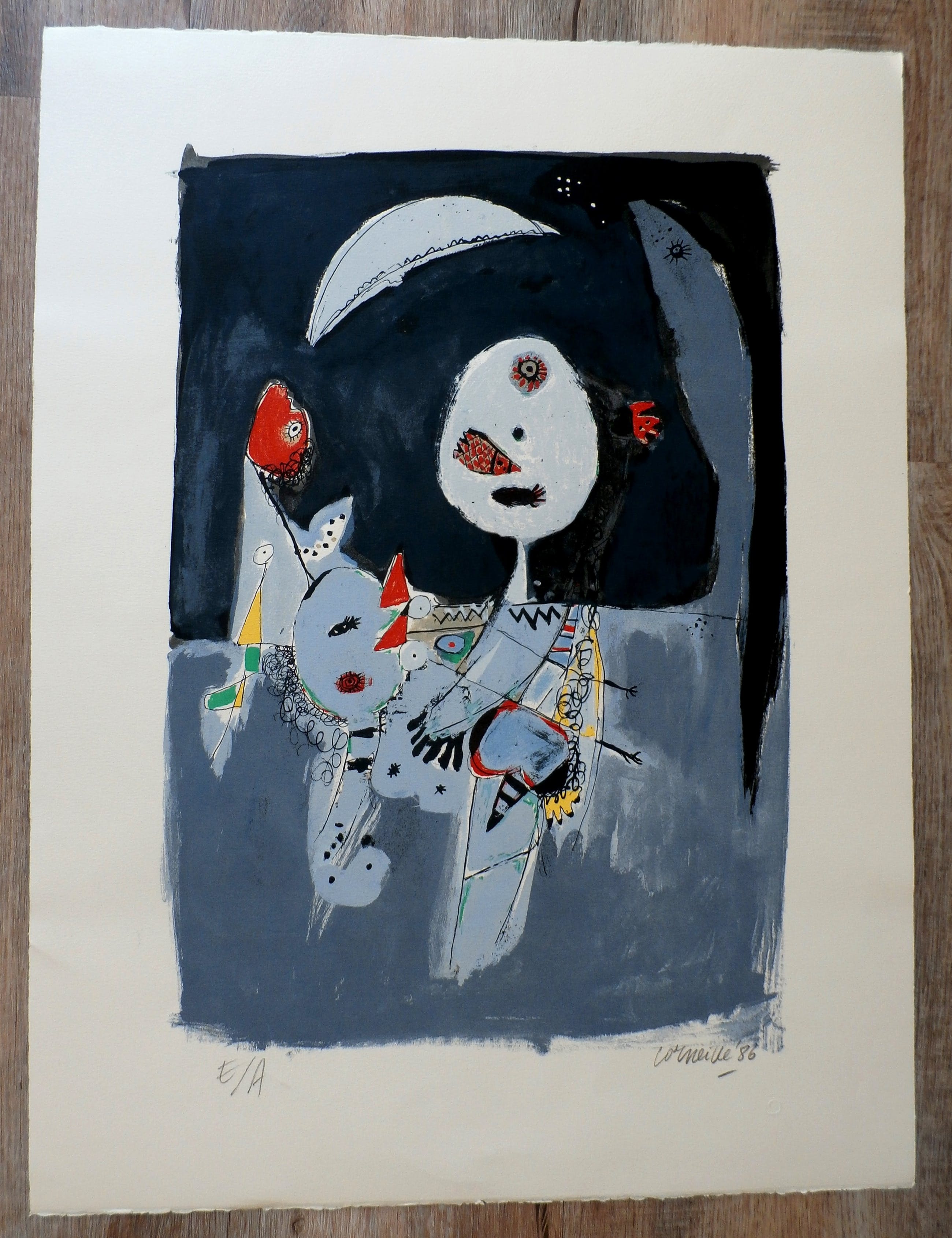 Litho van Corneille uit 1986. Nummer: E/A(=epreueve d'artiste, afdruk vd kunstenaar). Afmetingen blad : H65 x b50 cm. Afmetingen voorstelling: H50 x b35. De litho is , met potlood, rechtsonder gesigneerd door de kunstenaar. De authenticiteit van dit werk wordt voor 100% gegarandeerd. Een certificaat van echtheid kan, op aanvraag, worden meegestuurd.