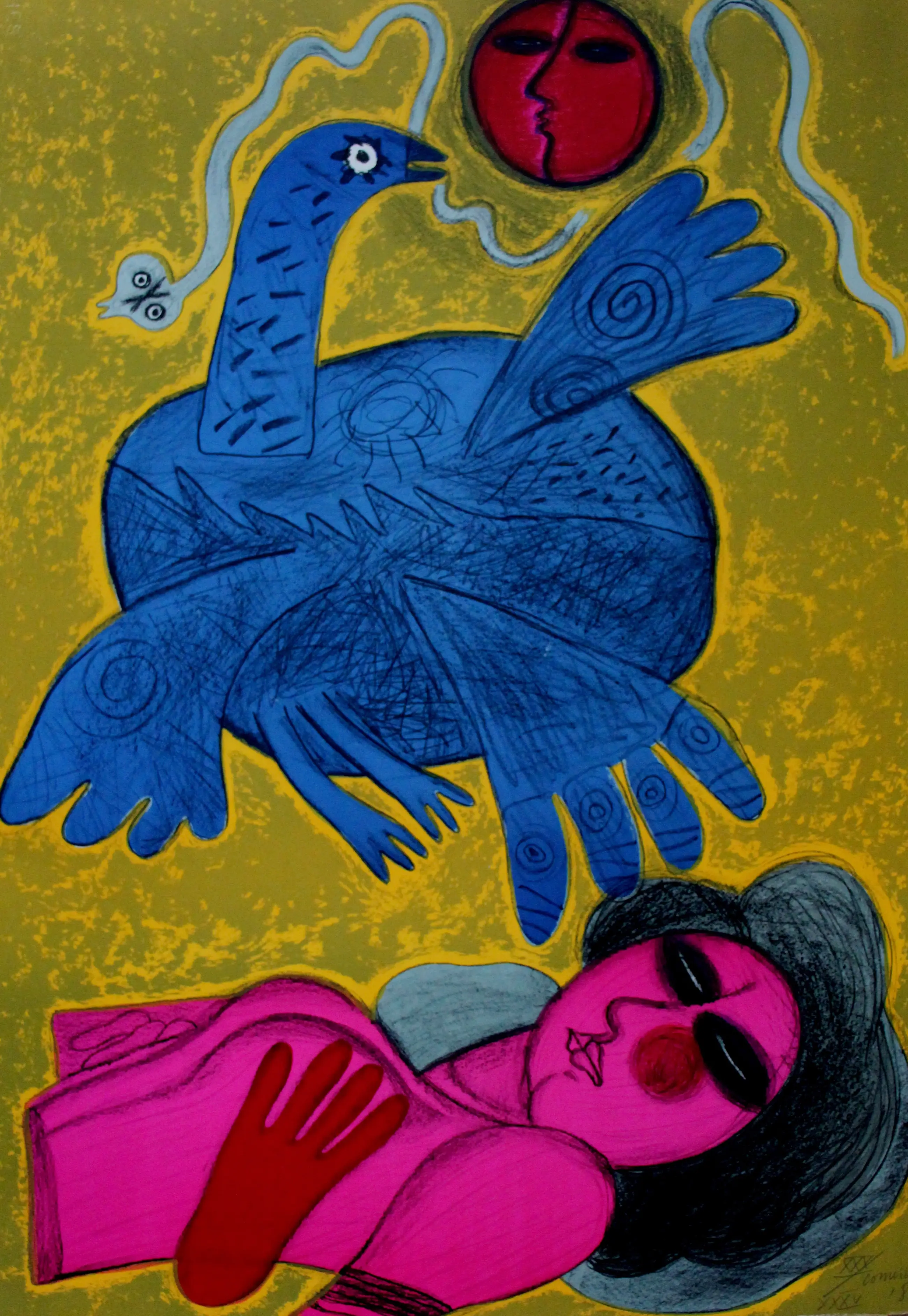 Kleurenlitho van Corneille uit 1988. Nummer: XXX/XXXV. Afmetingen blad: H85 x b60cm. Het werk is rechts onderaan, met potlood, gesigneerd door de kunstenaar. De authenticiteit van het aangeboden werk wordt volledig gegarandeerd. Een certificaat van echtheid kan, op aanvraag, worden gemaild.