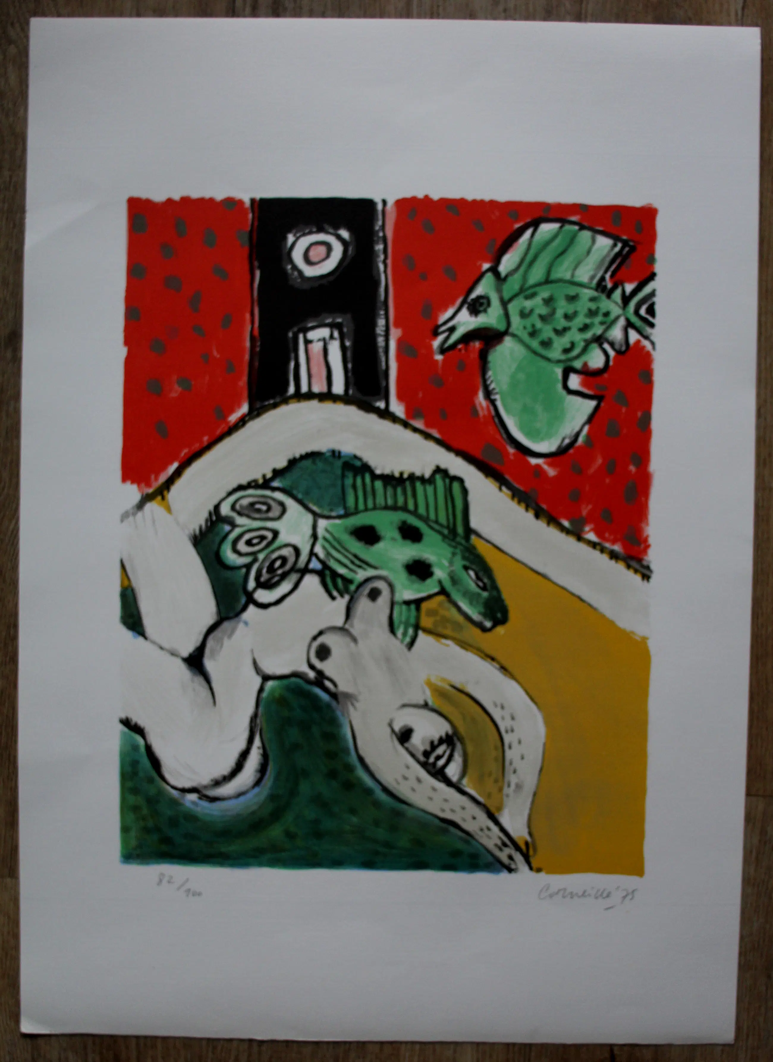 Litho van Corneille uit 1975. Titel: Femme et poissons. Oplage: 82/100. Het werk is rechtsonder, met potlood, gesigneerd en gedateerd door de kunstenaar. Afmetingen blad: H70 x b49.5cm. Afmetingen voorstelling: H45 x b36cm. De authenticiteit van dit werk wordt volledig gegarandeerd. Een certificaat van echtheid kan, op aanvraag, worden gemaild.