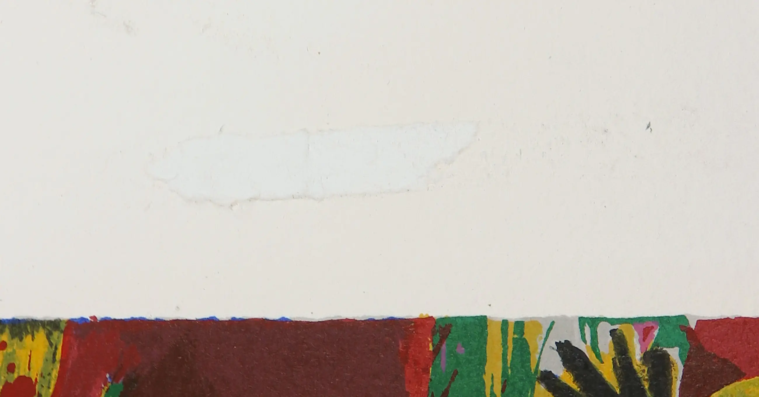 | De voorstelling bevat wat golving, daarnaast is het omliggende witte kader wat licht vuil en bevat resten van het Passe-partout. (zie detailfoto's) | |||||||||||