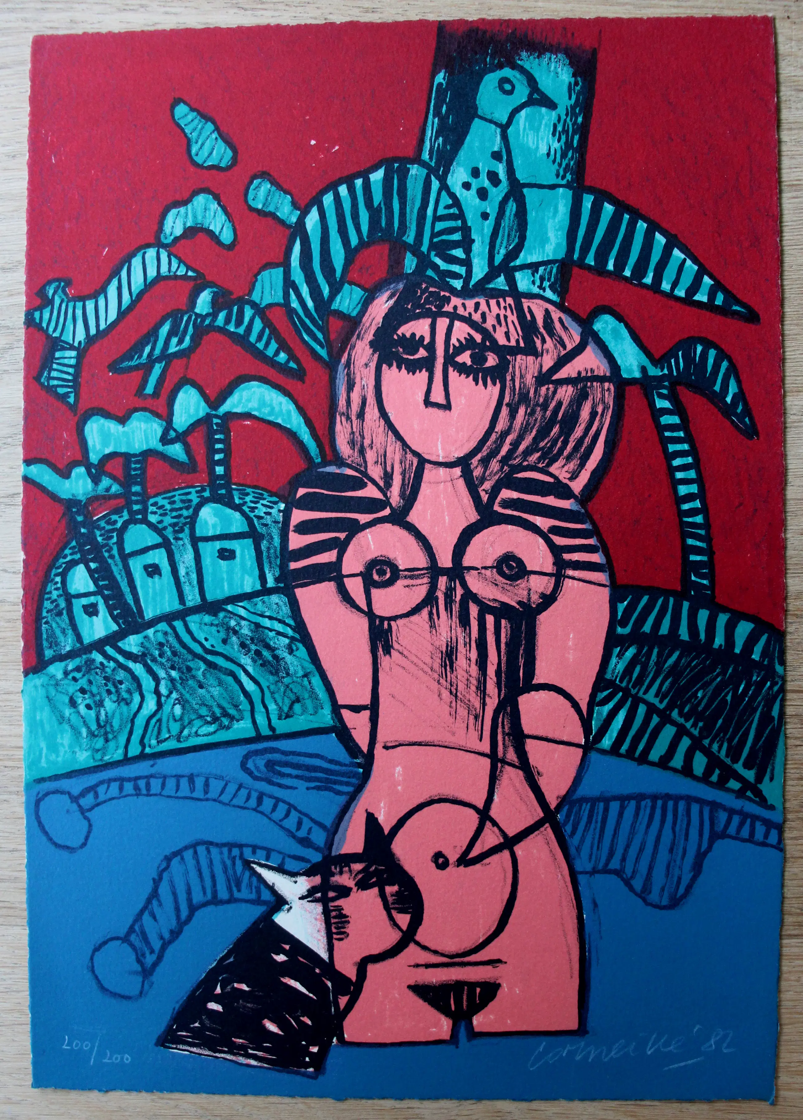 Litho van Corneille uit 1982. Titel: 'La femme rose a la plage'. Oplage: 200/200. Afmetingen blad: H33 x b23cm. Het werk is rechtsonder, met potlood, gesigneerd en gedateerd door de kunstenaar. De authenticiteit van dit werk wordt volledig gegarandeerd. Een certificaat van echtheid kan, op aanvraag, worden gemaild.