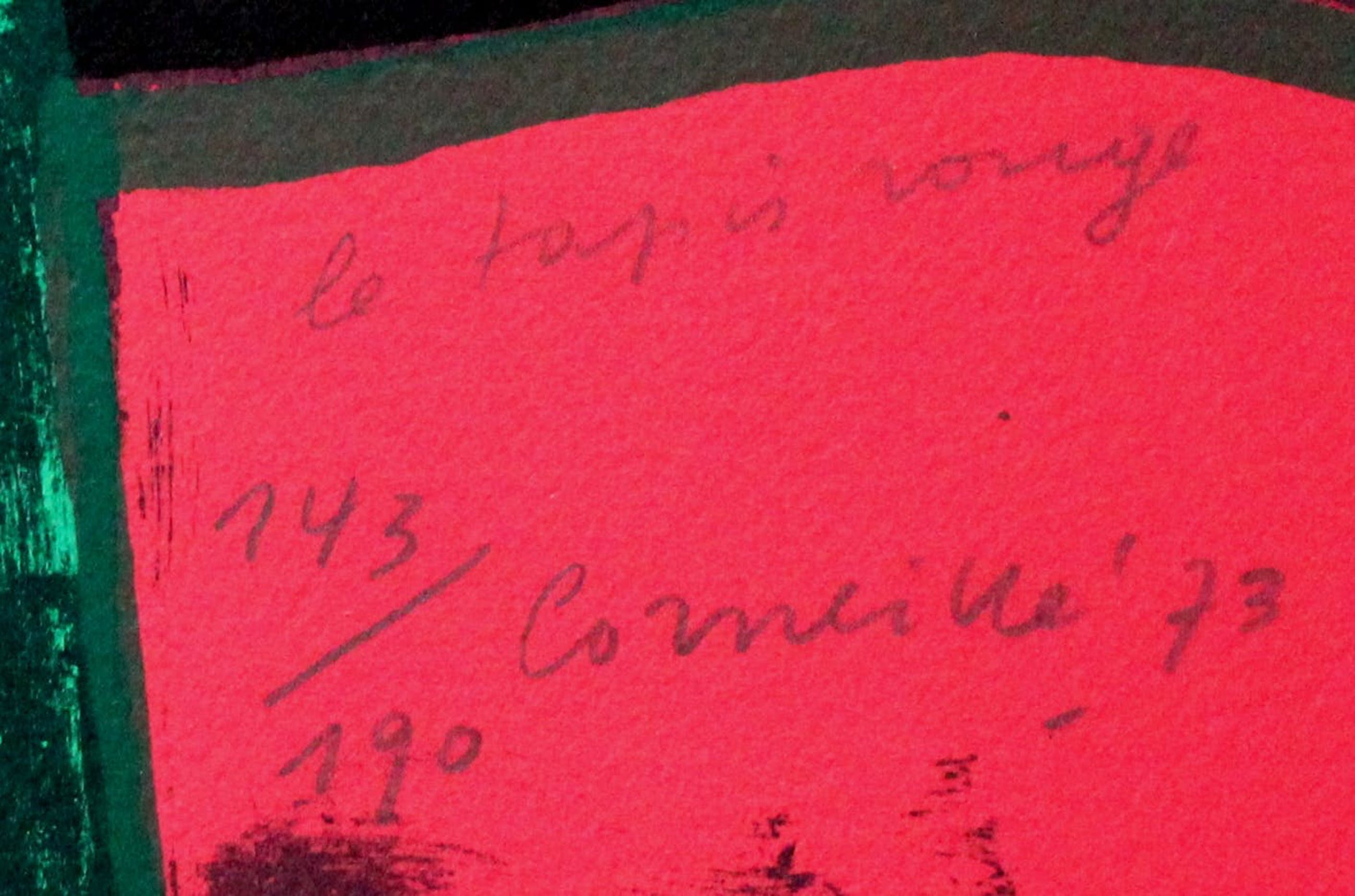 Kleurenlitho van Corneille uit 1973. Titel: Le tapis rouge. Nummer: 143/190. Uitgegeven door Prent 190. Literatuur: Donkersloot, nummer 337, blz 252. Het werk is rechts bovenaan, met potlood, gesigneerd door de kunstenaar. Literatuur: Corneille, het complete grafische werk 1948 - 1975. Nummer: 337, blz 252. De authenticiteit van het aangeboden werk wordt volledig gegarandeerd. Een certificaat van echtheid kan, op aanvraag, worden gemaild.