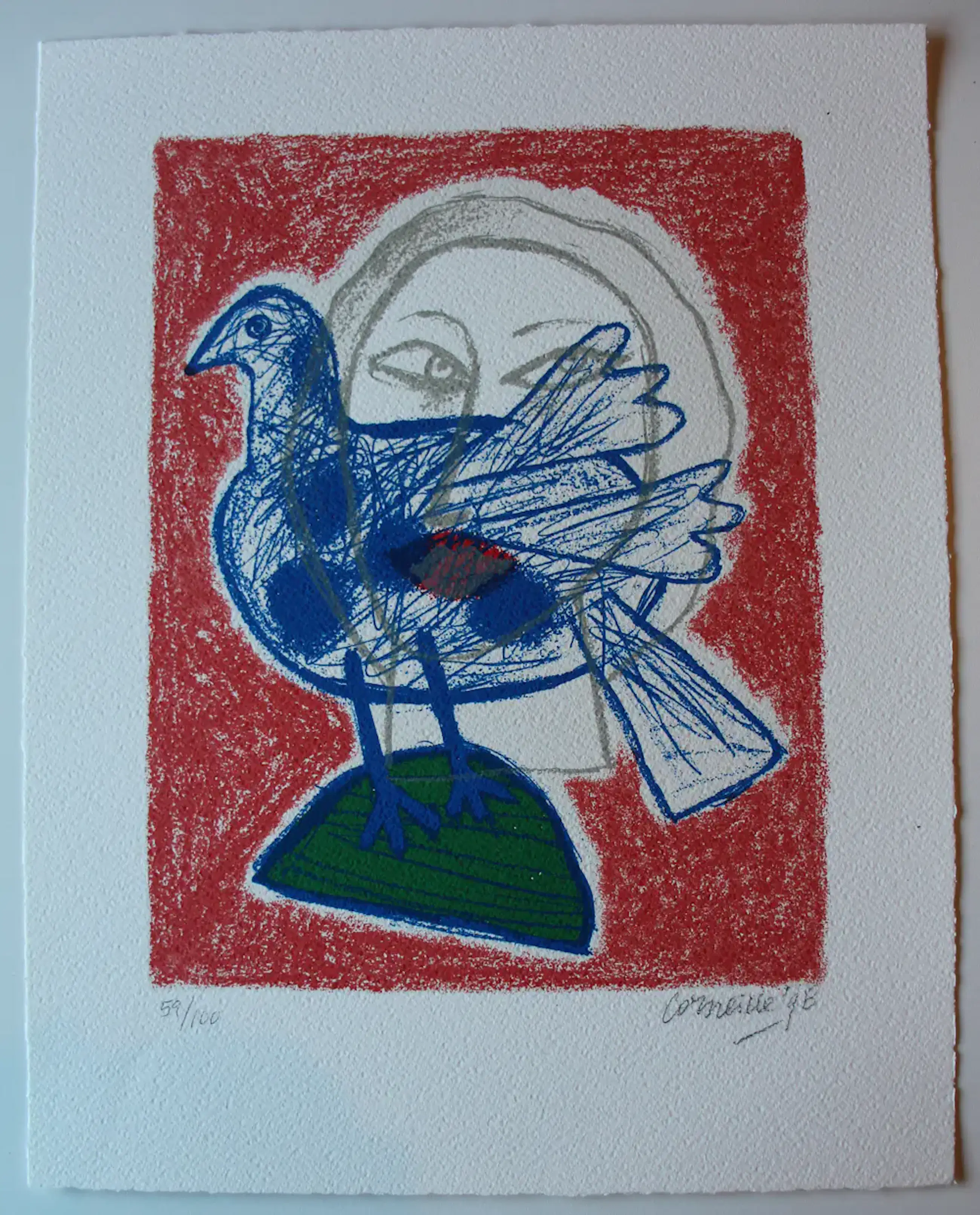 Litho van Corneille uit 1998. Voorstelling van een dame, die kijkt naar een vogel. Oplage: 59/100 (nummer kan afwijken omdat ik meerdere exemplaren heb gehad. Alle werken zijn wel in nieuwstaat). Het werk is rechtsonder, met potlood, gesigneerd en gedateerd door de kunstenaar. Afmetingen blad: H47.5 x b37cm. Afmetingen voorstelling: H34.5 x b26.5cm. De authenticiteit van dit werk wordt volledig gegarandeerd. Een certificaat van echtheid kan, op aanvraag, worden gemaild.