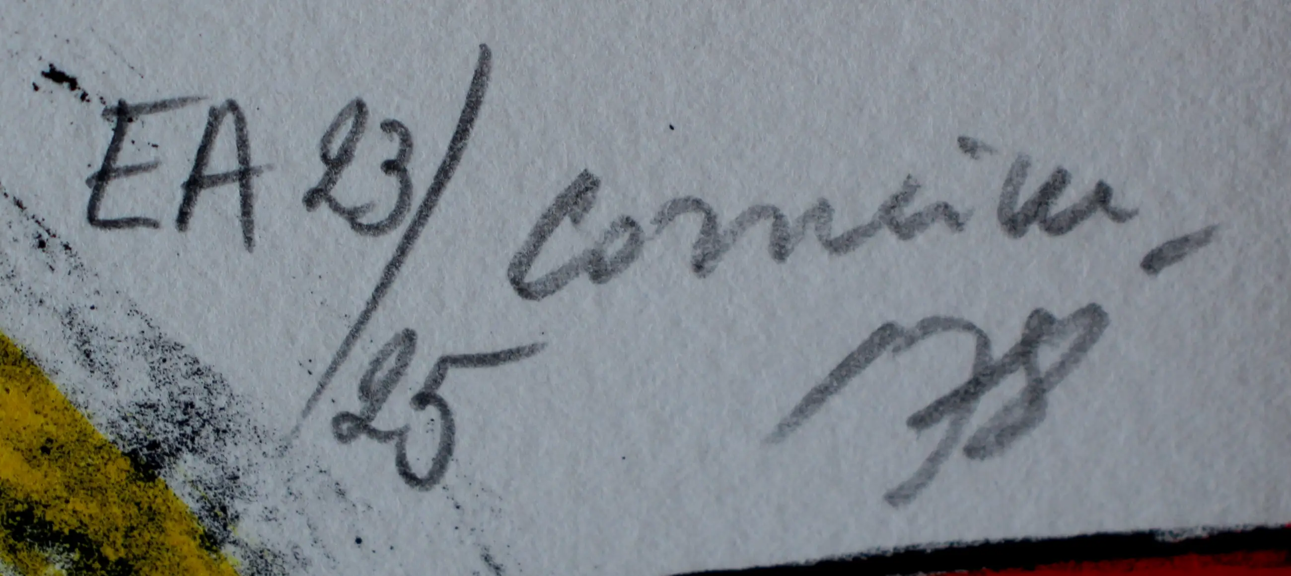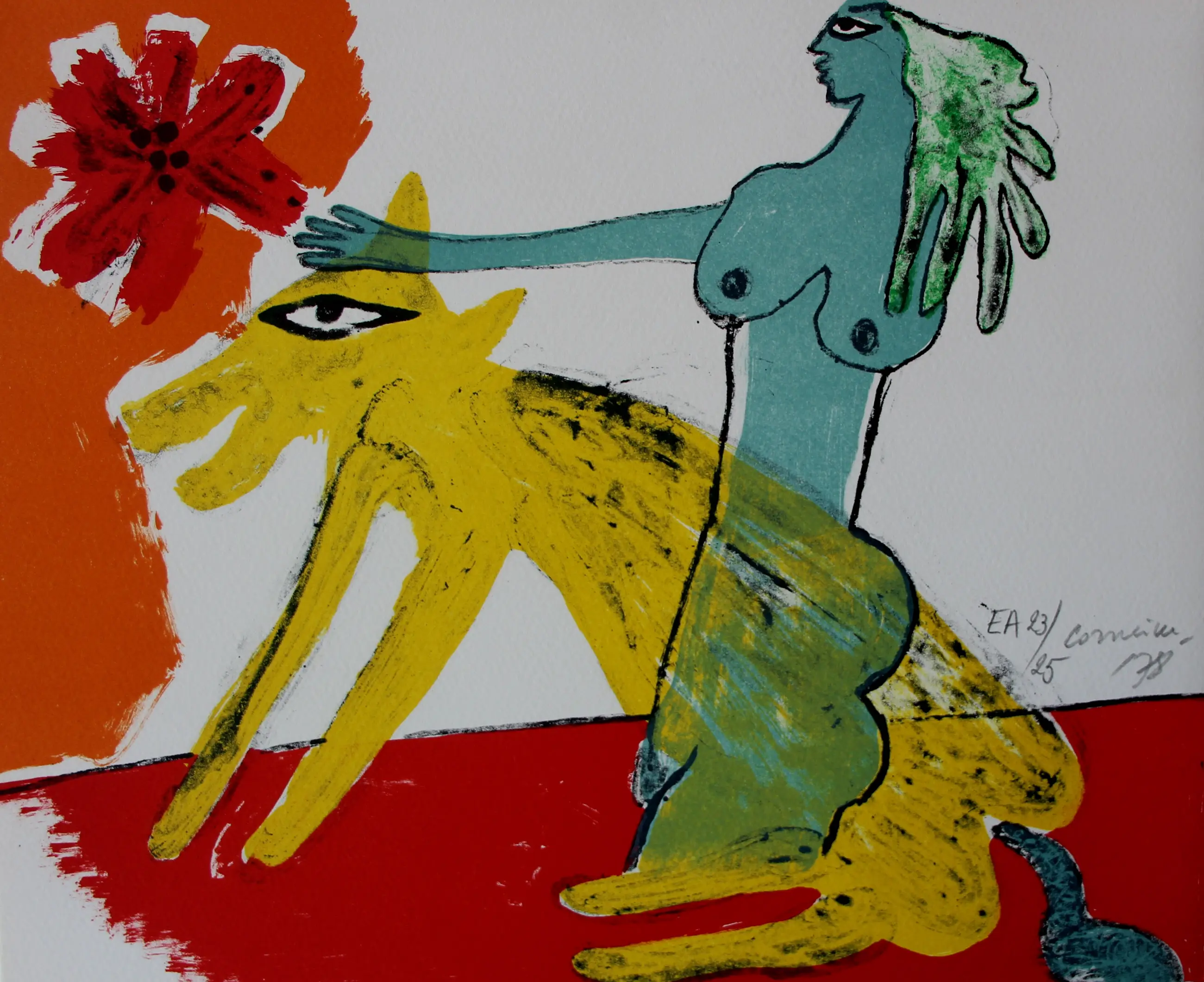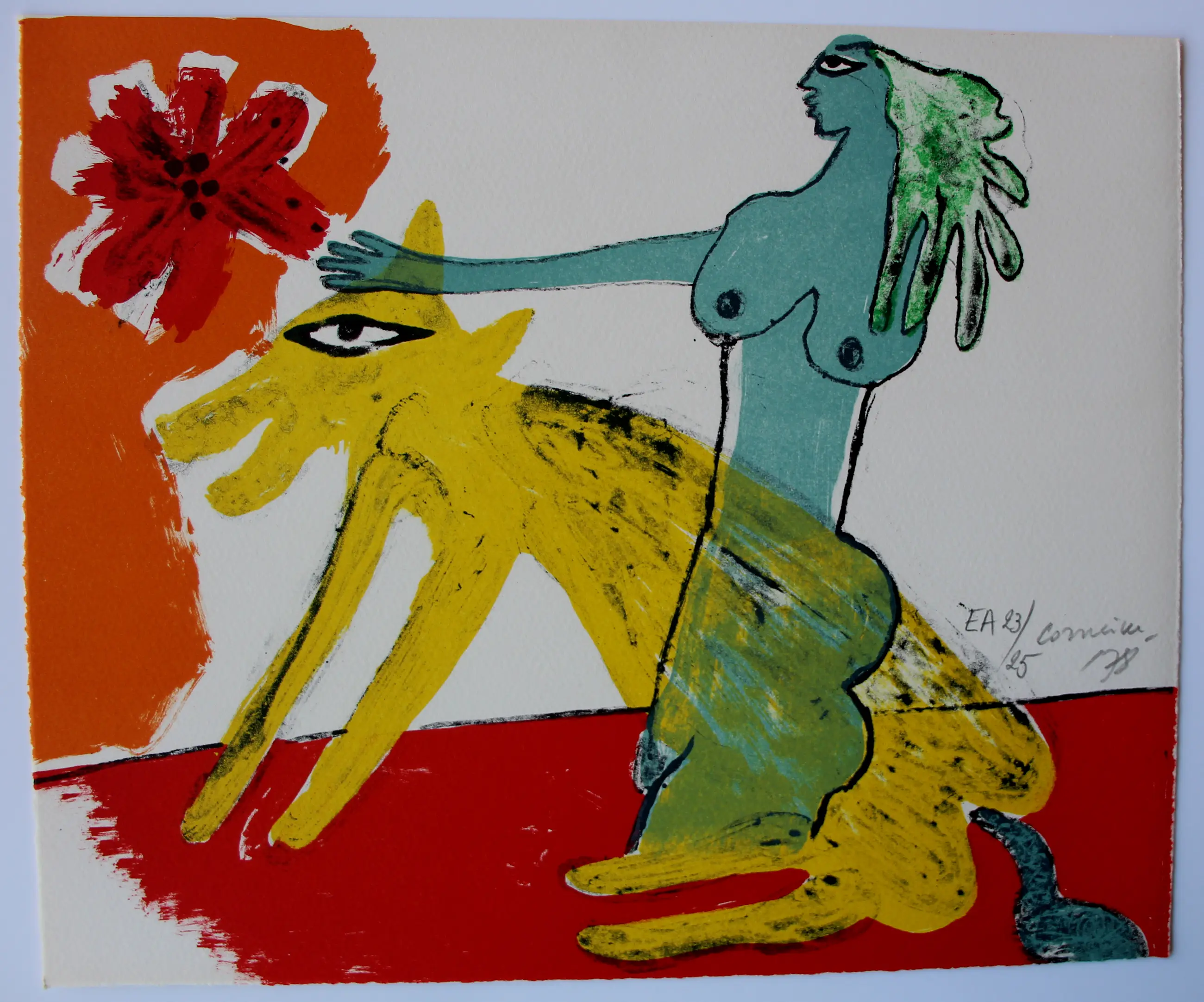 Litho van Corneille. Titel: la femme au levrier russe(=de vrouw met Russische windhond). Jaar: 1978. Oplage: EA, 23/25. Afmetingen blad: H25 x b35cm. Het werk is, aan de rechter zijkant, gesigneerd door de kunstenaar. De authenticiteit van het aangeboden werk wordt volledig gegarandeerd. Een certificaat van echtheid kan, op aanvraag, worden gemaild.