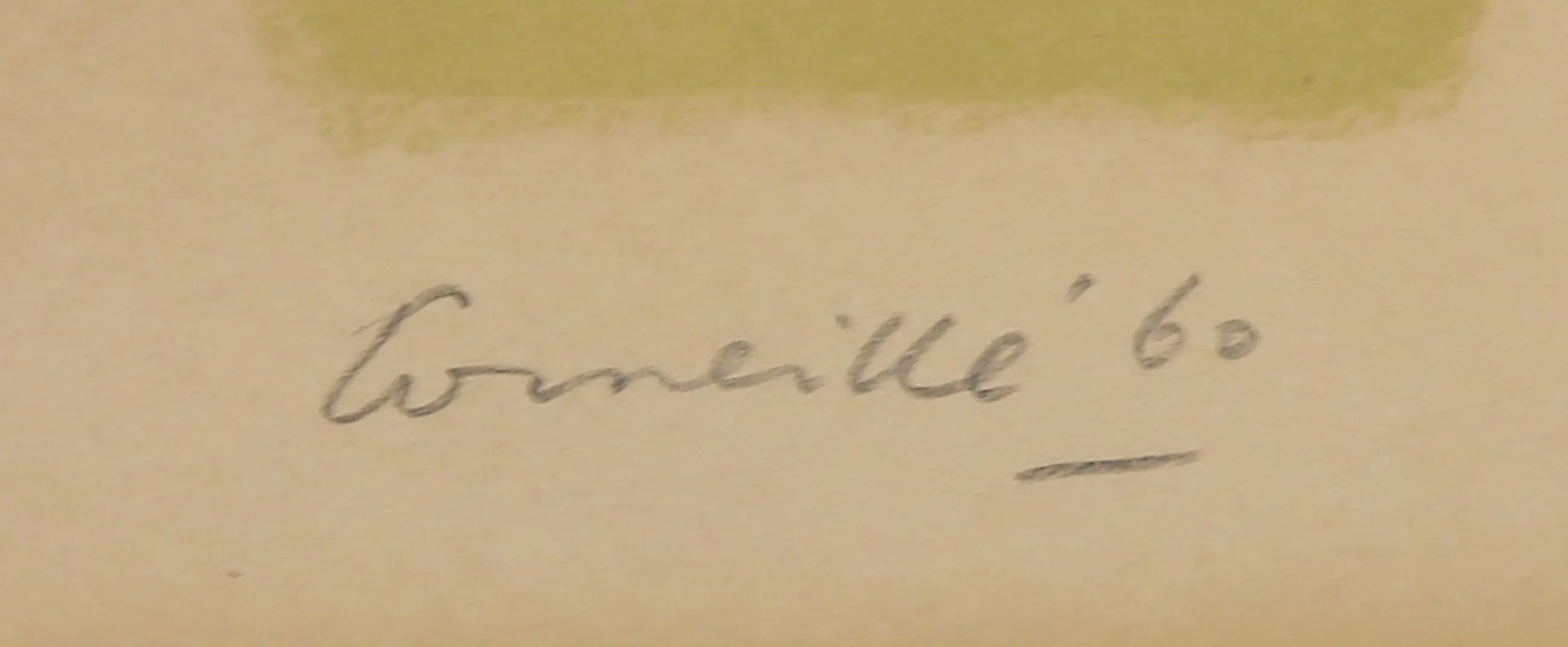 | Het werk is in goede staat, maar wel vergeeld. Daarnaast heet de glasplaat wat glasschade aan de randen, zoals ook op de detailfoto's is te zien. | |
