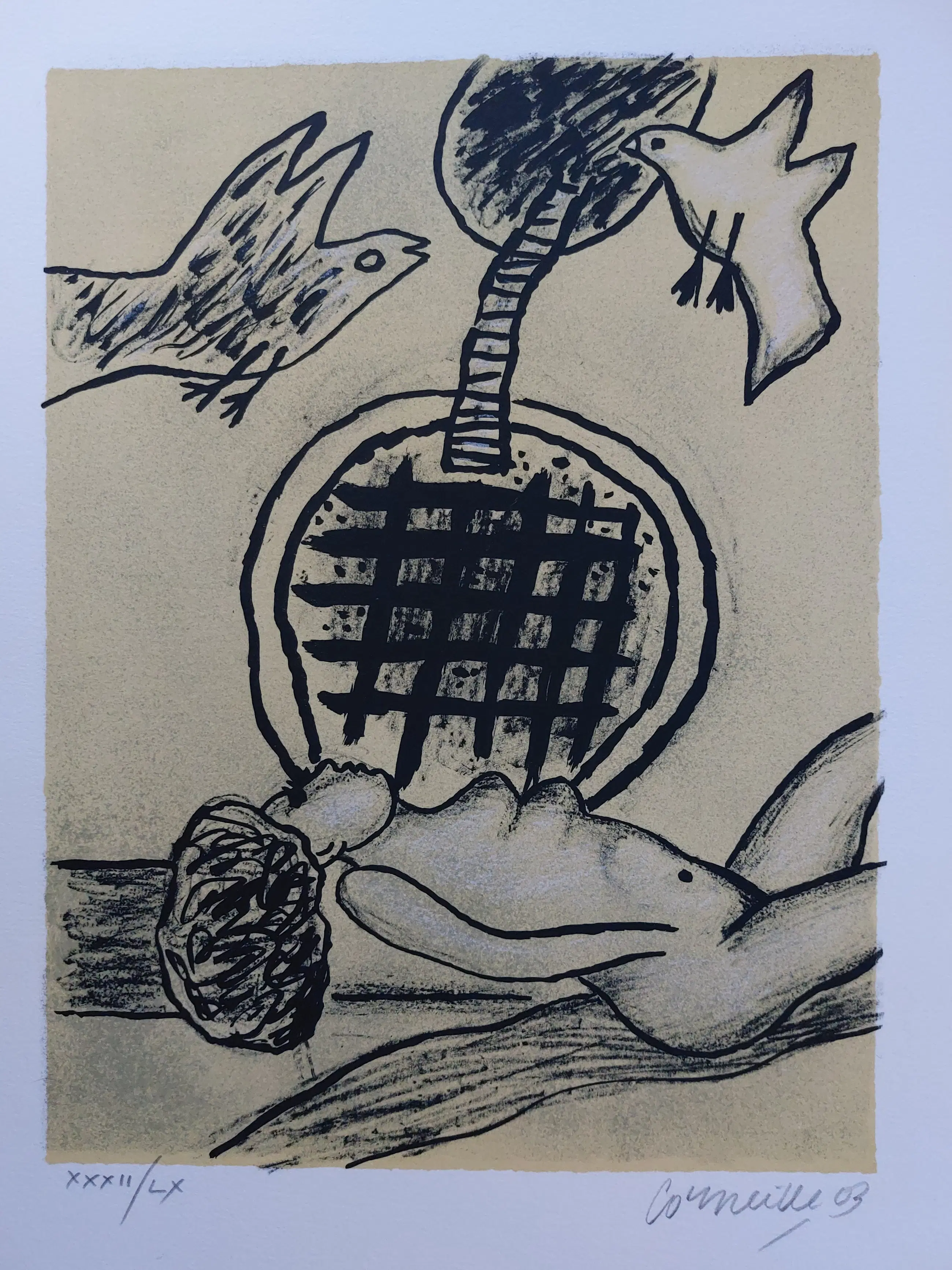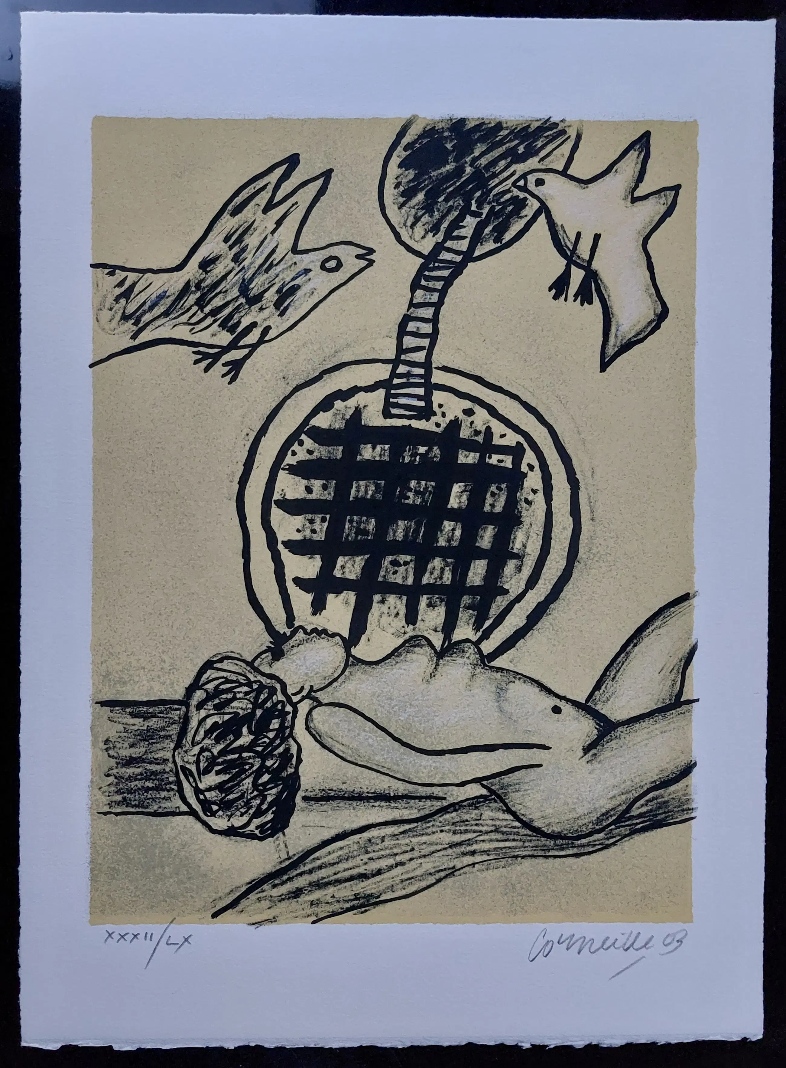 Schaarse lithografie van Cobra kunstenaar Corneille op stevig papier. Betreft nummer 32 uit een oplage van slechts 60 stuks. Op achterzijde stempel van Atelier Corneille.